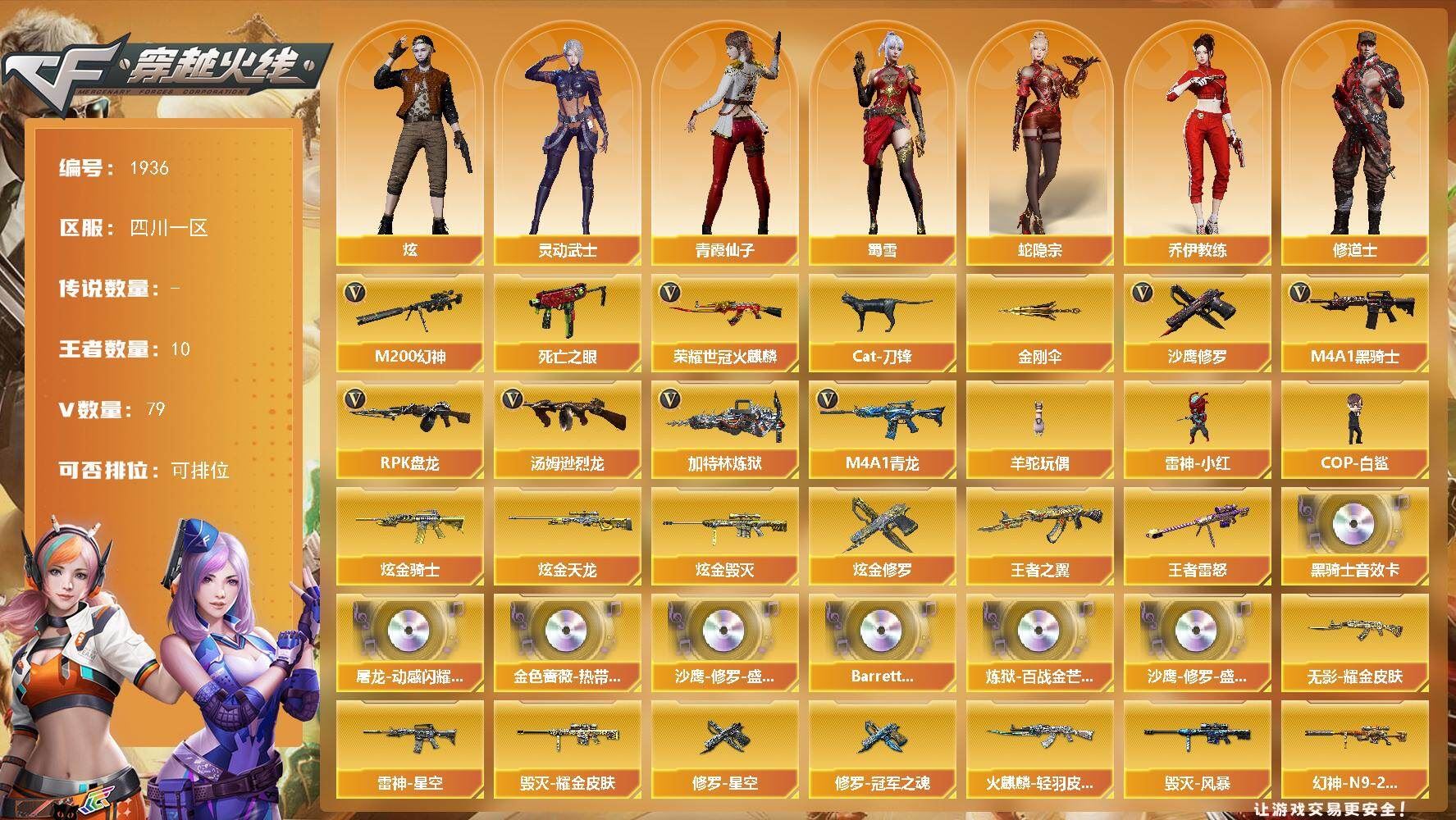 可二次可排位四川一区-79V【热门武器】:M4A1-青龙,M200-幻神,死亡之眼,荣耀世冠-火麒麟,Cat-刀锋,M4A1-黑骑士*3,汤姆逊-烈龙,RPK-盘龙*3,加特林-炼狱*2,羊驼玩偶,雷神-小红,COP-白鲨,沙鹰-修罗,金刚伞【王者炫金武器】:王者之翼,王者雷怒,炫金骑士,炫金毁灭,炫金天龙,炫金修罗【音效卡】:屠龙-动感闪耀 音效卡,QBZ03-金色蔷薇-热带奇洋音效卡,M4A1-黑骑士音效卡,沙鹰-修罗-盛典舞曲音效卡*2,Barrett-碧霄极光音效卡,炼狱-百战金芒-庆典舞曲音效卡【皮肤】:M200-幻神-N9-2022MVP,雷神-暗月,雷神-星空,雷神-源计划2.0专属 皮肤,M4A1-再燃火线,火麒麟-轻羽皮肤,火麒麟-平天大圣,毁灭耀金皮肤,毁灭-风暴*2,黑龙-能量核心,无影耀金皮肤,战神-粉色甜心皮肤,战神-紫绶金章皮肤,战神-流金岁月皮肤,AK47-B-常胜将军-曹操,AK47-B-常胜将军-刘备,AK47-B-常胜将军-孙权*2,极光-能量核心,修罗-能量核心,修罗-星空,修罗-冠军之魂,轻型军用手斧-再燃火线【角色】:炫,蛇隐宗,奇洋探员,乔伊教练,修道士,云海玲珑,暗夜-X,北极狐-X,初恋灵狐,电竞少女,芳心审判者,飞虎队-X,风暴女,嘉年华灵狐,娟娟,灵动武士,灵狐-花神,灵狐者-X,灵狐者-黄金海岸,龙儿,龙儿-小淘气,麻雀,潜龙队-X,青霞仙子,蛇姬,蜀雪,雪莉杨,樱-战斗天使,影武者-X,智影【人偶武器】:雷神-小红,COP-白鲨,天龙-曼陀罗,迷你宝贝*2,迷你钢铁终结者,迷你救赎猎手,迷你地狱终结者,AWM-灵狐-15周年嘉年华,Cat-刀锋,迷你深渊冰龙,迷你裂空之翼,迷你波特博士,夺魂,迷你牛牛,迷你生化手雷,生化手雷-机甲核心,深渊终结者手雷,闪光弹-小乔,闪光弹-貂蝉,高爆手雷-大乔,COP-青花瓷-斯沃特精英,迷你艾比,迷你超能女侍,迷你巨石泰坦-魔花研究所,灵狐娃娃手雷【暴走生化】:死亡之眼【挑战大师】:神圣爆裂者III,AK47-冰龙粉碎者,冰龙粉碎者-白马银枪*2,激光毁灭者III-白马银枪*2,激光毁灭者III,机甲撕裂者III,试炼破坏者III,KAC-圣炎切割者III,神圣爆裂者-末日III,阐释者III【英雄级武器】:AK47-火麒麟*2,M4A1-黑龙,M4A1-雷神*2,M4A1-黑骑士*3,AK47-无影,AK12-天启,AN94-超新星,AK47-黑鲨*2,M4A1-龙血,M4A1-青龙,黑武士-锦绣游龙,FAMAS G2-天戎,烈火-动感闪耀,王者之武-觉醒版,AK-47-猩红传说,AK47-B-战神,黑骑士-海王,AK47-B-常胜将军,荣耀世冠-火麒麟,AWM-天龙,Barrett-毁灭,M200-幻神,RPK-盘龙*3,加特林-炼狱*2,炼狱-百战金芒,炼狱-风暴,炼狱-悦蓝-觉醒版,汤姆逊-烈龙,AA-12-雷霆,沙鹰-修罗,沙鹰-天神*3,天神-动感闪耀,屠龙,擎天,麒麟刺,幻灵之锋*2,屠龙-动感闪耀,龙啸-热带奇洋,麒麟刺-百战金芒,王者之啸-觉醒版*2,王者之击-觉醒版,王者之刺-觉醒版,高爆手雷-幻灵*4,高爆手雷-竞技荣光,手雷-动感闪耀,手雷-热带奇洋,闪光弹-幻灵*3,闪光弹-竞技荣光,闪光弹-雷霆王者-觉醒版,烟雾弹-幻灵*4,烟雾弹-竞技荣光,烟雾弹-古蛇迷踪,M4A1-苍鸣雷神,Barrett-碧霄极光【道具】:BS战队炫彩背包,CFS限定背包,冰冰企鹅背包,奇洋探员-海龟背包,女皇终结者-背包,炫彩背包,百战金芒炫彩背包,超级背包*2,女皇终结者-魔龙之吻,黄金生化钩,绿色巨人,灵魂忍者,变异宝贝,迷雾幽灵*2,生化弹匣,夺命之镰,防化服*3,金色流光-枪王排位*2,星辰流光-枪王排位,巅峰赛先锋-金色流光,流光-鎏金之域,枪王排位28赛季金色流光,枪王排位29赛季金色流光,语音特效-盛典烟火,萌萌小葵表情,电玩兔兔表情,热带奇洋表情,动感闪耀表情,C4-沙漠,防弹头盔*4,防弹衣*5,C4工具钳*5,手雷包*5【特殊枪械】:3黑骑士,1烈龙,3盘龙,2炼狱,各种道具详情看截图、低价出售找回包 赔、截图展示段位不代 表实际段位,如赛季更新等不可抗拒因素发生变化、时限道具不保证所剩时间、标题未写送点劵默认不送【卖号买号首选亿梦】