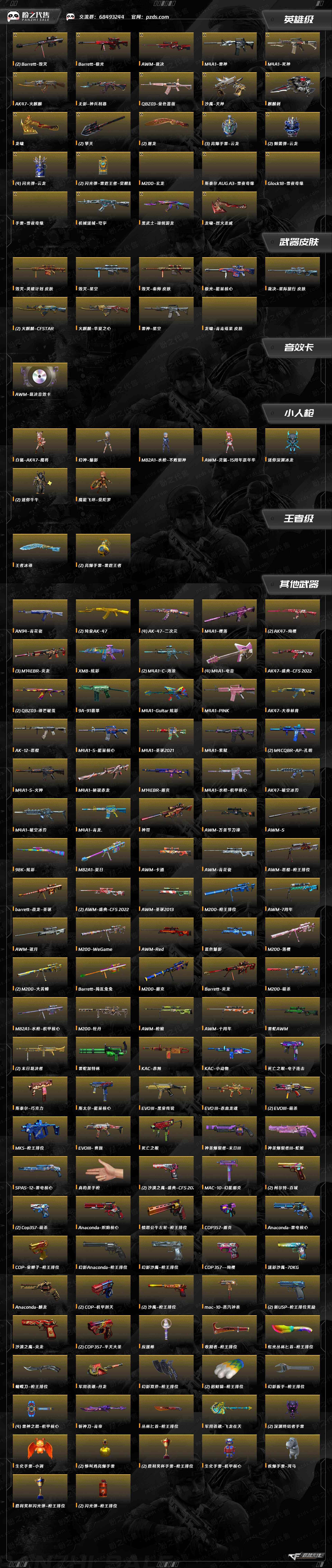 可排位 【账号状态】无封号 【区服】福建一区 【VIP】VIP6 【游戏等级】Lv.102 荣耀元帅 【段位排名】未上榜 【CF点】258 【VVIP数量】37 【重要套装】 【重要角色】传说影煞/_葵/_樱/龙儿-小淘气/铁扇公主/奇洋探员/铁骑荣耀 【传说武器】 【英雄武器】Barrett-毁灭(2)/Barrett-极光/AWM-裁决/M4A1-雷神/M4A1-死神/AK47-火麒麟/无影-神兵利器/QBZ03-金色蔷薇/沙鹰-天神/麒麟刺/龙啸/擎天(2)/屠龙(2)/高爆手雷-云龙(3)/烟雾弹-云龙(2)/闪光弹-云龙(4)/闪光弹-雷霆王者-觉醒版(2)/M200-玄龙/斯泰尔 AUG A3-雪夜奇缘/Glock18-雪夜奇缘/手雷-雪夜奇缘/机械迷城-穹宇/黑武士-锦绣游龙/龙啸-烈火龙威 【王者武器】王者冰锋/高爆手雷-雷霆王者(2) 【小人枪】白狐-AK47-魔将/幻神-魅影/M82A1-水枪-不败狙神/AWM-灵狐-15周年嘉年华/迷你深渊冰龙/迷你牛牛(2)/魔能飞环-曼陀罗 【其他重要武器】AN94-青花瓷/纯金AK-47(2)/AK-47-二次元(4)/M4A1-樱落/AK47-绚樱(2)/M14EBR-炎龙(3)/XM8-炫彩/M4A1-C-海浪(2)/M4A1-电音(4)/AK47-盛典-CFS 2022/QBZ03-锋芒破茧(2)/9A-91翡翠/M4A1-Guitar 炫彩/M4A1-PINK/AK47-大帝林肯/AK-12-恶棍/M4A1-S-能量核心/M4A1-圣诞2021/M4A1-紫狱/M4CQBR-AP-孔明(2)/M4A1-S-火种/M4A1-秘银赤龙/M14EBR-朋克/M4A1-水枪-机甲核心/AK47-破空冰刃/M4A1-破空冰刃/M4A1-青龙./神罚/AWM-万圣节刀锋/AWM-S/98K-炫彩/M82A1-夏日/AWM-卡通/AWM-青花瓷/AWM-恶棍-枪王排位/barrett-战龙-圣诞/AWM-盛典-CFS 2022(2)/AWM-圣诞2013/M200-枪王排位/AWM-7周年/AWM-银月/M200-WeGame/AWM-Red/蓝色魅影/M200-落樱/M200-大黄蜂(2)/Barrett-捣乱兔兔/M200-朋克/Barrett-炎龙/M200-萌杀/M82A1-水枪-机甲核心/M200-牡丹/AWM-枪娘/AWM-十周年/雷蛇AWM/末日裁决者(2)/雷蛇加特林/KAC-赤烛/KAC-小动物/死亡之眼-电子连击/斯泰尔-巧克力/斯太尔-能量核心/EVOⅢ-黑金传说/EVO III-赤血龙魂/EVOIII-萌杀(2)/MK5-枪王排位/EVOIII- 曹操/死亡之眼/神圣爆裂者-末日III/神圣爆裂者III-蛇姬/SPAS-12-雷电核心/真的是手枪/沙漠之鹰-盛典-CFS 2022(2)/MAC-10-幻能朋克/柯尔特-百城(2)/Cop357-萌杀(2)/Anaconda-炽焰核心/愤怒公牛左轮-枪王排位/COP357-朋克/Anaconda-雷电核心/COP-金蝉子-枪王排位/幻影Anaconda-枪王排位/幻影沙鹰-枪王排位/COP 357--绚樱/迷彩沙鹰-70KG/Anaconda-麟龙/COP-机甲刑天(2)/沙鹰-枪王排位(2)/mac-10-蒸汽钟表/新USP-枪王排位奖励(2)/沙漠之鹰-炎龙/COP 357-平天大圣(2)/应援棒/收割者-枪王排位/虹光丛林匕首-枪王排位/蝴蝶刀-枪王排位/军用铁锹-丹龙/幻影双