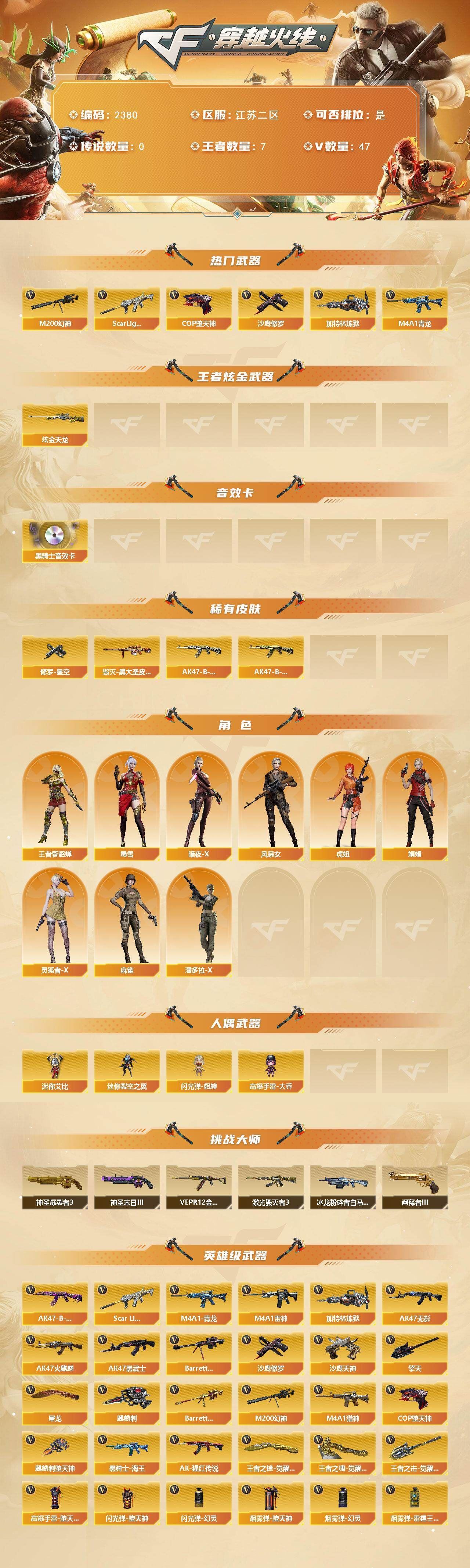可二次江苏二区可排位-47V-7王者武器数-1炫金武器数【热门武器】:Scar Light-白虎,M4A1-青龙*2,M200-幻神,加特林-炼狱,COP-堕天神,沙鹰-修罗【王者炫金武器】:炫金天龙【音效卡】:M4A1-黑骑士音效卡【皮肤】:毁灭-黑大圣皮肤,AK47-B-常胜将军-刘备,AK47-B-常胜将军-孙权,修罗-星空【角色】:四防王者-葵-貂蝉,暗夜-X,风暴女,虎妞,娟娟,灵狐者-X,麻雀,潘多拉-X,蜀雪【人偶武器】:迷你裂空之翼,闪光弹-貂蝉,高爆手雷-大乔,迷你艾比【挑战大师】:神圣爆裂者III,冰龙粉碎者-白马银枪*2,VEPR-12-金魔,激光毁灭者III,神圣爆裂者-末日III,阐释者III【英雄级武器】:AK47-火麒麟,M4A1-雷神*3,AK47-无影,AK47-黑武士,M4A1-青龙*2,Scar Light-白虎,M4A1-猎神,AK-47-猩红传说,黑骑士-海王*2,AK47-B-常胜将军,Barrett-毁灭,M200-幻神,Barrett-朱雀,加特林-炼狱,沙鹰-修罗,沙鹰-天神*4,COP-堕天神,屠龙*3,麒麟刺-堕天神,擎天,麒麟刺,王者之锋-觉醒版*2,王者之啸-觉醒版,王者之击-觉醒版*3,高爆手雷-堕天神,闪光弹-堕天神,闪光弹-幻灵,烟雾弹-堕天神,烟雾弹-幻灵*5,烟雾弹-雷霆王者-觉醒版【道具】:炫彩背包,超级背包,生化弹匣,夺命之镰,防化服,EP战队名片,防弹头盔*4,防弹衣*4,C4工具钳*4,手雷包*5【特殊枪械】:1白虎,1炼狱,各种道具详情看截图、低价出售找回包 赔、截图展示段位不代 表实际段位,如赛季更新等不可抗拒因素发生变化、时限道具不保证所剩时间、标题未写送点劵默认不送【卖号买号首选亿梦】