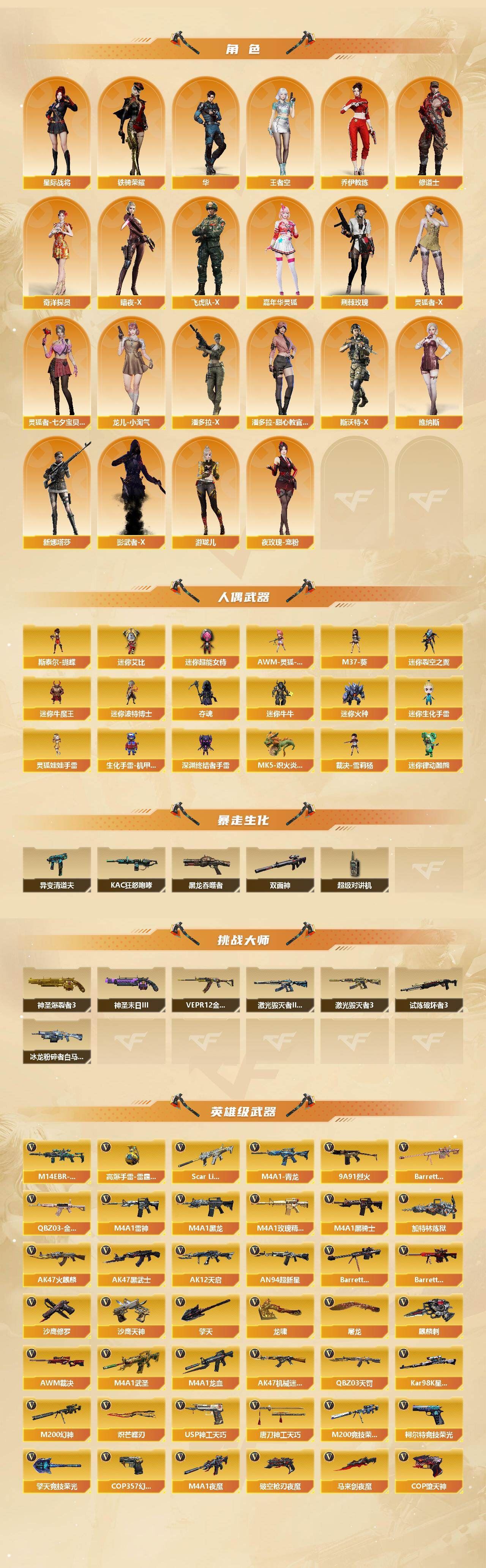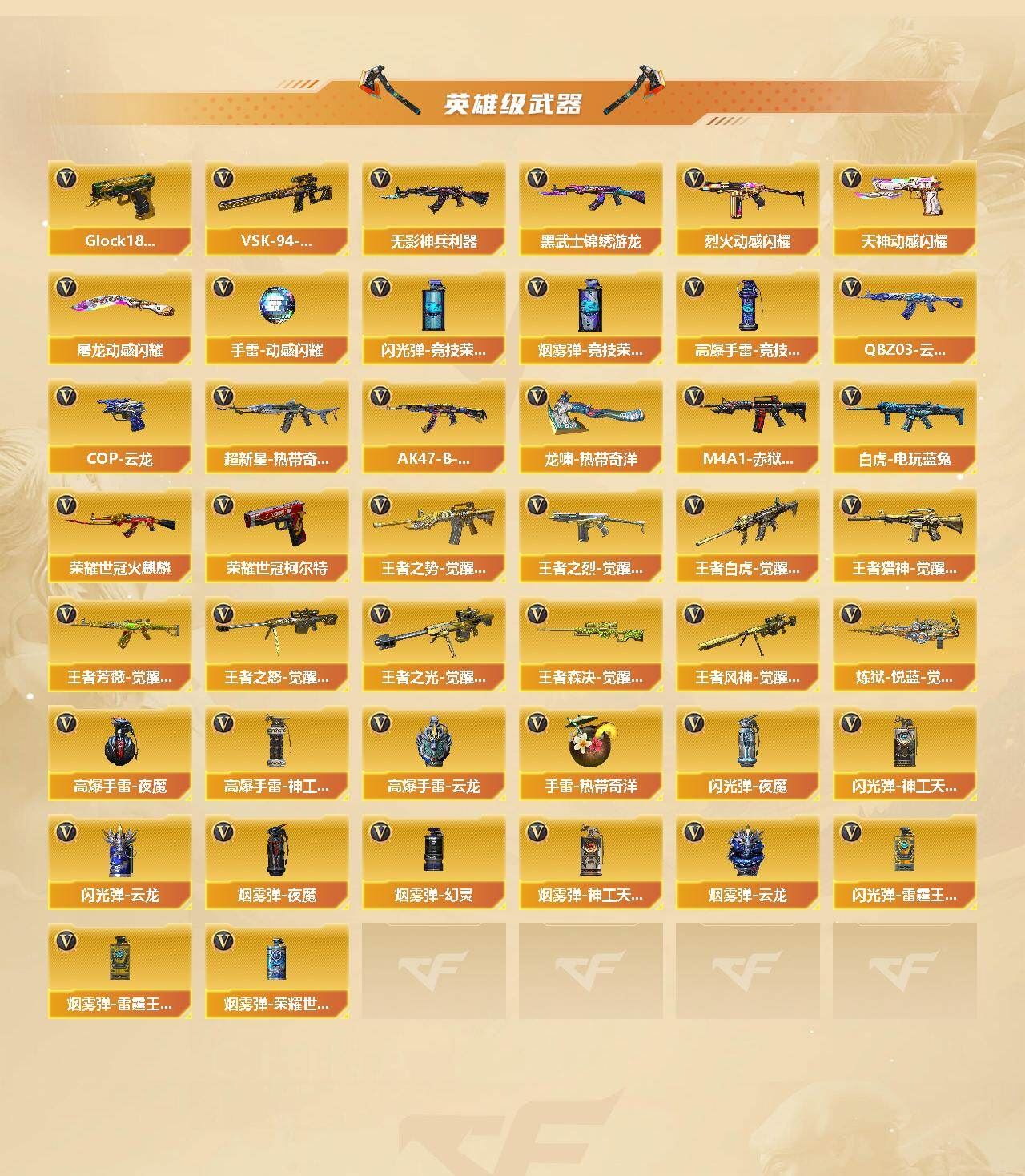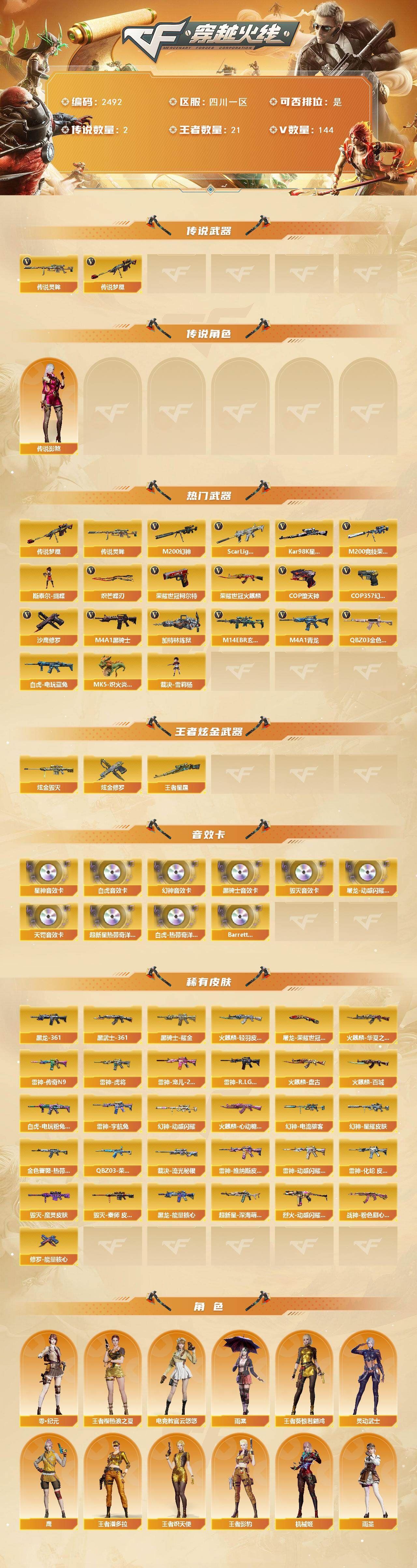 可二次可排位 四川一区-144V-21王者武器数-2炫金武器数【传说武器】:传说梦魇,传说灵眸【传说角色】:传说影煞【热门武器】:传说梦魇,传说灵眸,QBZ03-金色蔷薇,M14EBR-玄武,Scar Light-白虎*2,M4A1-青龙,M200-幻神,M200-竞技荣光,荣耀世冠-火麒麟,白虎-电玩蓝兔,荣耀世冠-柯尔特,Kar98K-星神,M4A1-黑骑士,加特林-炼狱*4,斯泰尔-蝴蝶,MK5-炽火炎龙,裁决-雪莉杨,COP-堕天神,COP 357-幻灵,沙鹰-修罗,炽芒蝶刃*2【王者炫金武器】:王者星霆,炫金毁灭,炫金修罗【音效卡】:屠龙-动感闪耀 音效卡,AN94-超新星-热带奇洋音效卡,Scar Light-白虎-热带奇洋音效卡,M200-幻神音效卡,M4A1-黑骑士音效卡,Barrett-毁灭音效卡,Scar Light-白虎音效卡,Kar98K-星神音效卡,QBZ03-天罚音效卡,Barrett-碧霄极光音效卡【皮肤】:幻神-星耀 皮肤,幻神-动感闪耀 皮肤,幻神-电流骇客 皮肤,白虎-电玩粉兔皮肤,金色蔷薇-热带奇洋 皮肤,QBZ03-荣耀世冠EP 皮肤,裁决-流光秘银,雷神-虎将,雷神-传奇N9,雷神-宠儿-2019MVP,雷神-R.LGD-CFPLS18冠军,雷神-宇航兔皮肤,雷神-维纳斯皮肤,雷神-动感闪耀 皮肤,雷神-化蛇 皮肤,火麒麟-华夏之心,火麒麟-轻羽皮肤,火麒麟-盘古,火麒麟-百城,火麒麟-心动糖果,毁灭-魔灵皮肤,毁灭-秦师 皮肤,黑龙-能量核心,M4A1-黑龙-361,黑骑士耀金皮肤,AK47-黑武士-361,超新星-深海萌鲨 皮肤,烈火-动感闪耀 皮肤,战神-粉色甜心皮肤*3,修罗-能量核心,屠龙-荣耀世冠AG【角色】:雨棠,电竞教官-云悠悠,鹰,星际战将,雨墨,机械姬,华,零·纪元,王者樱-热浪之夏,王者葵-惊若翩鸿,王者影豹,王者潘多拉,王者炽天使,王者空,奇洋探员,乔伊教练,修道士,暗夜-X,飞虎队-X,嘉年华灵狐,荆棘玫瑰,灵动武士,灵狐者-X,灵狐者-七夕宝贝,龙儿-小淘气,潘多拉-X,潘多拉-甜心教官,斯沃特-X,铁骑荣耀,维纳斯,新娜塔莎,夜玫瑰-宠粉,影武者-X,游珑儿【人偶武器】:裁决-雪莉杨,MK5-炽火炎龙,迷你律动酷熊,斯泰尔-蝴蝶,AWM-灵狐-15周年嘉年华,M37-葵,迷你裂空之翼*4,迷你牛魔王,迷你波特博士*5,夺魂*3,迷你牛牛,迷你火种,迷你生化手雷*2,生化手雷-机甲核心*2,深渊终结者手雷*2,迷你艾比,迷你超能女侍,灵狐娃娃手雷【暴走生化】:异变清道夫,KAC-狂怒咆哮,黑龙吞噬者,双面神,超级对讲机【挑战大师】:神圣爆裂者III,冰龙粉碎者-白马银枪*3,激光毁灭者III-白马银枪*3,VEPR-12-金魔,激光毁灭者III,试炼破坏者III,神圣爆裂者-末日III【英雄级武器】:AK47-火麒麟,M4A1-黑龙,M4A1-雷神,M4A1-黑骑士,AK47-黑武士,AK12-天启,AN94-超新星,M4A1-武圣,AK47-机械迷城,M4A1-龙血,M4A1-青龙,Scar Light-白虎*2,M4A1-夜魔,M14EBR-玄武,QBZ03-天罚,无影-神兵利器,QBZ03-云龙,黑武士-锦绣游龙,超新星-热带奇洋,M4A1-玫瑰精灵,QBZ03-金色蔷薇,9A91-烈火,烈火-动感闪耀,王者之势-觉醒版,AK47-B-战神*2,王者之烈-觉醒版,王者白虎-觉醒版,白虎-电玩蓝兔,王者猎神-觉醒版,王者芳薇-觉醒版,荣耀世冠-火麒麟,Barrett-毁灭,Barrett-极光,AWM-裁决,M200-幻神,Kar98K-星神,M200-竞技荣光,VSK-94-金蚀,Barrett-金色蔷薇,王者之怒-觉醒版,王者之光-觉醒版,王者森决-觉醒版,王者风神-觉醒版,加特林-炼狱*4,炼狱-悦蓝-觉醒版,沙鹰-修罗,沙鹰-天神,COP-堕天神,COP 357-幻灵,荣耀世冠-柯尔特,柯尔特-竞技荣光,破空枪刃-夜魔,COP 357-云龙*2,USP-神工天巧,Glock18-武圣,天神-动感闪耀,屠龙*2,龙啸,马来剑-夜魔,擎天,麒麟刺,擎天-竞技荣光*2,炽芒蝶刃*2,唐刀-神工天巧,屠龙-动感闪耀,龙啸-热带奇洋,高爆手雷-夜魔*5,高爆手雷-竞技荣光*7,高爆手雷-神工天巧,手雷-动感闪耀,高爆手雷-云龙*2,手雷-热带奇洋,高爆手雷-雷霆王者-觉醒版*6,闪光弹-夜魔*5,闪光弹-竞技荣光*7,闪光弹-神工天巧,闪光弹-云龙*5,闪光弹-雷霆王者-觉醒版*3,烟雾弹-夜魔*5,烟雾弹-幻灵,烟雾弹-竞技荣光*8,烟雾弹-神工天巧,烟雾弹-云龙*4,烟雾弹-雷霆王者-觉醒版,烟雾弹-荣耀世冠EP,