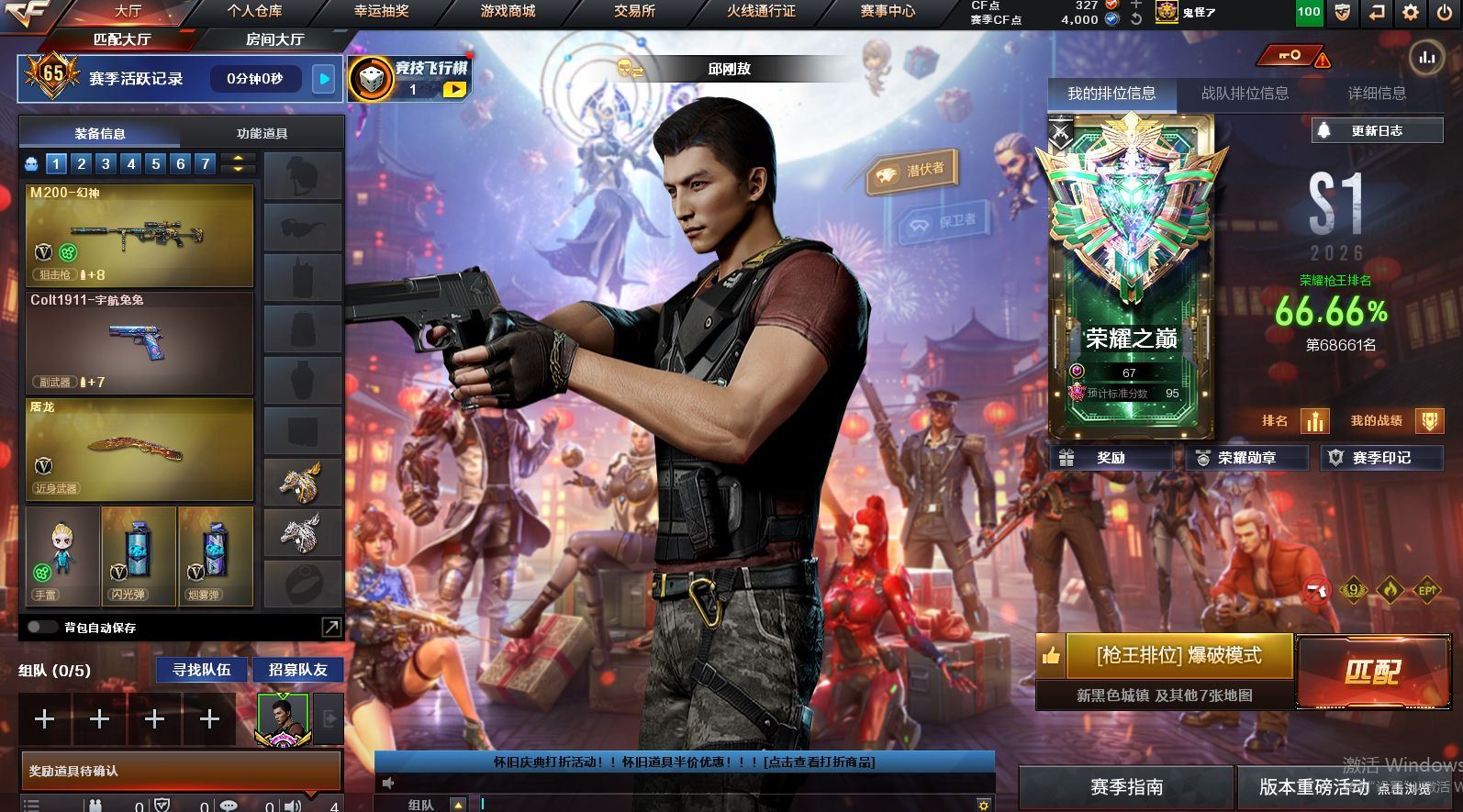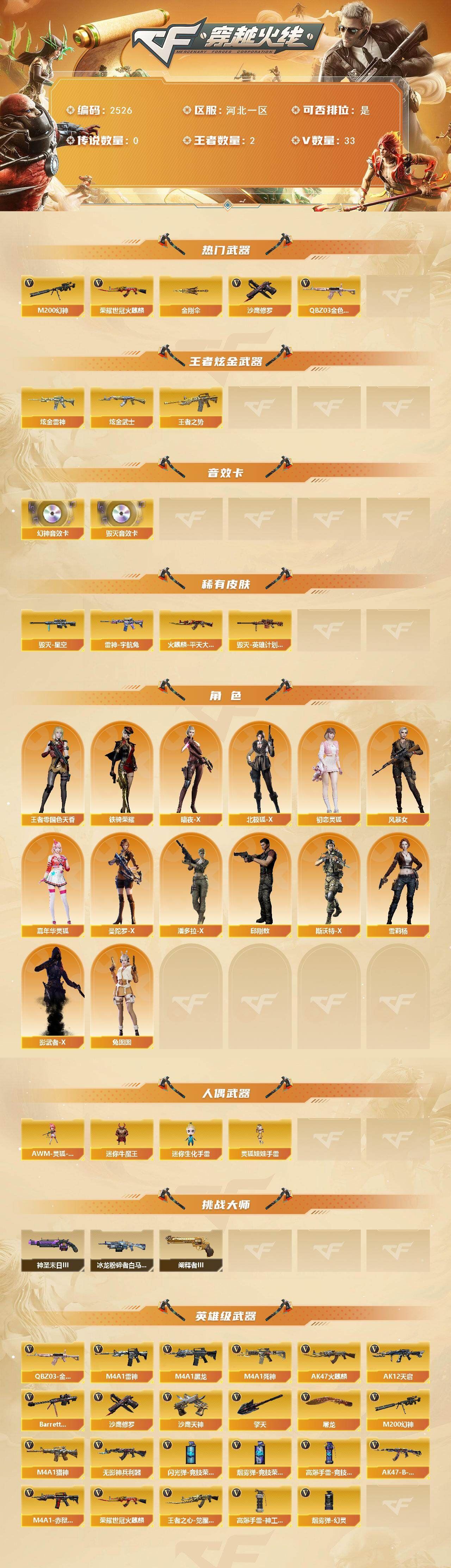 可二次可排位 河北一区-33V-2王者武器数-2炫金武器数【热门武器】:QBZ03-金色蔷薇,M200-幻神,荣耀世冠-火麒麟,沙鹰-修罗,金刚伞【王者炫金武器】:王者之势,炫金雷神,炫金武士【音效卡】:M200-幻神音效卡,Barrett-毁灭音效卡【皮肤】:雷神-宇航兔皮肤,火麒麟-平天大圣,毁灭-星空,毁灭-英雄计划 皮肤【角色】:4防王者-零-国色天香,暗夜-X,北极狐-X,初恋灵狐,风暴女,嘉年华灵狐,曼陀罗-X,潘多拉-X,邱刚敖,斯沃特-X,铁骑荣耀,兔囡囡,雪莉杨,影武者-X【人偶武器】:AWM-灵狐-15周年嘉年华,迷你牛魔王,迷你生化手雷,灵狐娃娃手雷【挑战大师】:冰龙粉碎者-白马银枪*2,神圣爆裂者-末日III,阐释者III【英雄级武器】:AK47-火麒麟,M4A1-黑龙,M4A1-雷神,M4A1-死神,AK12-天启,无影-神兵利器,QBZ03-金色蔷薇,M4A1-猎神,王者之心-觉醒版,AK47-B-战神,荣耀世冠-火麒麟,Barrett-毁灭,M200-幻神,沙鹰-修罗,沙鹰-天神*5,屠龙*5,擎天,高爆手雷-竞技荣光,高爆手雷-神工天巧,闪光弹-竞技荣光,烟雾弹-幻灵,烟雾弹-竞技荣光*2,M4A1-赤狱骑士【道具】:XROCK炫彩背包,亚洲杯纪念炫彩背包,全能枪王背包,超级背包,女皇终结者-魔龙之吻,救世主-黑桃战神,绿色巨人,灵魂忍者,迷雾幽灵,夺命之镰,防化服*2,金色流光-枪王排位*2,星辰流光-枪王排位,巅峰赛先锋-金色流光,枪王排位28赛季金色流光,枪王排位29赛季金色流光,EP战队名片,防弹头盔*5,防弹衣*5,C4工具钳*3,手雷包*4,各种道具详情看截图、低价出售找回包 赔、截图展示段位不代 表实际段位,如赛季更新等不可抗拒因素发生变化、时限道具不保证所剩时间、标题未写送点劵默认不送【卖号买号首选亿梦】