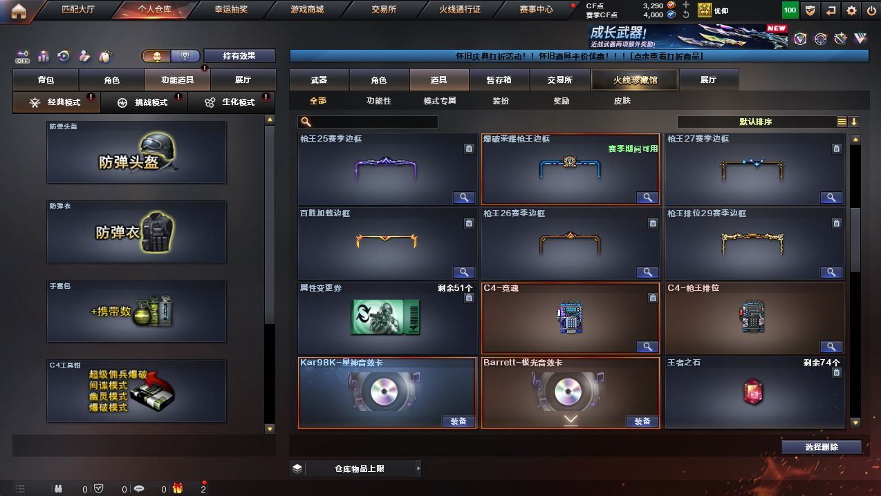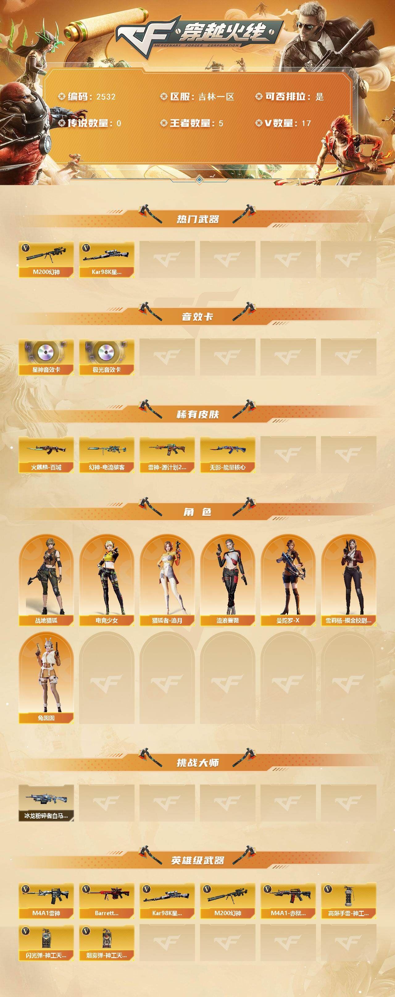 可二次可排位吉林一区-17V-5王者武器数【热门武器】:M200-幻神,Kar98K-星神【音效卡】:Barrett-极光音效卡,Kar98K-星神音效卡【皮肤】:幻神-电流骇客 皮肤,雷神-源计划2.0专属 皮肤,火麒麟-百城,无影-能量核心【角色】:战地猎狐,电竞少女,猎狐者-追月,流浪蔷薇,曼陀罗-X,兔囡囡,雪莉杨-摸金校尉【挑战大师】:冰龙粉碎者-白马银枪【英雄级武器】:M4A1-雷神,Barrett-极光,M200-幻神,Kar98K-星神,高爆手雷-神工天巧*2,闪光弹-神工天巧*2,烟雾弹-神工天巧*2,M4A1-赤狱骑士【道具】:云山科技背包,救世主-黑桃战神,绿色巨人,灵魂忍者,迷雾幽灵,夺命之镰,防化服*3,金色流光-枪王排位*2,星辰流光-枪王排位,流光-再燃火线,枪王排位29赛季金色流光,防弹头盔*3,防弹衣*3,C4工具钳*3,手雷包*3,各种道具详情看截图、低价出售找回包 赔、截图展示段位不代 表实际段位,如赛季更新等不可抗拒因素发生变化、时限道具不保证所剩时间、标题未写送点劵默认不送【卖号买号首选亿梦】