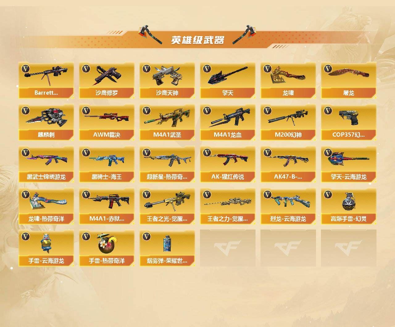 可二次可排位 陕西一区-59V-3王者武器数-3炫金武器数【热门武器】:QBZ03-金色蔷薇,M14EBR-玄武,M200-幻神,死亡之眼,M4A1-黑骑士,汤姆逊-烈龙,加特林-炼狱,COP 357-幻灵,沙鹰-修罗*3【王者炫金武器】:王者之幻,炫金黑龙,炫金雷神,炫金毁灭【音效卡】:M200-幻神音效卡,M4A1-雷神音效卡,Barrett-毁灭音效卡,AWM-昌龙-怀旧音效卡*3【皮肤】:幻神-冠军之幻,幻神-荣耀世冠EP 皮肤,AWM-裁决-凤灵皮肤,雷神-暗月,雷神-耀金皮肤,雷神-维纳斯皮肤,M4A1-雷神-巅峰荣耀皮肤,火麒麟-平天大圣,火麒麟-百城,毁灭耀金皮肤,毁灭-航天科技皮肤,毁灭-英雄计划 皮肤,黑骑士-AG-S4冠军典藏,战神-粉色甜心皮肤,战神-紫绶金章皮肤*4,战神-流金岁月皮肤,天龙-能量核心,屠龙-春桃 皮肤【角色】:零,4防司雨,战地猎狐,奇洋探员,云海玲珑,空,暗夜-X,初恋灵狐,电竞少女,风暴女,兰-海滩派对,猎狐者-追月,零-水下丽影,灵狐-花神,灵狐者-X,灵狐者-黄金海岸,灵狐者-七夕宝贝,玫瑰花神,潘多拉-甜心教官,潜龙队-X,青霞仙子,蜀雪,兔囡囡,维纳斯,夜玫瑰-幻能朋克,樱-战斗天使,影武者-X,幽,4防暗夜审判【人偶武器】:迷你宝贝,闪光弹-小乔【暴走生化】:死亡之眼,超级对讲机【挑战大师】:激光毁灭者III-白马银枪【英雄级武器】:AK47-火麒麟,M4A1-黑龙*2,M4A1-雷神,M4A1-黑骑士,AK47-无影*2,M4A1-死神,AN94-超新星,M4A1-武圣*2,M4A1-龙血,M14EBR-玄武,黑武士-锦绣游龙,超新星-热带奇洋,QBZ03-金色蔷薇,AK-47-猩红传说*6,AK47-B-战神,黑骑士-海王,AWM-天龙,Barrett-毁灭*2,AWM-裁决,M200-幻神,王者之光-觉醒版,王者之力-觉醒版,加特林-炼狱,汤姆逊-烈龙,烈龙-云海游龙,沙鹰-修罗*3,沙鹰-天神,COP 357-幻灵,屠龙*2,龙啸*4,擎天*2,麒麟刺*2,擎天-云海游龙,龙啸-热带奇洋,高爆手雷-幻灵,手雷-云海游龙,手雷-热带奇洋,烟雾弹-荣耀世冠EP*2,M4A1-赤狱骑士【道具】:EP战队炫彩背包,云海游龙炫彩背包,亚洲杯纪念炫彩背包,奇洋探员-海龟背包,战舰背包,炫彩背包,热带奇洋炫彩背包,超级背包,女皇终结者-魔龙之吻,救世主-黑桃战神,绿色巨人,灵魂忍者*2,变异宝贝,迷雾幽灵*2,夺命之镰,防化服*2,金色流光-枪王排位*2,星辰流光-枪王排位,流光-再燃火线,枪王排位28赛季金色流光,枪王排位29赛季金色流光,热带奇洋表情,云海游龙表情,C4-沙漠,防弹头盔*5,防弹衣*4,C4工具钳*3,手雷包*2【特殊枪械】:1黑骑士,1烈龙,1炼狱,各种道具详情看截图、低价出售找回包 赔、截图展示段位不代 表实际段位,如赛季更新等不可抗拒因素发生变化、时限道具不保证所剩时间、标题未写送点劵默认不送【卖号买号首选亿梦】