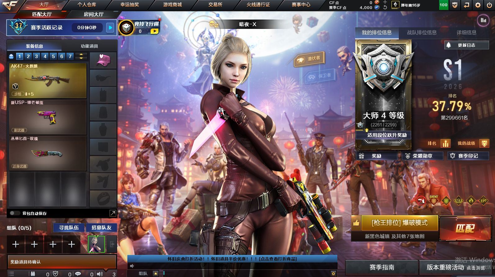 可二次可排位 陕西一区-5V-0王者武器数-0炫金武器数【角色】:暗夜-X,风暴女,娟娟,青霞仙子,斯沃特-X【英雄级武器】:AK47-火麒麟,无影-神兵利器,黑武士-锦绣游龙【道具】:超级背包,夺命之镰,防化服,枪王排位28赛季金色流光,防弹头盔*5,防弹衣*5,C4工具钳*5,手雷包*5, 各种道具详情看截图、低价出售找回包 赔、截图展示段位不代 表实际段位,如赛季更新等不可抗拒因素发生变化、时限道具不保证所剩时间、标题未写送点劵默认不送【卖号买号首选亿梦】