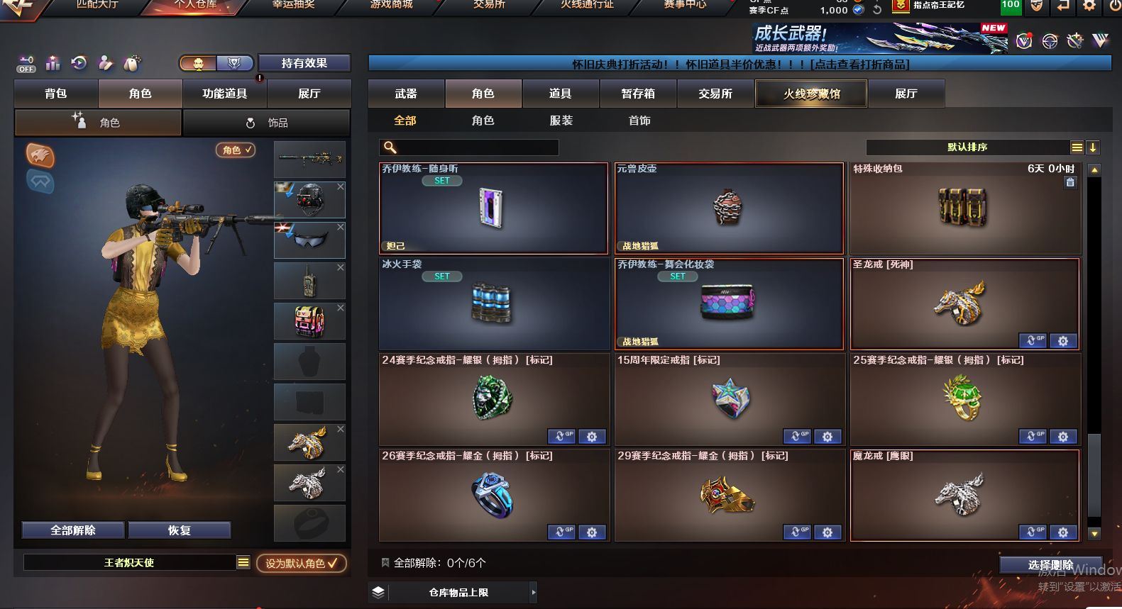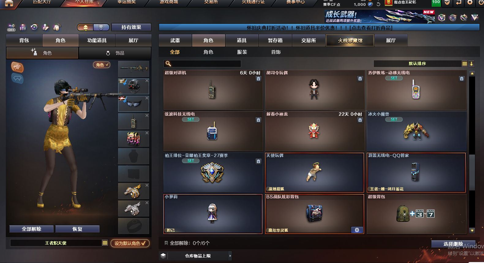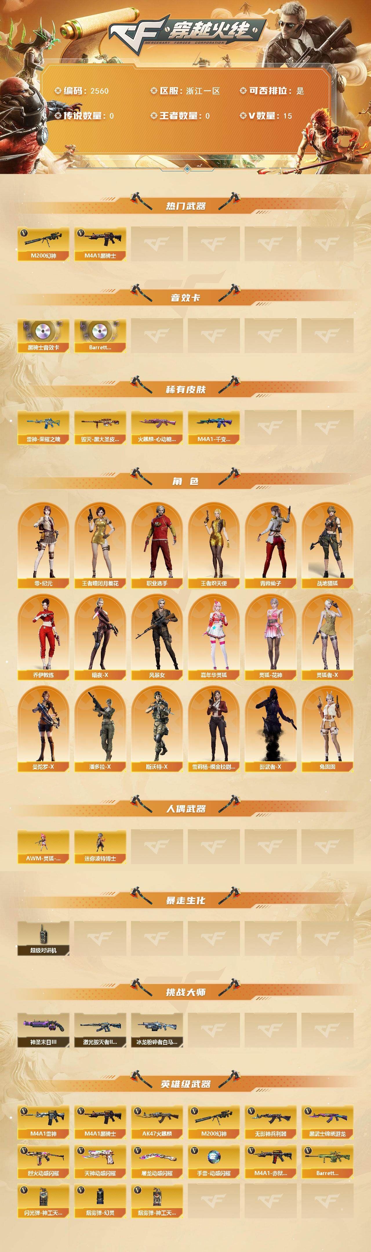 可二次可排位 浙江一区-15V-0王者武器数-0炫金武器数【热门武器】:M200-幻神,M4A1-黑骑士【音效卡】:M4A1-黑骑士音效卡,Barrett-碧霄极光音效卡【皮肤】:雷神-荣耀之魄,火麒麟-心动糖果,毁灭-黑大圣皮肤,M4A1-千变-孔明皮肤【角色】:零·纪元,战地猎狐,王者-瞳-闭月羞花,王者炽天使,乔伊教练,暗夜-X,风暴女,嘉年华灵狐,灵狐-花神,灵狐者-X,曼陀罗-X,潘多拉-X,青霞仙子,斯沃特-X,兔囡囡,雪莉杨-摸金校尉,影武者-X,职业选手【人偶武器】:AWM-灵狐-15周年嘉年华,迷你波特博士【暴走生化】:超级对讲机【挑战大师】:冰龙粉碎者-白马银枪,激光毁灭者III-白马银枪,神圣爆裂者-末日III【英雄级武器】:AK47-火麒麟,M4A1-雷神,M4A1-黑骑士,无影-神兵利器,黑武士-锦绣游龙,烈火-动感闪耀,机械迷城-穹宇,M200-幻神,天神-动感闪耀,屠龙-动感闪耀,手雷-动感闪耀,闪光弹-神工天巧,烟雾弹-幻灵,烟雾弹-神工天巧,M4A1-赤狱骑士,Barrett-碧霄极光【道具】:BS战队炫彩背包,云山科技背包,全能枪王背包,炫彩背包,热带奇洋炫彩背包,超级背包,女皇终结者-魔龙之吻,救世主-黑桃战神,绿色巨人,灵魂忍者*2,变异宝贝,迷雾幽灵*2,生化弹匣,夺命之镰,防化服*3,金色流光-枪王排位*2,星辰流光-枪王排位,流光-再燃火线,枪王排位28赛季金色流光,枪王排位29赛季金色流光,炽雪表情,动感闪耀表情,C4-黑曜,防弹头盔*3,防弹衣*3,C4工具钳*3,手雷包*3【特殊枪械】:1黑骑士 各种道具详情看截图、低价出售找回包 赔、截图展示段位不代 表实际段位,如赛季更新等不可抗拒因素发生变化、时限道具不保证所剩时间、标题未写送点劵默认不送【卖号买号首选亿梦】