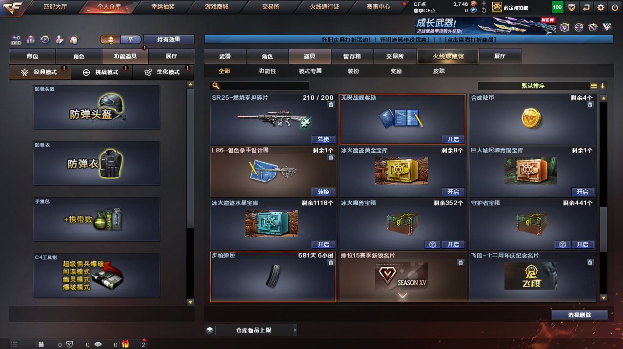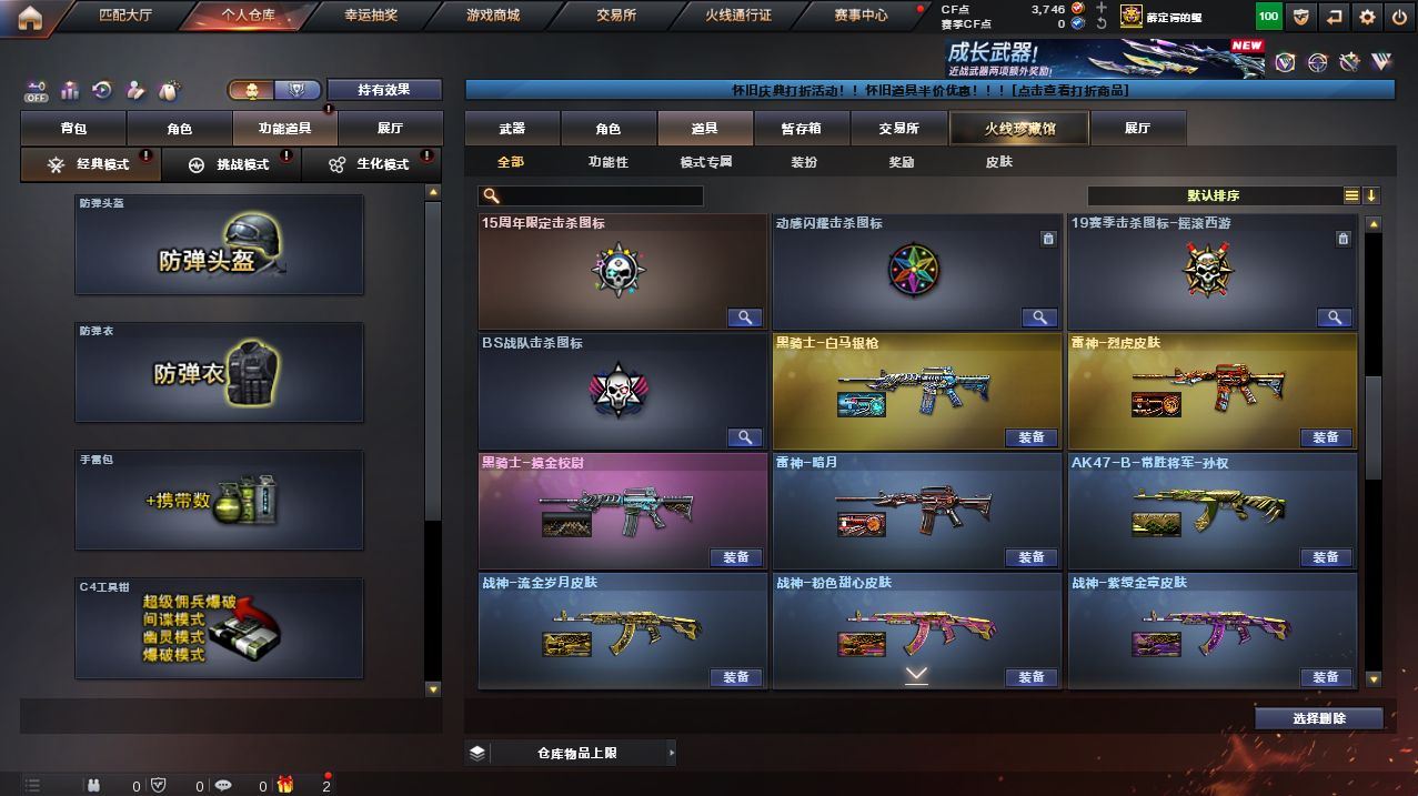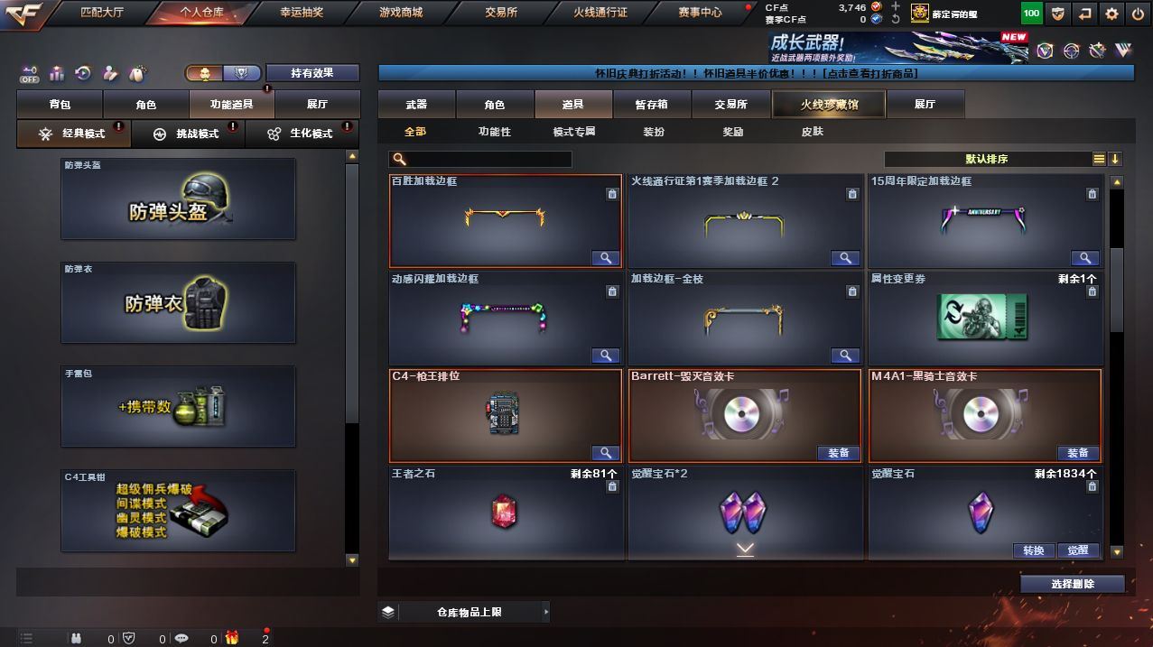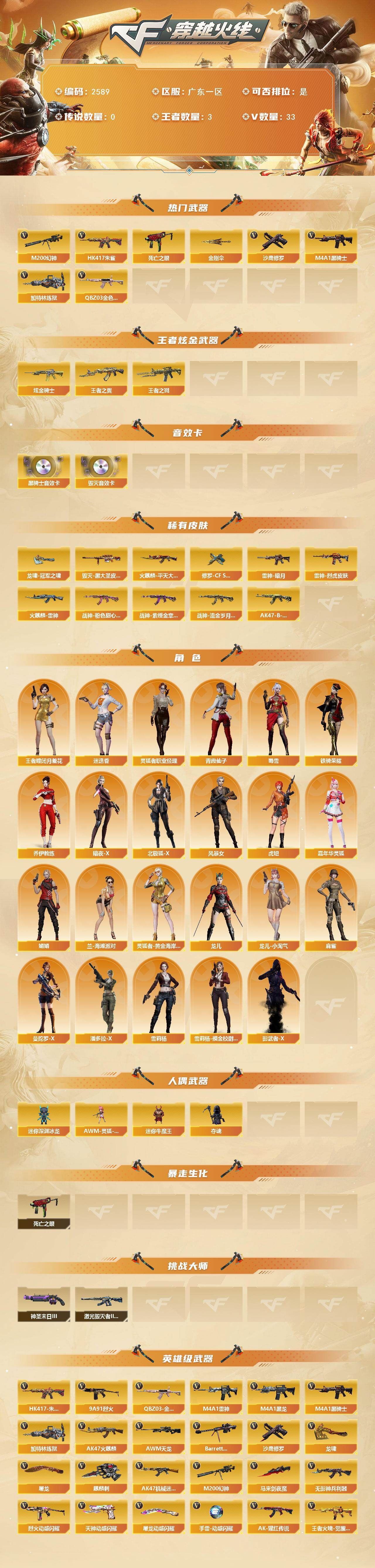 可二次可排位广东一区-33V-3王者武器数-1炫金武器数【热门武器】:QBZ03-金色蔷薇,HK417-朱雀,M200-幻神,死亡之眼,M4A1-黑骑士,加特林-炼狱,沙鹰-修罗*2,金刚伞【王者炫金武器】:王者之戮,王者之翼,炫金骑士【音效卡】:M4A1-黑骑士音效卡,Barrett-毁灭音效卡【皮肤】:雷神-暗月,雷神-烈虎皮肤,火麒麟-雷神,火麒麟-平天大圣,毁灭-黑大圣皮肤,战神-粉色甜心皮肤,战神-紫绶金章皮肤,战神-流金岁月皮肤,AK47-B-常胜将军-孙权,修罗-CF STAR,龙啸-冠军之啸【角色】:迷迭香,王者-瞳-闭月羞花,乔伊教练,暗夜-X,北极狐-X,风暴女,虎妞,嘉年华灵狐,娟娟,兰-海滩派对,灵狐者-黄金海岸,四防灵狐者-职业经理,龙儿,龙儿-小淘气,麻雀,曼陀罗-X,潘多拉-X,青霞仙子,蜀雪,铁骑荣耀,雪莉杨,雪莉杨-摸金校尉,影武者-X【人偶武器】:AWM-灵狐-15周年嘉年华,迷你深渊冰龙,迷你牛魔王,夺魂【暴走生化】:死亡之眼【挑战大师】:激光毁灭者III-白马银枪*2,神圣爆裂者-末日III【英雄级武器】:AK47-火麒麟,M4A1-黑龙,M4A1-雷神,M4A1-黑骑士,AK47-机械迷城,HK417-朱雀,无影-神兵利器,QBZ03-金色蔷薇,9A91-烈火,烈火-动感闪耀,AK-47-猩红传说,王者火魄-觉醒版,AWM-天龙,Barrett-毁灭,M200-幻神,加特林-炼狱,沙鹰-修罗*2,天神-动感闪耀,屠龙,龙啸,马来剑-夜魔,麒麟刺,屠龙-动感闪耀,高爆手雷-夜魔,手雷-动感闪耀,闪光弹-夜魔,烟雾弹-夜魔,烟雾弹-幻灵【道具】:老虎背包,背包-洛丽塔,虎牙炫彩背包,超级背包,绿色巨人,灵魂忍者,迷雾幽灵,夺命之镰,防化服*2,动感闪耀表情,防弹头盔*3,防弹衣*3,C4工具钳*4,手雷包*4,各种道具详情看截图、低价出售找回包 赔、截图展示段位不代 表实际段位,如赛季更新等不可抗拒因素发生变化、时限道具不保证所剩时间、标题未写送点劵默认不送【卖号买号首选亿梦】