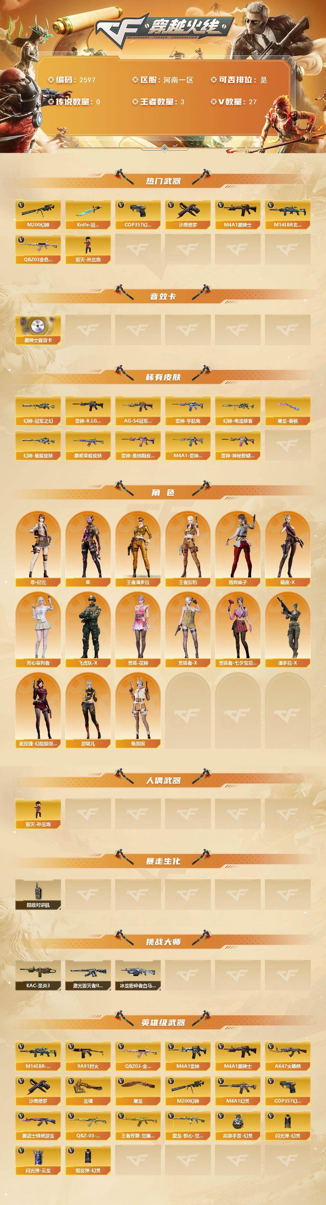 可二次可排位 河南一区-27V-2王者武器数-0炫金武器数【热门武器】:QBZ03-金色蔷薇,M14EBR-玄武,M200-幻神,M4A1-黑骑士,毁灭-孙三炮,COP 357-幻灵,沙鹰-修罗,Knife-冠军之刃【音效卡】:M4A1-黑骑士音效卡【皮肤】:幻神-冠军之幻,幻神-星耀 皮肤,幻神-电流骇客 皮肤,QBZ03-巅峰荣耀皮肤,雷神-R.LGD-CFPLS18冠军,雷神-宇航兔皮肤,雷神-维纳斯皮肤,M4A1-雷神-巅峰荣耀皮肤,雷神-神秘按键 皮肤,黑骑士-AG-S4冠军典藏,屠龙-春桃 皮肤【角色】:隼,零·纪元,4防王者影豹,4防王者潘多拉,暗夜-X,芳心审判者,飞虎队-X,灵狐-花神,灵狐者-X,灵狐者-七夕宝贝,潘多拉-X,青霞仙子,兔囡囡,夜玫瑰-幻能朋克,游珑儿【人偶武器】:毁灭-孙三炮【暴走生化】:超级对讲机【挑战大师】:冰龙粉碎者-白马银枪*2,激光毁灭者III-白马银枪,KAC-圣炎切割者III【英雄级武器】:AK47-火麒麟,M4A1-雷神*2,M4A1-黑骑士,M4A1-幻灵,M14EBR-玄武,黑武士-锦绣游龙,QBZ03-金色蔷薇,9A91-烈火,QBZ-03-王者蔷薇-觉醒版,王者芳薇-觉醒版,机械迷城-穹宇,M200-幻神,盘龙-悦心-觉醒版,沙鹰-修罗,COP 357-幻灵,屠龙,龙啸,高爆手雷-幻灵*3,闪光弹-幻灵*2,闪光弹-云龙,烟雾弹-幻灵*2【道具】:BS战队炫彩背包,CFS限定背包,女皇终结者-背包,炫彩背包,虎牙炫彩背包,哔哩哔哩名片,女皇终结者-魔龙之吻,救世主-黑桃战神,绿色巨人,灵魂忍者*2,变异宝贝,迷雾幽灵*3,夺命之镰,防化服*3,金色流光-枪王排位,星辰流光-枪王排位,流光-鎏金之域,枪王排位28赛季金色流光,电玩兔兔表情,EP战队名片,EP战队喷图,EP战队击杀图标,防弹头盔*3,防弹衣*3,C4工具钳*3,手雷包*3【特殊枪械】:1黑骑士 各种道具详情看截图、低价出售找回包 赔、截图展示段位不代 表实际段位,如赛季更新等不可抗拒因素发生变化、时限道具不保证所剩时间、标题未写送点劵默认不送【卖号买号首选亿梦】