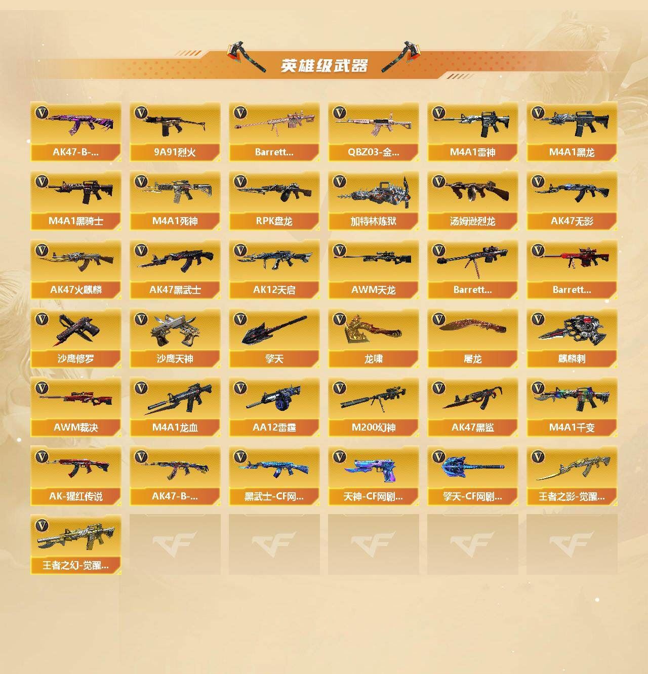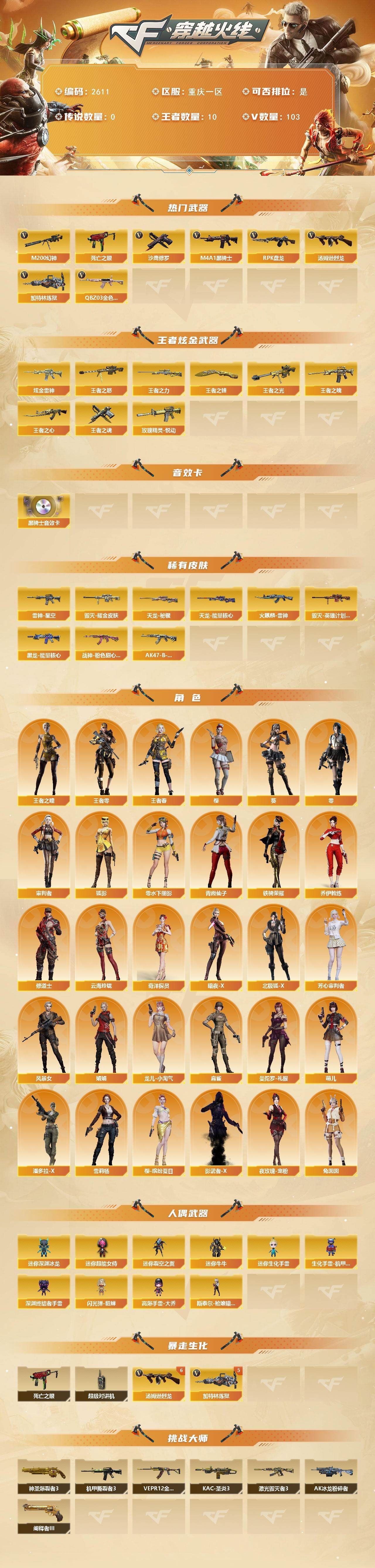 可二次可排位 重庆一区-103V-9王者武器数-2炫金武器数【热门武器】:QBZ03-金色蔷薇*6,M200-幻神,死亡之眼,M4A1-黑骑士*4,汤姆逊-烈龙*11,RPK-盘龙*3,加特林-炼狱*5,沙鹰-修罗*6【王者炫金武器】:玫瑰精灵-悦动,王者之魄,王者之心,王者之光,王者之怒,王者之力,王者之魂,王者之锋,炫金雷神*2【音效卡】:M4A1-黑骑士音效卡【皮肤】:雷神-星空,火麒麟-雷神*2,毁灭耀金皮肤,毁灭-英雄计划 皮肤,黑龙-能量核心,战神-粉色甜心皮肤,AK47-B-常胜将军-刘备,天龙-秘银,天龙-能量核心【角色】:零,葵,樱,审判者,王者-零,王者之瞳,4防王者春,狐影,奇洋探员,乔伊教练,修道士,云海玲珑,暗夜-X,北极狐-X,芳心审判者,风暴女,娟娟,零-水下丽影,龙儿-小淘气,麻雀,曼陀罗-礼服,萌儿,潘多拉-X,青霞仙子,铁骑荣耀,兔囡囡,雪莉杨,夜玫瑰-宠粉,樱-缤纷夏日,影武者-X【人偶武器】:斯泰尔-枪娘暗刃,迷你深渊冰龙,迷你裂空之翼,迷你牛牛*2,迷你生化手雷,生化手雷-机甲核心,深渊终结者手雷,闪光弹-貂蝉,高爆手雷-大乔,迷你超能女侍【暴走生化】:死亡之眼,超级对讲机【挑战大师】:神圣爆裂者III,AK47-冰龙粉碎者,VEPR-12-金魔,激光毁灭者III,机甲撕裂者III,KAC-圣炎切割者III,阐释者III【英雄级武器】:M4A1-千变*2,AK47-火麒麟*7,M4A1-黑龙*2,M4A1-雷神*4,M4A1-黑骑士*4,AK47-无影,M4A1-死神,AK47-黑武士,AK12-天启,AK47-黑鲨,M4A1-龙血*3,QBZ03-金色蔷薇*6,9A91-烈火,王者之影-觉醒版,王者之幻-觉醒版,AK-47-猩红传说,AK47-B-战神,AK47-B-常胜将军,黑武士-CF网剧冠军,AWM-天龙,Barrett-毁灭*5,Barrett-极光,AWM-裁决*2,M200-幻神,Barrett-金色蔷薇*2,RPK-盘龙*3,加特林-炼狱*5,汤姆逊-烈龙*11,AA-12-雷霆,沙鹰-修罗*6,沙鹰-天神*2,天神-CF网剧冠军,屠龙*7,龙啸*2,擎天*3,麒麟刺,擎天-CF网剧冠军【道具】:战舰背包,炫彩背包,背包-洛丽塔,超级背包,迷你冰龙背包,圣拳猎手-炽雪,妩媚妖姬,黄金生化钩,绿色巨人,灵魂忍者*2,变异宝贝,迷雾幽灵,生化弹匣,夺命之镰,防化服*2,热带奇洋表情,防弹头盔*7,防弹衣*5,C4工具钳*3,手雷包*5【特殊枪械】:4黑骑士,6烈龙,3盘龙,5炼狱 各种道具详情看截图、低价出售找回包 赔、截图展示段位不代 表实际段位,如赛季更新等不可抗拒因素发生变化、时限道具不保证所剩时间、标题未写送点劵默认不送【卖号买号首选亿梦】