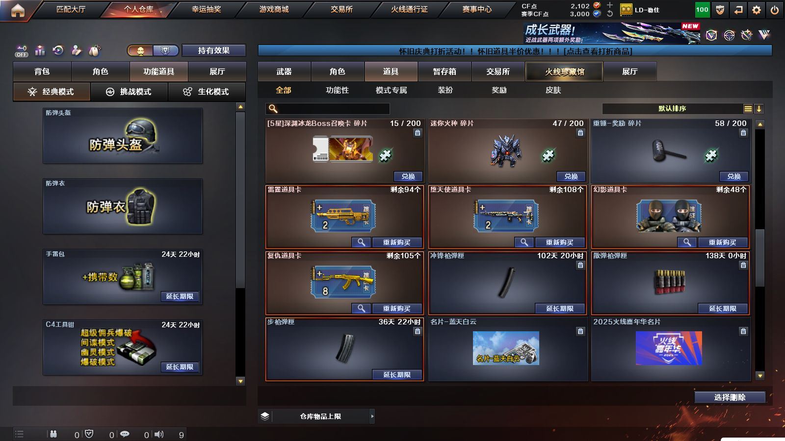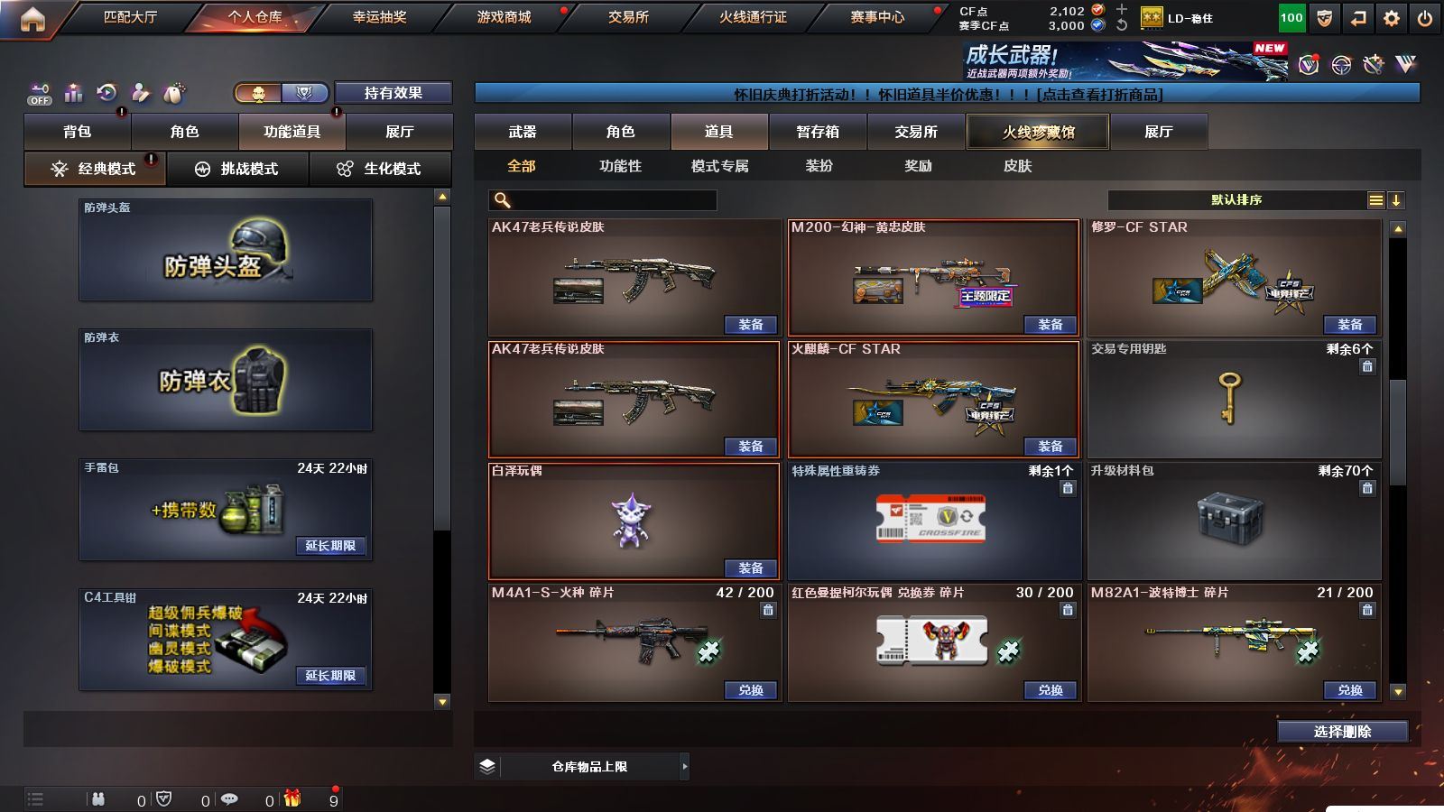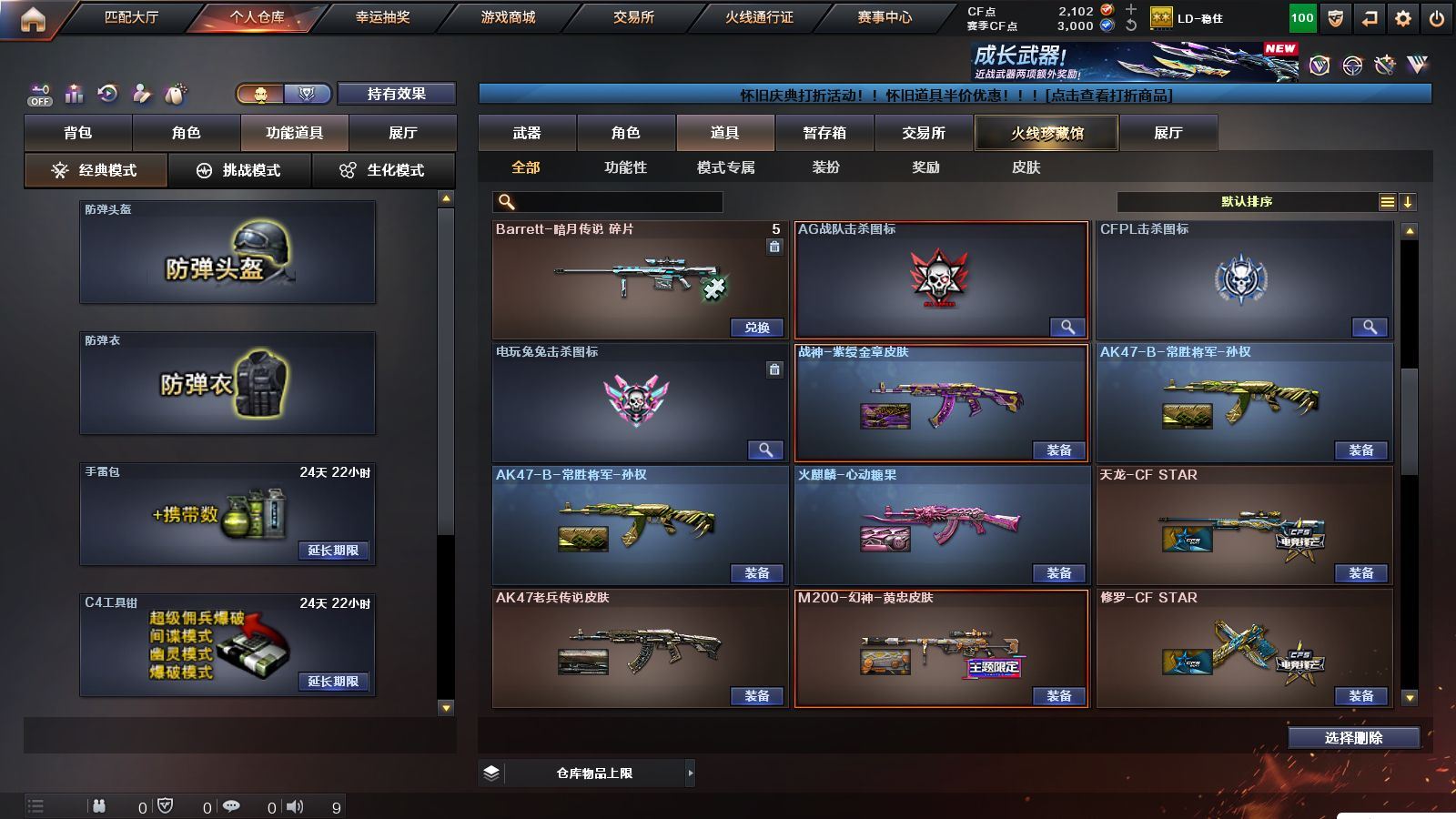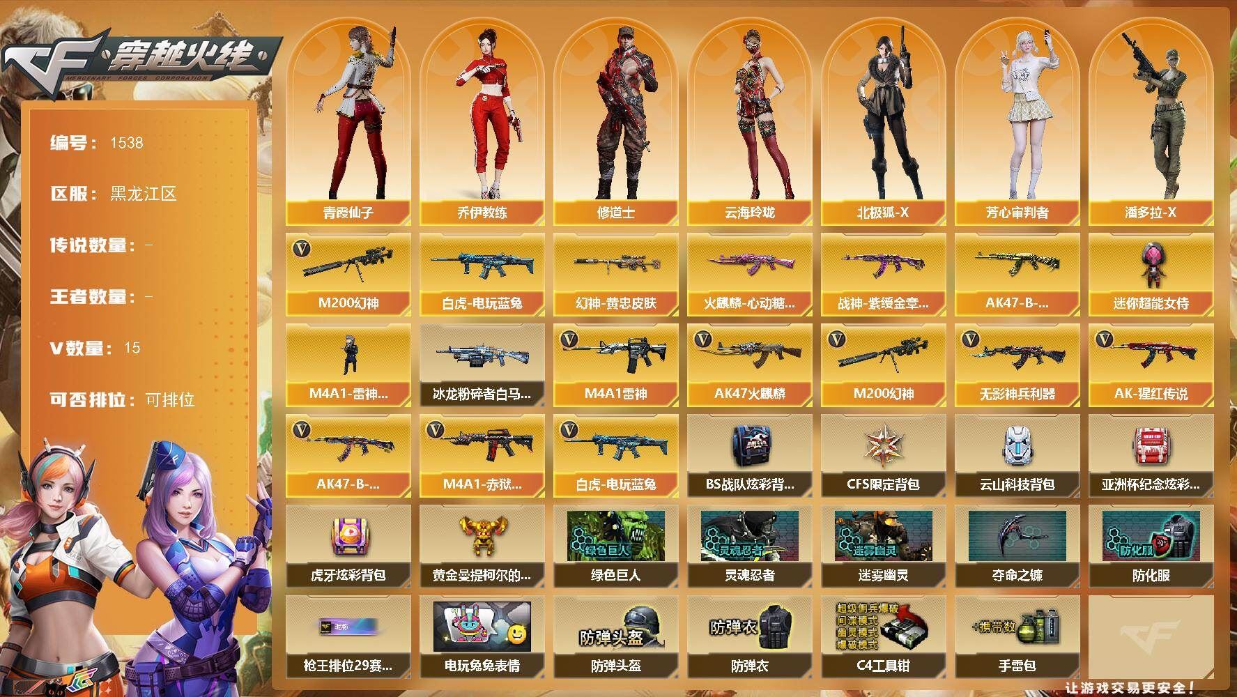 r51566 可二次可排位黑龙江区-11V【热门武器】:M200-幻神,白虎-电玩蓝兔【皮肤】:M200-幻神-黄忠皮肤,火麒麟-心动糖果,战神-紫绶金章皮肤,AK47-B-常胜将军-孙权*2【角色】:乔伊教练,修道士,云海玲珑,北极狐-X,芳心审判者,潘多拉-X,潘多拉-甜心教官,青霞仙子,斯沃特-X,兔囡囡,雪莉杨-摸金校尉【人偶武器】:M4A1-雷神-精英刀锋,迷你超能女侍【挑战大师】:冰龙粉碎者-白马银枪【英雄级武器】:AK47-火麒麟,M4A1-雷神,无影-神兵利器,AK-47-猩红传说,AK47-B-战神,白虎-电玩蓝兔,M200-幻神,M4A1-赤狱骑士【道具】:BS战队炫彩背包,CFS限定背包,云山科技背包,亚洲杯纪念炫彩背包,虎牙炫彩背包,黄金曼提柯尔的背包,绿色巨人,灵魂忍者,迷雾幽灵,夺命之镰,防化服*3,枪王排位29赛季金色流光,电玩兔兔表情,防弹头盔*9,防弹衣*9,C4工具钳*9,手雷包*9,各种道具详情看截图、低价出售找回包 赔、截图展示段位不代 表实际段位,如赛季更新等不可抗拒因素发生变化、时限道具不保证所剩时间、标题未写送点劵默认不送【卖号买号首选亿梦】