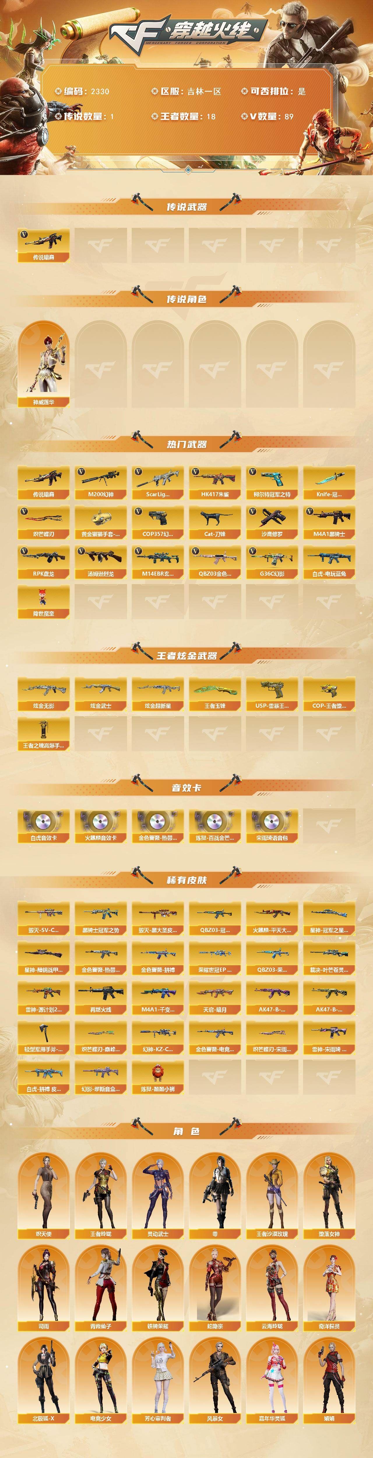 可二次QQ 【穿越火线】吉林一区可排位-89V-18王者武器数-3炫金武器数【传说武器】:传说暗裔【传说角色】:神威莲华【热门武器】:传说暗裔,G36C-幻影,QBZ03-金色蔷薇,M14EBR-玄武,Scar Light-白虎,HK417-朱雀,M200-幻神*2,白虎-电玩蓝兔,柯尔特-冠军之特,Cat-刀锋,M4A1-黑骑士,汤姆逊-烈龙,RPK-盘龙,降世魔童,COP 357-幻灵,沙鹰-修罗,Knife-冠军之刃,炽芒蝶刃*2,黄金猫猫手套-白鲨【王者炫金武器】:USP-雷暴王者*2,COP-王者堕天神,王者玉锋,炫金无影,炫金武士,炫金超新星,王者之魄高爆手雷【音效卡】:QBZ03-金色蔷薇-热带奇洋音效卡,AK47-火麒麟音效卡,Scar Light-白虎音效卡,宋雨琦语音包,炼狱-百战金芒-庆典舞曲音效卡【皮肤】:幻神-荣耀世冠EP 皮肤,幻神-KZ-CFPLS25冠军 皮肤,白虎-拼搏 皮肤,QBZ03-冠军之薇,金色蔷薇-热带奇洋 皮肤,QBZ03-金色蔷薇-拼搏,QBZ03-荣耀世冠EP 皮肤,金色蔷薇-电竞之星 皮肤,裁决-叶芒苍灵 皮肤,Kar98K-星神-冠军之星皮肤,星神-黯钢战甲 皮肤,雷神-源计划2.0专属 皮肤,M4A1-再燃火线,雷神-宋雨琦 皮肤,火麒麟-平天大圣,毁灭-SV-CFPLS16冠军,毁灭-黑大圣皮肤,M4A1-千变-孔明皮肤,黑骑士-冠军之势,天启-暗月,幻影-缪斯音盒 皮肤,AK47-B-常胜将军-曹操,AK47-B-常胜将军-孙权,炼狱-酷酷小狮,轻型军用手斧-再燃火线,炽芒蝶刃-巅峰荣耀 皮肤,炽芒蝶刃-宋雨琦 皮肤【角色】:零,4防司雨,4防妮妮,王者玲珑,4防王者沙漠玫瑰,堕落女神,蛇隐宗,奇洋探员,云海玲珑,宋雨琦,炽天使,北极狐-X,电竞少女,芳心审判者,风暴女*2,嘉年华灵狐,娟娟,0号玩家,4防灵动武士,灵狐-花神,麻雀,青霞仙子,蛇姬,斯沃特-X,铁骑荣耀,游珑儿【人偶武器】:火麒麟-灵狐,AWM-灵狐-15周年嘉年华,海滩汪汪-巴雷特,Cat-刀锋,生化手雷-机甲核心,AK47-斯沃特,迷你超能女侍,灵狐娃娃手雷,降世魔童【暴走生化】:超级对讲机【挑战大师】:冰龙粉碎者-白马银枪,激光毁灭者III-白马银枪,神圣爆裂者-末日III【英雄级武器】:AK47-火麒麟,M4A1-雷神,M4A1-黑骑士,M4A1-死神,AK47-黑武士,AK12-天启,AN94-超新星,AK47-黑鲨,HK417-朱雀,Scar Light-白虎,M14EBR-玄武,无影-神兵利器,G36C-幻影,黑武士-锦绣游龙,超新星-热带奇洋,FAMAS G2-天戎,QBZ03-金色蔷薇,王者之心-觉醒版,王者之魄-觉醒版,王者之势-觉醒版,超新星-悦享-觉醒版*2,AK-47-猩红传说*2,AK47-B-战神,白虎-电玩蓝兔,加利尔ACE-天袭,Barrett-毁灭,AWM-裁决,M200-幻神*2,王者星神-觉醒版,RPK-盘龙,炼狱-百战金芒,炼狱-悦蓝-觉醒版,汤姆逊-烈龙,AA-12-雷霆,沙鹰-修罗,沙鹰-天神*2,COP 357-幻灵,柯尔特-冠军之特,柯尔特-电竞装甲,柯尔特-荣耀世冠EP,柯尔特-电竞之星,USP-神工天巧,王者之魂-觉醒版,屠龙,擎天,麒麟刺,幻灵之锋,炽芒蝶刃*2,龙啸-热带奇洋,尼泊尔-电竞装甲,麒麟刺-百战金芒,高爆手雷-幻灵*2,高爆手雷-神工天巧,手雷-热带奇洋,闪光弹-幻灵*4,烟雾弹-幻灵*3,烟雾弹-神工天巧,烟雾弹-荣耀世冠EP*2【道具】:AG战队炫彩背包,CFS限定背包,全能枪王背包,奇洋探员-海龟背包,热带奇洋炫彩背包,百战金芒炫彩背包,超级背包,绿色巨人,灵魂忍者*2,变异宝贝,妖姬,迷雾幽灵,生化弹匣,夺命之镰,防化服*2,金色流光-枪王排位*2,星辰流光-枪王排位,枪王排位28赛季金色流光,语音特效-盛典烟火,萌萌小葵表情,电玩兔兔表情,热带奇洋表情,EP战队名片,EP战队喷图,C4-黑曜,防弹头盔*2,防弹衣*2,C4工具钳*2,手雷包*2【特殊枪械】:1白虎,1黑骑士,1烈龙,1盘龙,各种道具详情看截图、低价出售找回包 赔、截图展示段位不代 表实际段位,如赛季更新等不可抗拒因素发生变化、时限道具不保证所剩时间、标题未写送点劵默认不送【卖号买号首选亿梦】