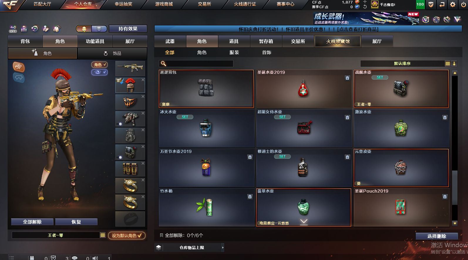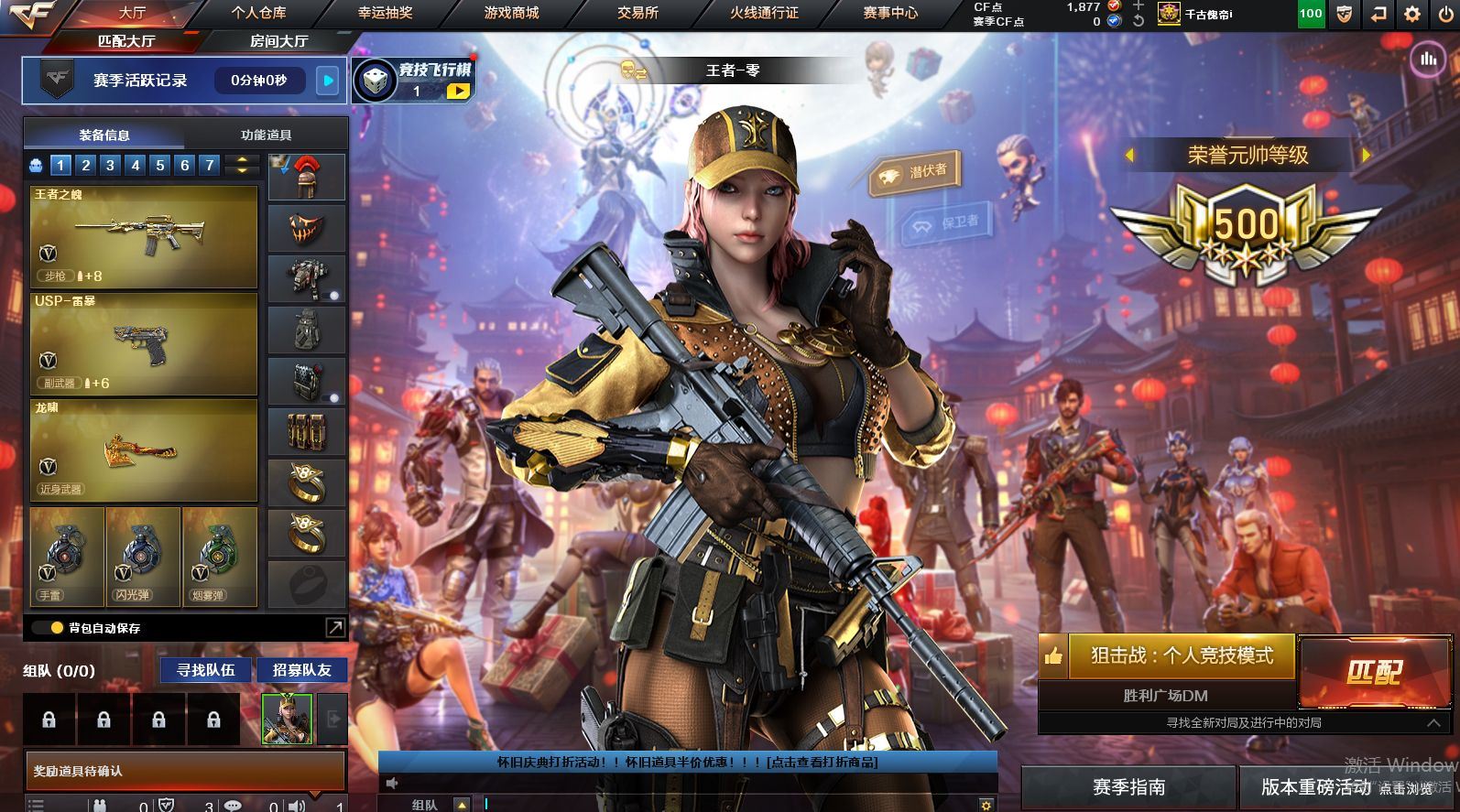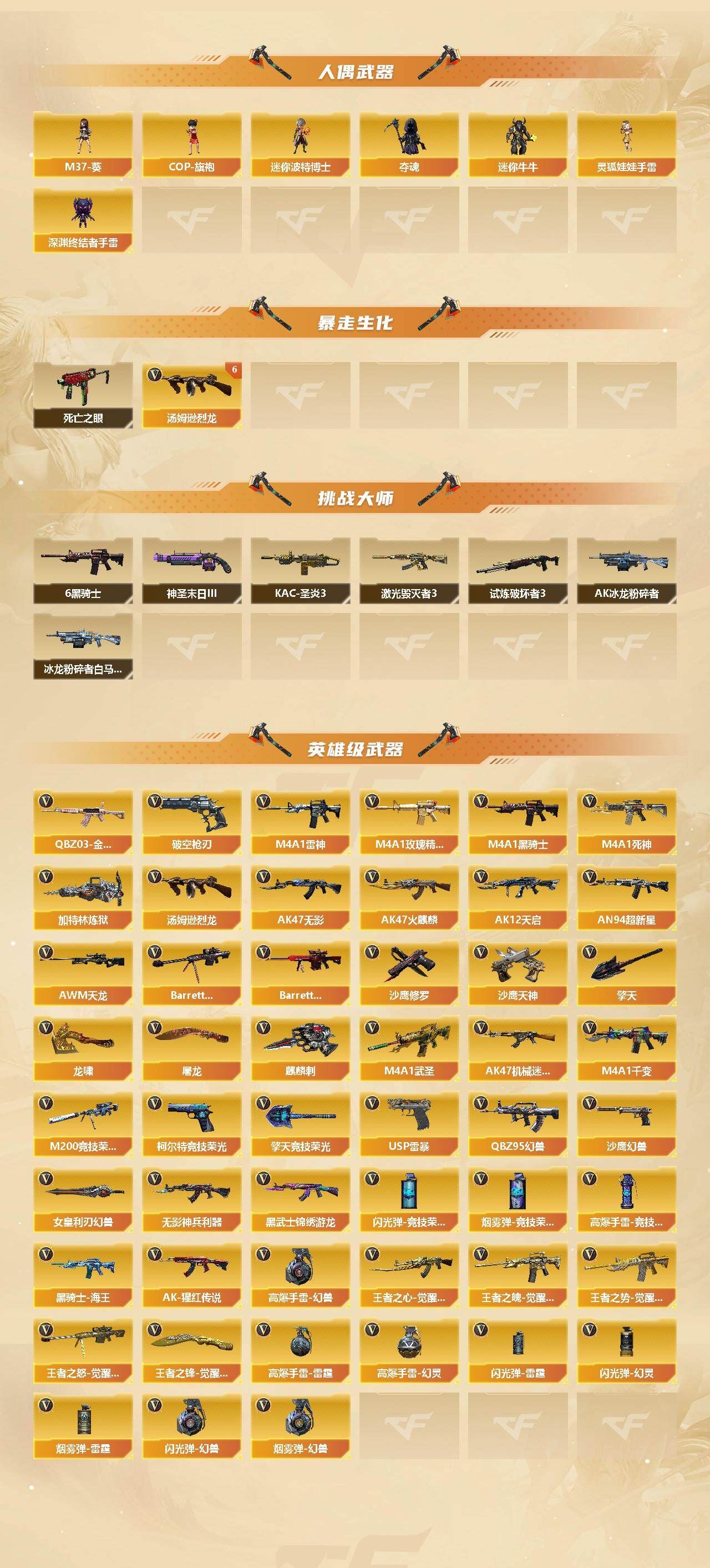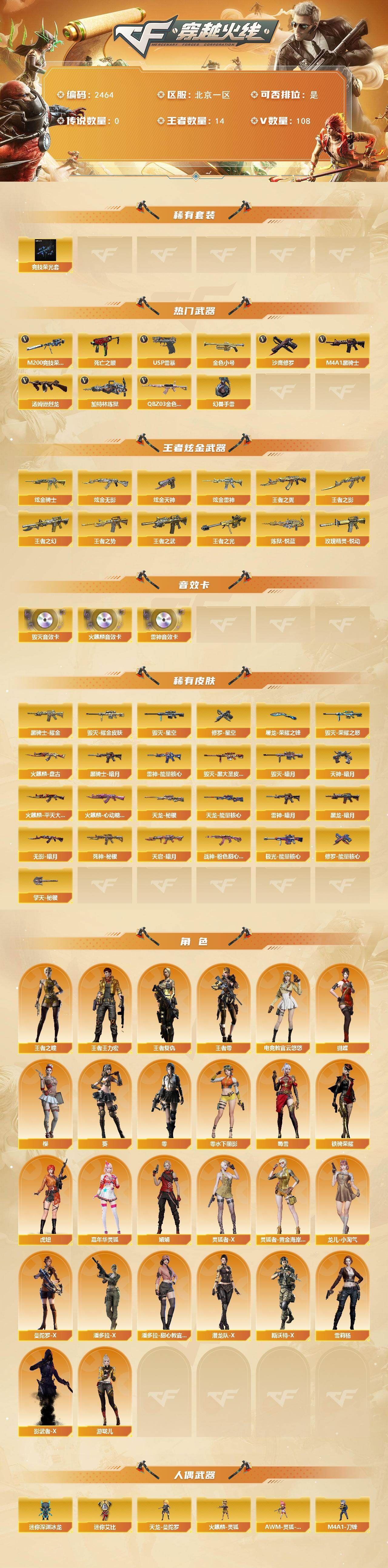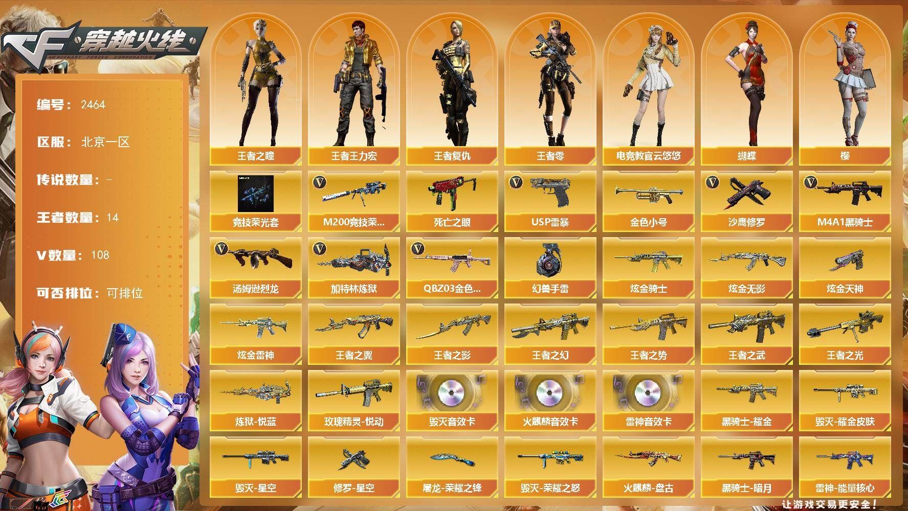 可二次可排位 北京一区-108V-12王者武器数-4炫金武器数【热门武器】:QBZ03-金色蔷薇,M200-竞技荣光,死亡之眼*2,金色小号,M4A1-黑骑士*6,汤姆逊-烈龙*6,加特林-炼狱*2,USP-雷暴,沙鹰-修罗*5,高爆手雷-幻兽*5【王者炫金武器】:王者之幻,王者之翼,王者之势,王者之武,玫瑰精灵-悦动,王者之影,王者之光,炼狱-悦蓝,炫金骑士,炫金无影,炫金雷神,炫金天神【音效卡】:AK47-火麒麟音效卡,M4A1-雷神音效卡,Barrett-毁灭音效卡【皮肤】:雷神-暗月,雷神-能量核心,火麒麟-平天大圣,火麒麟-盘古,火麒麟-心动糖果,毁灭-暗月*4,毁灭-荣耀之怒,毁灭耀金皮肤,毁灭-星空,毁灭-黑大圣皮肤,黑龙-暗月,黑骑士-暗月,黑骑士耀金皮肤,无影-暗月*3,死神-秘银,天启-暗月,战神-粉色甜心皮肤,天龙-秘银*2,天龙-能量核心,极光-能量核心,修罗-能量核心*4,修罗-星空,天神-暗月,屠龙-荣耀之锋*2,擎天-秘银【角色】:零,葵,樱,蝴蝶,电竞教官-云悠悠,王者-零,王者之瞳,王者复仇,王者王力宏,虎妞,嘉年华灵狐,娟娟,零-水下丽影,灵狐者-X,灵狐者-黄金海岸,龙儿-小淘气,曼陀罗-X,潘多拉-X,潘多拉-甜心教官,潜龙队-X,斯沃特-X,蜀雪,铁骑荣耀,雪莉杨,影武者-X,游珑儿【人偶武器】:天龙-曼陀罗,火麒麟-灵狐,AWM-灵狐-15周年嘉年华,M37-葵,COP-旗袍,M4A1-刀锋,迷你深渊冰龙,迷你波特博士,夺魂*2,迷你牛牛,深渊终结者手雷,迷你艾比,灵狐娃娃手雷*2【暴走生化】:死亡之眼*2【挑战大师】:AK47-冰龙粉碎者,冰龙粉碎者-白马银枪,激光毁灭者III,试炼破坏者III,KAC-圣炎切割者III,神圣爆裂者-末日III【英雄级武器】:M4A1-千变,AK47-火麒麟*3,M4A1-雷神*4,M4A1-黑骑士*6,AK47-无影,M4A1-死神,AK12-天启*3,AN94-超新星,M4A1-武圣,AK47-机械迷城*4,无影-神兵利器,黑武士-锦绣游龙,M4A1-玫瑰精灵*2,QBZ95-幻兽,QBZ03-金色蔷薇,王者之心-觉醒版,王者之魄-觉醒版,王者之势-觉醒版,AK-47-猩红传说,黑骑士-海王*2,AWM-天龙*4,Barrett-毁灭*2,Barrett-极光,M200-竞技荣光,王者之怒-觉醒版,加特林-炼狱*2,汤姆逊-烈龙*6,沙鹰-修罗*5,沙鹰-天神*2,USP-雷暴,柯尔特-竞技荣光,破空枪刃,沙鹰-幻兽*5,屠龙*4,龙啸,擎天*2,麒麟刺,擎天-竞技荣光,女皇利刃-幻兽,王者之锋-觉醒版*2,高爆手雷-雷霆,高爆手雷-幻兽*5,高爆手雷-幻灵,高爆手雷-竞技荣光,闪光弹-雷霆,闪光弹-幻兽*5,闪光弹-幻灵,闪光弹-竞技荣光,烟雾弹-雷霆,烟雾弹-幻兽*5,烟雾弹-竞技荣光【道具】:亚洲杯纪念炫彩背包,全能枪王背包,战舰背包,炫彩背包,老虎背包,背包-洛丽塔,虎牙炫彩背包,超级背包*2,绿色巨人,灵魂忍者,变异宝贝,迷雾幽灵,生化弹匣,夺命之镰*2,防化服*3,金色流光-枪王排位*2,星辰流光-枪王排位,C4-红龙,防弹头盔*6,防弹衣*8,C4工具钳*6,手雷包*6【特殊枪械】:6黑骑士,6烈龙,2炼狱【稀有套装】:竞技荣光套各种道具详情看截图、低价出售找回包 赔、截图展示段位不代 表实际段位,如赛季更新等不可抗拒因素发生变化、时限道具不保证所剩时间、标题未写送点劵默认不送【卖号买号首选亿梦】