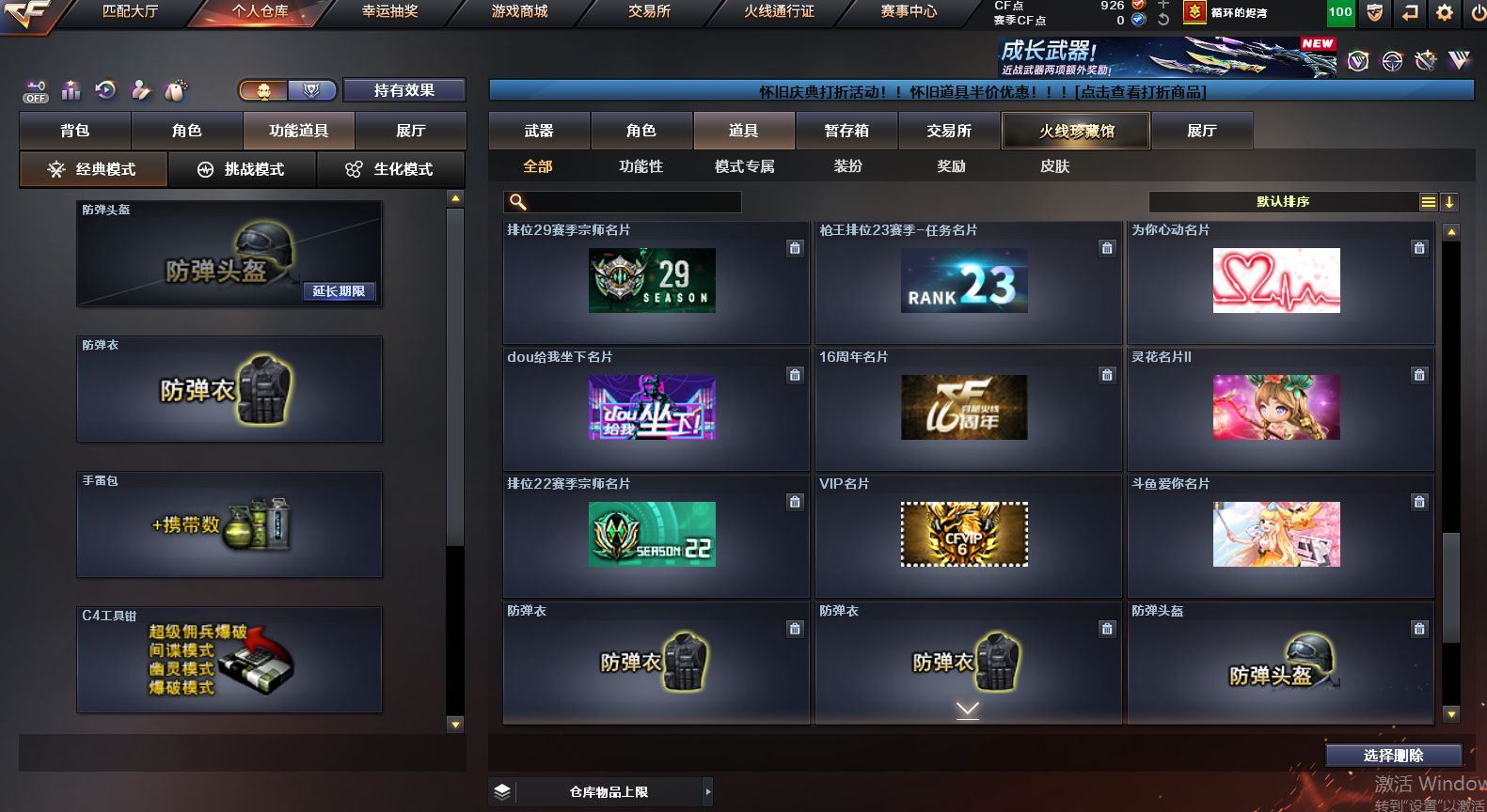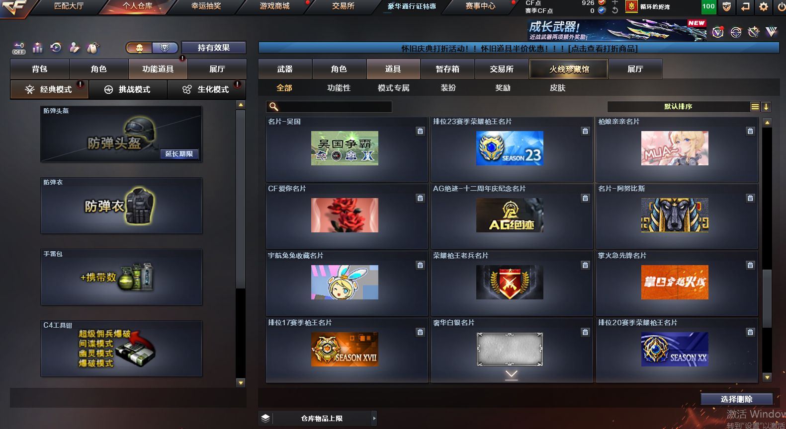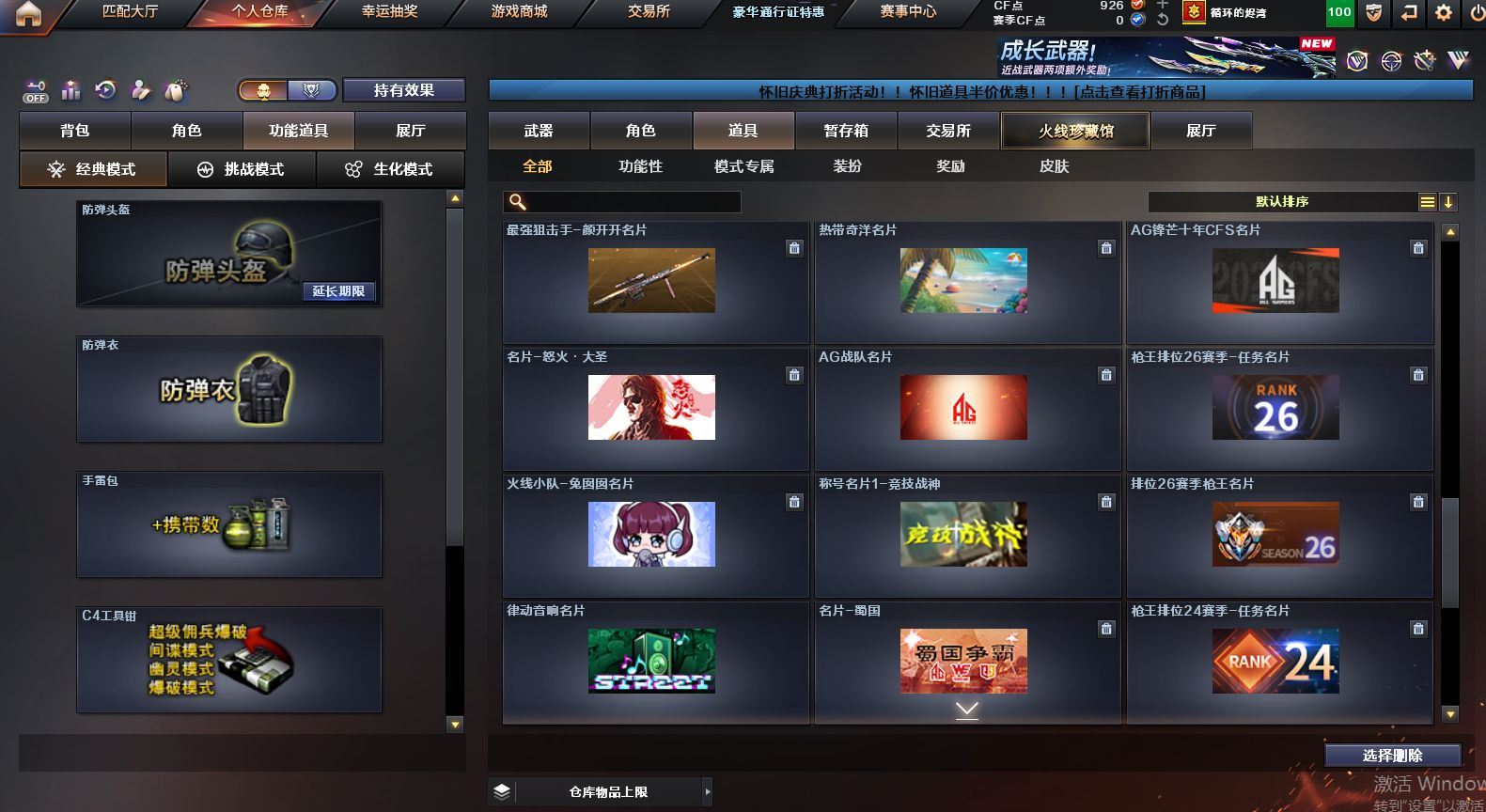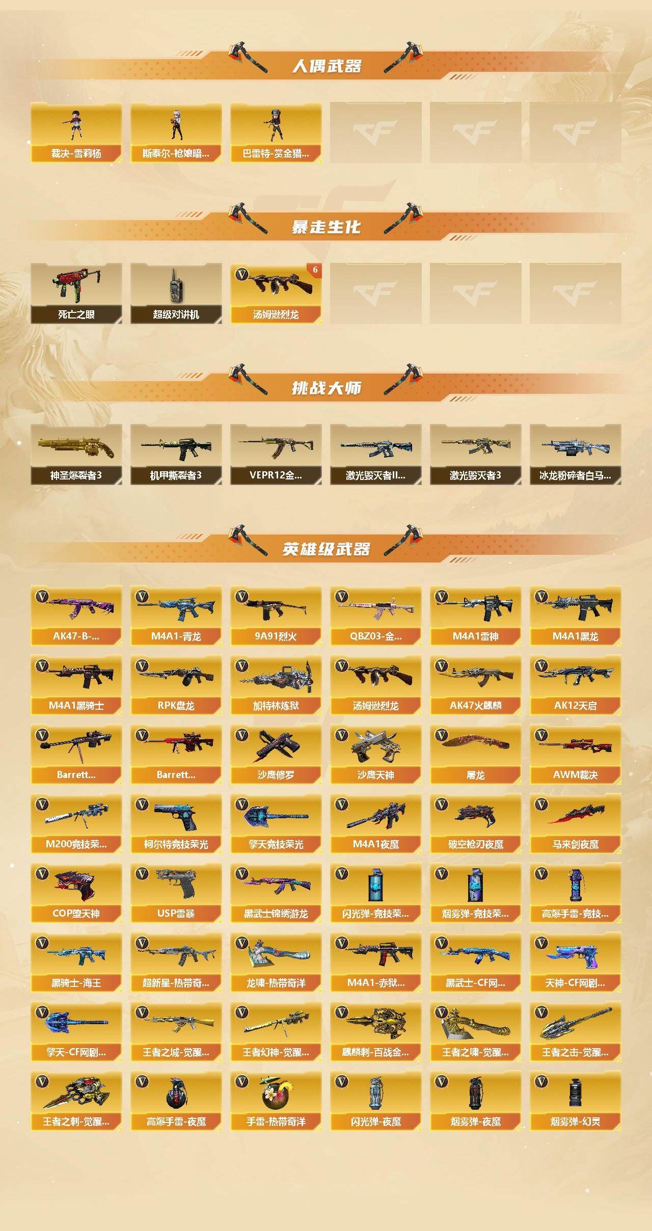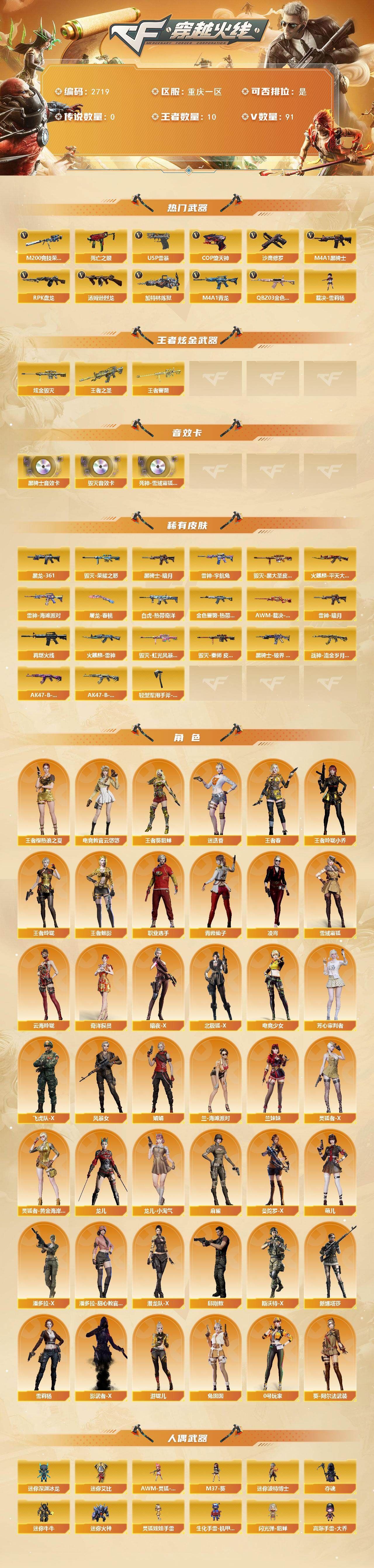 可二次可排位 重庆一区-91V-10王者武器数-1炫金武器数【热门武器】:QBZ03-金色蔷薇,M4A1-青龙,M200-竞技荣光,死亡之眼,M4A1-黑骑士*2,汤姆逊-烈龙*6,RPK-盘龙*4,加特林-炼狱,裁决-雪莉杨,USP-雷暴,COP-堕天神,沙鹰-修罗【王者炫金武器】:王者之圣,王者蔷薇,炫金毁灭【音效卡】:M4A1-黑骑士音效卡,Barrett-毁灭音效卡,死神-雪域霜狐-怀旧音效卡【皮肤】:白虎-热带奇洋 皮肤,金色蔷薇-热带奇洋 皮肤,AWM-裁决-凤灵皮肤,雷神-暗月,雷神-宇航兔皮肤,雷神-海滩派对 皮肤,M4A1-再燃火线,火麒麟-雷神,火麒麟-平天大圣,毁灭-荣耀之怒,毁灭-黑大圣皮肤,毁灭-虹光风暴 皮肤,毁灭-秦师 皮肤,M4A1-黑龙-361,黑骑士-暗月,黑骑士-破界 皮肤,战神-流金岁月皮肤,AK47-B-常胜将军-曹操,AK47-B-常胜将军-刘备*2,屠龙-春桃 皮肤,轻型军用手斧-再燃火线【角色】:迷迭香,4防凌霄,4防电竞教官-云悠悠,王者樱-热浪之夏,4防王者-葵-貂蝉,4防王者春,王者玲珑,4防王者-魅影,4防王者玲珑-小乔,雪域霜狐,奇洋探员,云海玲珑,葵-阿尔法武装,暗夜-X,北极狐-X,电竞少女,芳心审判者,飞虎队-X,风暴女*2,娟娟,兰-海滩派对,兰妹妹,0号玩家,灵狐者-X,灵狐者-黄金海岸,龙儿,龙儿-小淘气,麻雀,曼陀罗-X,萌儿,潘多拉-X,潘多拉-甜心教官,潜龙队-X,邱刚敖,青霞仙子,斯沃特-X,兔囡囡,新娜塔莎,雪莉杨,影武者-X,游珑儿,职业选手【人偶武器】:裁决-雪莉杨,斯泰尔-枪娘暗刃,AWM-灵狐-15周年嘉年华,M37-葵,迷你深渊冰龙*2,迷你波特博士,夺魂,迷你牛牛,迷你火种,生化手雷-机甲核心*3,闪光弹-貂蝉,高爆手雷-大乔,巴雷特-赏金猎人,迷你艾比,灵狐娃娃手雷*2【暴走生化】:死亡之眼,超级对讲机【挑战大师】:神圣爆裂者III*2,冰龙粉碎者-白马银枪,激光毁灭者III-白马银枪,VEPR-12-金魔,激光毁灭者III,机甲撕裂者III【英雄级武器】:AK47-火麒麟,M4A1-黑龙,M4A1-雷神*2,M4A1-黑骑士*2,AK12-天启,M4A1-青龙,M4A1-夜魔,黑武士-锦绣游龙,超新星-热带奇洋,QBZ03-金色蔷薇,9A91-烈火,王者之城-觉醒版,黑骑士-海王*2,AK47-B-常胜将军,黑武士-CF网剧冠军,机械迷城-穹宇,Barrett-毁灭,Barrett-极光,AWM-裁决,M200-竞技荣光,王者幻神-觉醒版,RPK-盘龙*4,加特林-炼狱,汤姆逊-烈龙*6,沙鹰-修罗,沙鹰-天神,USP-雷暴,COP-堕天神,柯尔特-竞技荣光,破空枪刃-夜魔,天神-CF网剧冠军,屠龙*2,马来剑-夜魔,擎天-竞技荣光,龙啸-热带奇洋,擎天-CF网剧冠军,麒麟刺-百战金芒,王者之啸-觉醒版*3,王者之击-觉醒版*2,王者之刺-觉醒版,高爆手雷-夜魔*7,高爆手雷-竞技荣光*3,手雷-热带奇洋,闪光弹-夜魔*7,闪光弹-竞技荣光*3,烟雾弹-夜魔*7,烟雾弹-幻灵,烟雾弹-竞技荣光*3,M4A1-赤狱骑士【道具】:CFS限定背包,云山科技背包,冰冰企鹅背包-猛男专用,奇洋探员-海龟背包,炫彩背包-诺拉,炫彩背包,热带奇洋炫彩背包,百战金芒炫彩背包,背包-洛丽塔,虎牙炫彩背包,超级背包,雪域霜狐炫彩背包,女皇终结者-魔龙之吻,救世主-黑桃战神,绿色巨人,灵魂忍者*2,变异宝贝,迷雾幽灵*2,生化弹匣,夺命之镰,防化服*3,金色流光-枪王排位,星辰流光-枪王排位,枪王排位28赛季金色流光,语音特效-怀旧,雪域霜狐表情,萌萌小葵表情,热带奇洋表情,斯沃特表情,EP战队名片,EP战队喷图,EP战队击杀图标,防弹头盔*4,防弹衣*5,C4工具钳*3,手雷包*3【特殊枪械】:2黑骑士,6烈龙,4盘龙,1炼狱 各种道具详情看截图、低价出售找回包 赔、截图展示段位不代 表实际段位,如赛季更新等不可抗拒因素发生变化、时限道具不保证所剩时间、标题未写送点劵默认不送【卖号买号首选亿梦】
