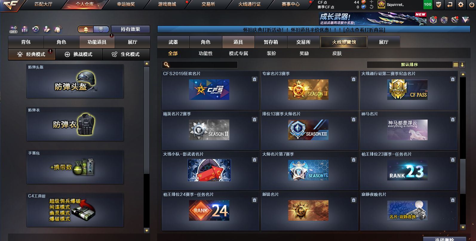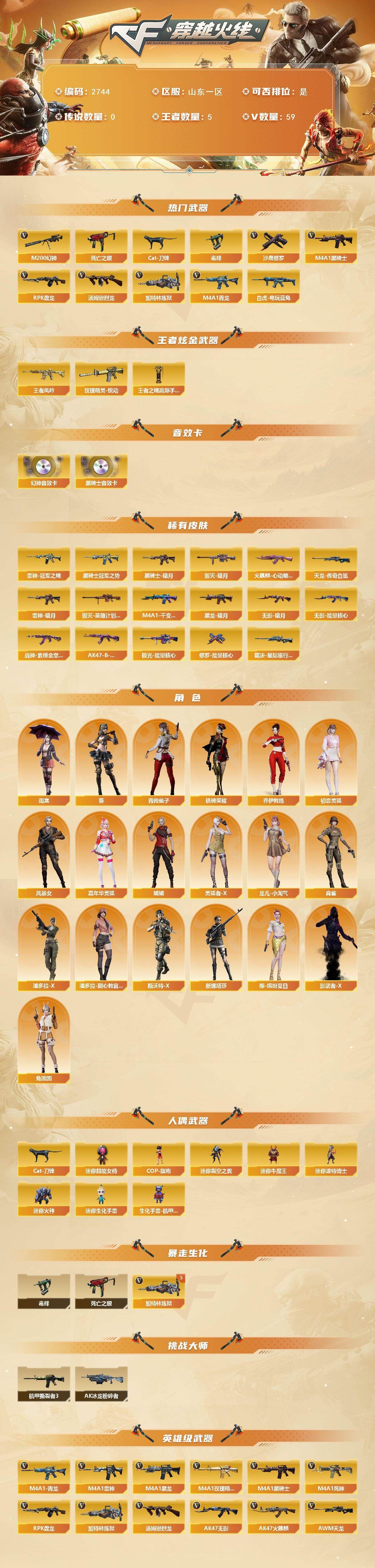 可二次可排位 山东一区-59V-3王者武器数-0炫金武器数【热门武器】:M4A1-青龙,M200-幻神,死亡之眼,白虎-电玩蓝兔,Cat-刀锋,毒蜂,M4A1-黑骑士,汤姆逊-烈龙*2,RPK-盘龙,加特林-炼狱*5,沙鹰-修罗【王者炫金武器】:玫瑰精灵-悦动,王者凤吟,王者之魄高爆手雷【音效卡】:M200-幻神音效卡,M4A1-黑骑士音效卡【皮肤】:裁决-星际旅行 皮肤,雷神-暗月,雷神-冠军之魄,火麒麟-心动糖果,毁灭-暗月*3,毁灭-英雄计划 皮肤,M4A1-千变-孔明皮肤,黑龙-暗月,黑骑士-暗月,黑骑士-冠军之势,无影-暗月,无影-能量核心,战神-紫绶金章皮肤,AK47-B-常胜将军-曹操,AWM-天龙-传奇白鲨,极光-能量核心,修罗-能量核心【角色】:葵,4防雨棠,乔伊教练,初恋灵狐,风暴女,嘉年华灵狐,娟娟,灵狐者-X,龙儿-小淘气,麻雀,潘多拉-X,潘多拉-甜心教官,青霞仙子,斯沃特-X,铁骑荣耀,兔囡囡,新娜塔莎,樱-缤纷夏日,影武者-X【人偶武器】:COP-旗袍,Cat-刀锋,迷你裂空之翼,迷你牛魔王,迷你波特博士*2,迷你火种,迷你生化手雷,生化手雷-机甲核心,迷你超能女侍【暴走生化】:毒蜂,死亡之眼【挑战大师】:AK47-冰龙粉碎者,机甲撕裂者III【英雄级武器】:AK47-火麒麟*2,M4A1-黑龙,M4A1-雷神*2,M4A1-黑骑士,AK47-无影,M4A1-死神,AK47-黑鲨,M4A1-青龙,M4A1-神工天巧,M4A1-玫瑰精灵,M4A1-猎神,烈火-动感闪耀,王者之幻-觉醒版,超新星-悦享-觉醒版,白虎-电玩蓝兔,AWM-天龙,Barrett-毁灭,Barrett-极光*2,AWM-裁决,M200-幻神,RPK-盘龙,加特林-炼狱*5,汤姆逊-烈龙*2,AA-12-雷霆,沙鹰-修罗,沙鹰-天神,天神-动感闪耀,屠龙*5,龙啸,擎天,麒麟刺,屠龙-动感闪耀,高爆手雷-竞技荣光,手雷-动感闪耀,闪光弹-竞技荣光,闪光弹-神工天巧*2,烟雾弹-幻灵*2,烟雾弹-竞技荣光【道具】:战舰背包,炫彩背包,超级背包,妩媚妖姬,绿色巨人,灵魂忍者,变异宝贝,迷雾幽灵,夺命之镰,防化服*2,金色流光-枪王排位,语音特效-生化,电玩兔兔表情,动感闪耀表情,防弹头盔*5,防弹衣*5,C4工具钳*5,手雷包*5【特殊枪械】:1黑骑士,2烈龙,1盘龙,5炼狱 各种道具详情看截图、低价出售找回包 赔、截图展示段位不代 表实际段位,如赛季更新等不可抗拒因素发生变化、时限道具不保证所剩时间、标题未写送点劵默认不送【卖号买号首选亿梦】