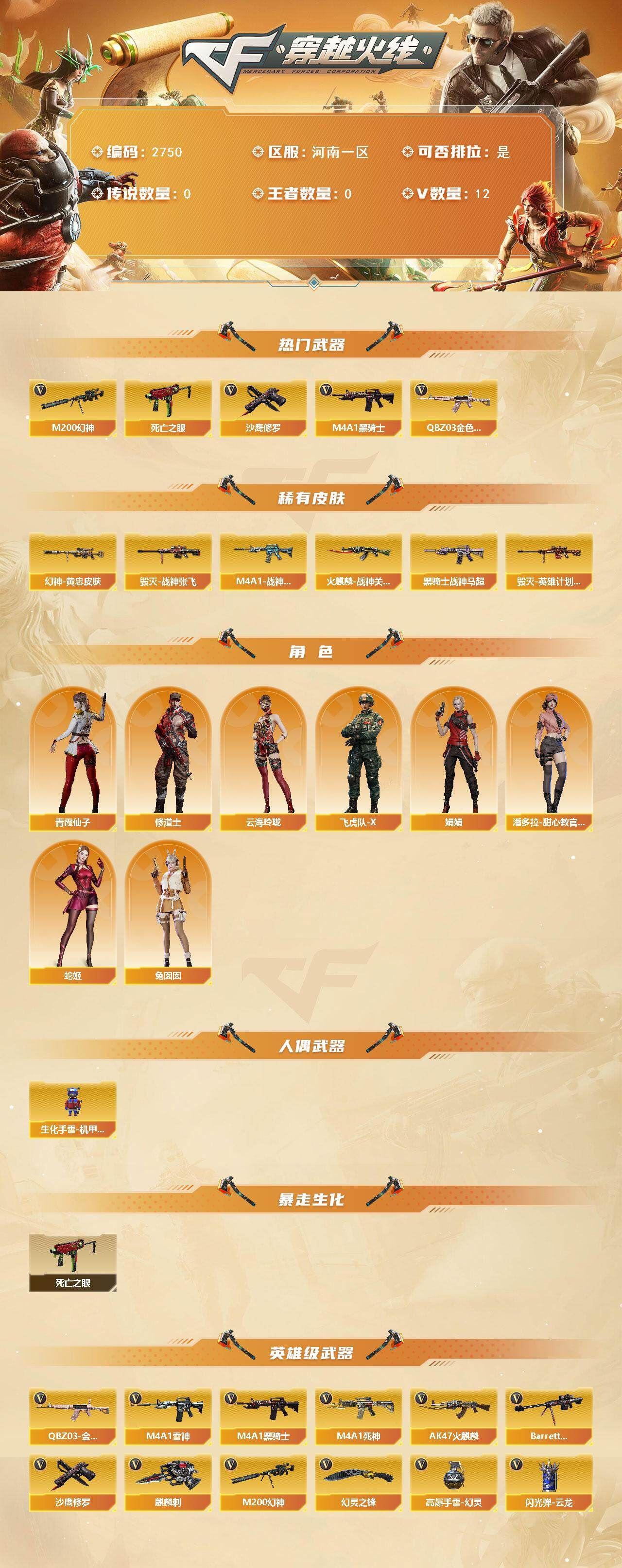 可二次可排位 河南一区-12V-0王者武器数-0炫金武器数【热门武器】:QBZ03-金色蔷薇,M200-幻神,死亡之眼,M4A1-黑骑士,沙鹰-修罗【皮肤】:M200-幻神-黄忠皮肤,M4A1-战神赵云,火麒麟-战神关羽,毁灭-战神张飞,毁灭-英雄计划 皮肤,黑骑士-战神马超【角色】:修道士,云海玲珑,飞虎队-X,娟娟,潘多拉-甜心教官,青霞仙子,蛇姬,兔囡囡【人偶武器】:生化手雷-机甲核心*2【暴走生化】:死亡之眼【英雄级武器】:AK47-火麒麟,M4A1-雷神,M4A1-黑骑士,M4A1-死神,QBZ03-金色蔷薇,Barrett-毁灭,M200-幻神,沙鹰-修罗,麒麟刺,幻灵之锋,高爆手雷-幻灵,闪光弹-云龙【道具】:CFS限定背包,超级背包,绿色巨人,灵魂忍者,迷雾幽灵,夺命之镰,防化服*2,金色流光-枪王排位*2,枪王排位28赛季金色流光,枪王排位29赛季金色流光,防弹头盔*4,防弹衣*4,C4工具钳*3,手雷包*3【特殊枪械】:1黑骑士 各种道具详情看截图、低价出售找回包 赔、截图展示段位不代 表实际段位,如赛季更新等不可抗拒因素发生变化、时限道具不保证所剩时间、标题未写送点劵默认不送【卖号买号首选亿梦】