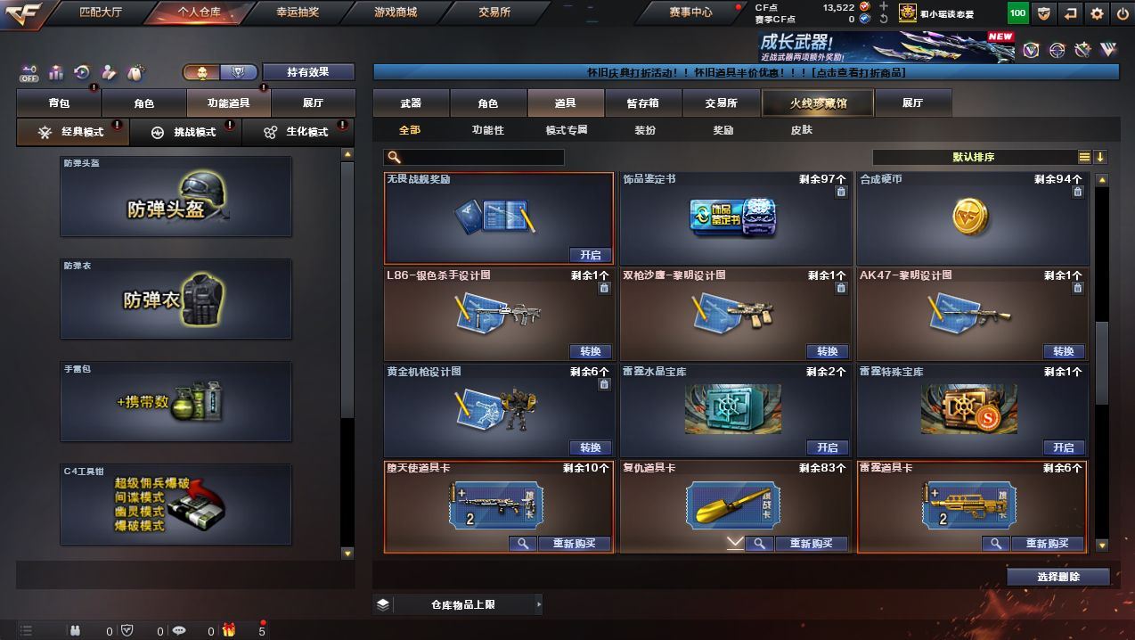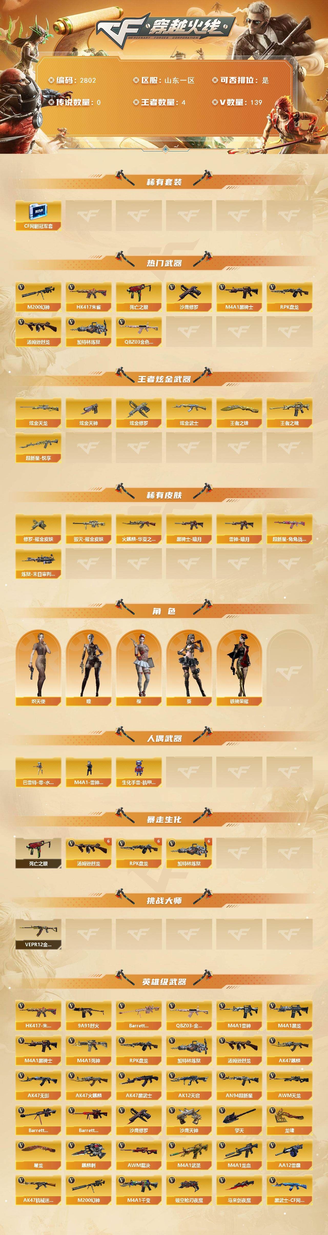 可二次可排位山东一区-139V-4王者武器数-6炫金武器数【热门武器】:QBZ03-金色蔷薇,HK417-朱雀,M200-幻神,死亡之眼,M4A1-黑骑士*4,汤姆逊-烈龙*9,RPK-盘龙*6,加特林-炼狱*6,沙鹰-修罗*8【稀有套装】:CF网剧冠军套【王者炫金武器】:超新星-悦享,王者之魄,王者之锋*2,炫金武士,炫金天龙*3,炫金天神,炫金修罗【皮肤】:雷神-暗月,火麒麟-华夏之心,毁灭耀金皮肤*2,黑骑士-暗月,超新星-兔兔战士 皮肤,炼狱-末日审判 皮肤,修罗耀金皮肤【角色】:葵,樱,瞳,炽天使,铁骑荣耀【人偶武器】:M4A1-雷神-精英刀锋,巴雷特-零-水下丽影,生化手雷-机甲核心【暴走生化】:死亡之眼【挑战大师】:VEPR-12-金魔*2【英雄级武器】:M4A1-千变*3,AK47-火麒麟*8,AK47-麒麟,M4A1-黑龙,M4A1-雷神*2,M4A1-黑骑士*4,AK47-无影,M4A1-死神*2,AK47-黑武士*2,AK12-天启,AN94-超新星*3,M4A1-武圣,AK47-机械迷城,M4A1-龙血*4,HK417-朱雀,QBZ03-金色蔷薇,9A91-烈火*2,黑武士-CF网剧冠军,AWM-天龙,Barrett-毁灭*4,Barrett-极光,AWM-裁决,M200-幻神,Barrett-金色蔷薇*2,RPK-盘龙*6,加特林-炼狱*6,汤姆逊-烈龙*9,AA-12-雷霆,沙鹰-修罗*8,沙鹰-天神*15,破空枪刃-夜魔,天神-CF网剧冠军,屠龙*6,龙啸*7,马来剑-夜魔,擎天*6,麒麟刺*6,擎天-CF网剧冠军,王者之啸-觉醒版,高爆手雷-夜魔*4,闪光弹-夜魔*4,烟雾弹-夜魔*4【道具】:战舰背包,炫彩背包,变异宝贝,夺命之镰,防化服,枪王排位29赛季金色流光,语音特效-机器人,防弹头盔*9,防弹衣*9,C4工具钳*9,手雷包*9【特殊枪械】:4黑骑士,6烈龙,6盘龙,6炼狱,各种道具详情看截图、低价出售找回包 赔、截图展示段位不代 表实际段位,如赛季更新等不可抗拒因素发生变化、时限道具不保证所剩时间、标题未写送点劵默认不送【卖号买号首选亿梦】