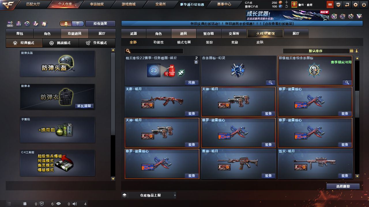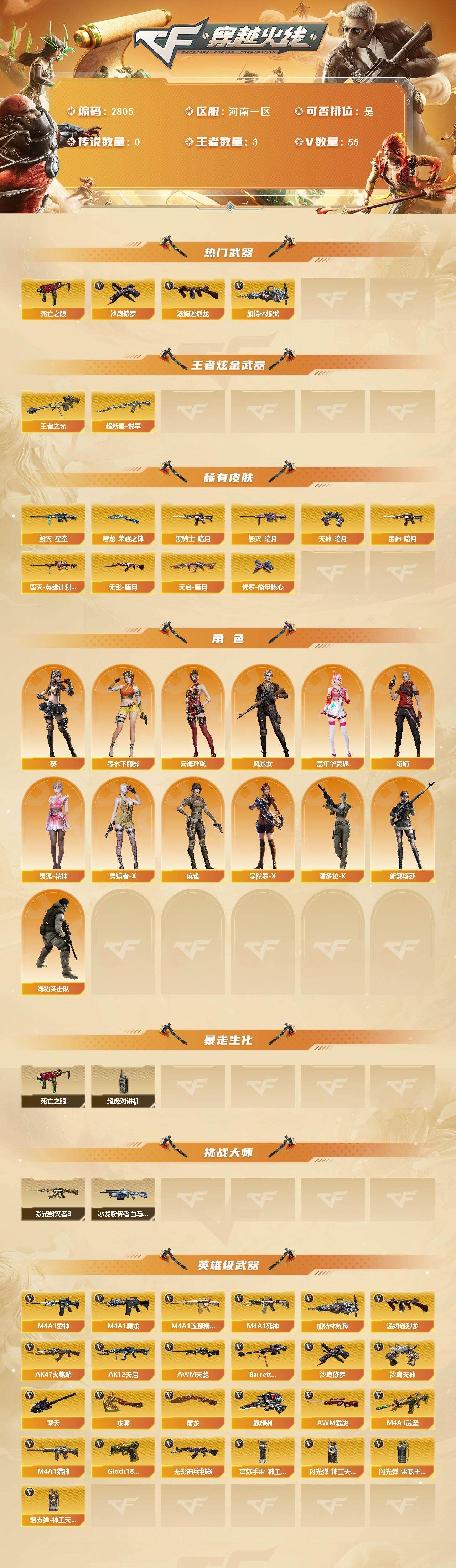 可二次可排位河南一区-55V【热门武器】:死亡之眼*2,汤姆逊-烈龙*3,加特林-炼狱*4,沙鹰-修罗*4【王者炫金武器】:超新星-悦享,王者之光【皮肤】:雷神-暗月,毁灭-暗月,毁灭-星空,毁灭-英雄计划 皮肤,黑骑士-暗月,无影-暗月,天启-暗月,修罗-能量核心*4,天神-暗月*2,屠龙-荣耀之锋【角色】:葵,云海玲珑,风暴女,嘉年华灵狐,娟娟,零-水下丽影,灵狐-花神,灵狐者-X,麻雀,曼陀罗-X,潘多拉-X,新娜塔莎,海豹突击队【暴走生化】:死亡之眼*2,超级对讲机【挑战大师】:冰龙粉碎者-白马银枪,激光毁灭者III*5【英雄级武器】:AK47-火麒麟*2,M4A1-黑龙*2,M4A1-雷神*3,M4A1-死神,AK12-天启,M4A1-武圣,无影-神兵利器,M4A1-玫瑰精灵,M4A1-猎神,AWM-天龙*2,Barrett-毁灭*3,AWM-裁决,加特林-炼狱*4,汤姆逊-烈龙*3,沙鹰-修罗*4,沙鹰-天神*4,Glock18-武圣,屠龙*5,龙啸*3,擎天*2,麒麟刺*2,高爆手雷-神工天巧*2,闪光弹-神工天巧*3,闪光弹-雷暴王者,烟雾弹-神工天巧*3【道具】:宋雨琦炫彩背包,战舰背包,绿色巨人,灵魂忍者,迷雾幽灵,夺命之镰,防化服*2,星辰流光-枪王排位,防弹头盔*4,防弹衣*4,C4工具钳*4,手雷包*4【特殊枪械】:3烈龙,4炼狱,各种道具详情看截图、低价出售找回包 赔、截图展示段位不代 表实际段位,如赛季更新等不可抗拒因素发生变化、时限道具不保证所剩时间、标题未写送点劵默认不送【卖号买号首选亿梦】
