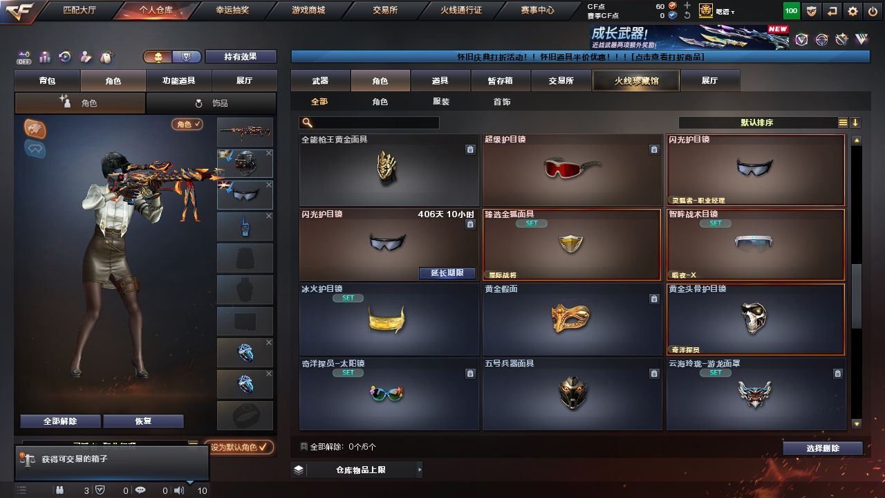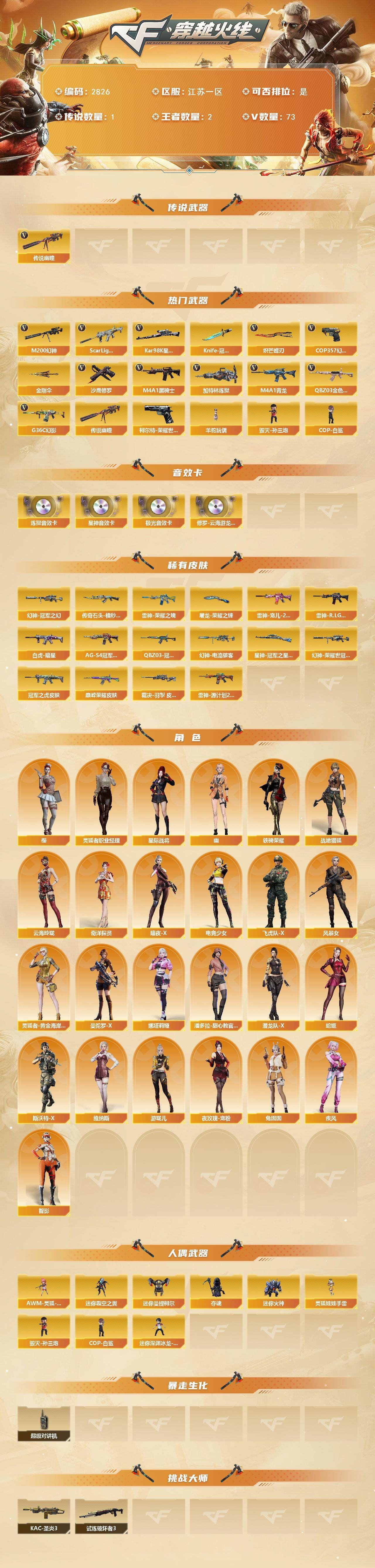 可二次可排位江苏一区-73V【传说武器】:传说幽瞳【热门武器】:传说幽瞳,G36C-幻影,QBZ03-金色蔷薇,Scar Light-白虎,M4A1-青龙,M200-幻神,柯尔特-荣耀世冠白鲨2023,Kar98K-星神,M4A1-黑骑士*4,加特林-炼狱,羊驼玩偶,毁灭-孙三炮,COP-白鲨,COP 357-幻灵,沙鹰-修罗*4,Knife-冠军之刃,炽芒蝶刃,金刚伞【音效卡】:修罗-云海游龙音效卡,Barrett-极光音效卡,Kar98K-星神音效卡,加特林-炼狱音效卡【皮肤】:幻神-冠军之幻,幻神-电流骇客 皮肤,幻神-荣耀世冠白鲨2023 皮肤,Scar Light-白虎-暗星,ScarLight-白虎-冠军之虎皮肤,QBZ03-冠军之薇,QBZ03-巅峰荣耀皮肤*2,裁决-羽掣 皮肤,Kar98K-星神-冠军之星皮肤,雷神-荣耀之魄,雷神-宠儿-2019MVP,雷神-R.LGD-CFPLS18冠军,雷神-源计划2.0专属 皮肤,传奇石头-横秒之巅,黑骑士-AG-S4冠军典藏,屠龙-荣耀之锋【角色】:樱,星际战将,战地猎狐,奇洋探员,云海玲珑,暗夜-X,电竞少女,飞虎队-X,风暴女,疾风,灵狐者-黄金海岸,灵狐者-职业经理,曼陀罗-X,娜塔莉娅,潘多拉-甜心教官,潜龙队-X,蛇姬,斯沃特-X,铁骑荣耀,兔囡囡,维纳斯,夜玫瑰-宠粉,幽,游珑儿,智影【人偶武器】:COP-白鲨,毁灭-孙三炮,AWM-灵狐-15周年嘉年华,迷你裂空之翼*2,迷你曼提柯尔,夺魂,迷你火种,迷你深渊冰龙-王绿豆,灵狐娃娃手雷【暴走生化】:超级对讲机【挑战大师】:试炼破坏者III,KAC-圣炎切割者III【英雄级武器】:AK47-火麒麟,M4A1-雷神,M4A1-黑骑士*4,M4A1-死神*2,M4A1-青龙,Scar Light-白虎,G36C-幻影,QBZ03-金色蔷薇,9A91-烈火,黑骑士-海王,QBZ-03-王者蔷薇-觉醒版,王者风势-觉醒版,Barrett-极光,AWM-裁决,M200-幻神,Kar98K-星神,加特林-炼狱,AA-12-雷霆,沙鹰-修罗*4,沙鹰-天神*4,COP 357-幻灵,柯尔特-荣耀世冠白鲨2023,屠龙,擎天,幻灵之锋,炽芒蝶刃,擎天-云海游龙,高爆手雷-幻灵*6,手雷-热带奇洋,高爆手雷-古蛇迷踪,闪光弹-幻灵*8,烟雾弹-幻灵*7,M4A1-赤狱骑士【道具】:云山科技背包,云海游龙炫彩背包,亚洲杯纪念炫彩背包,古蛇迷踪炫彩背包,奇洋探员-海龟背包,炫彩背包-诺拉,热带奇洋炫彩背包,臻选金狐背包,超级背包,黄金超能特工背包,救世主-黑桃战神,黄金生化钩,绿色巨人,灵魂忍者*2,变异宝贝,妖姬,迷雾幽灵*2,生化弹匣,夺命之镰,防化服*2,金色流光-枪王排位,星辰流光-枪王排位,流光-再燃火线,枪王排位28赛季金色流光,枪王排位29赛季金色流光,古蛇迷踪打击特效,蛇隐宗表情,热带奇洋表情,斯沃特表情*3,云海游龙表情,防弹头盔*2,防弹衣*2,C4工具钳*2,手雷包*2【特殊枪械】:1白虎,4黑骑士,1炼狱,各种道具详情看截图、低价出售找回包 赔、截图展示段位不代 表实际段位,如赛季更新等不可抗拒因素发生变化、时限道具不保证所剩时间、标题未写送点劵默认不送