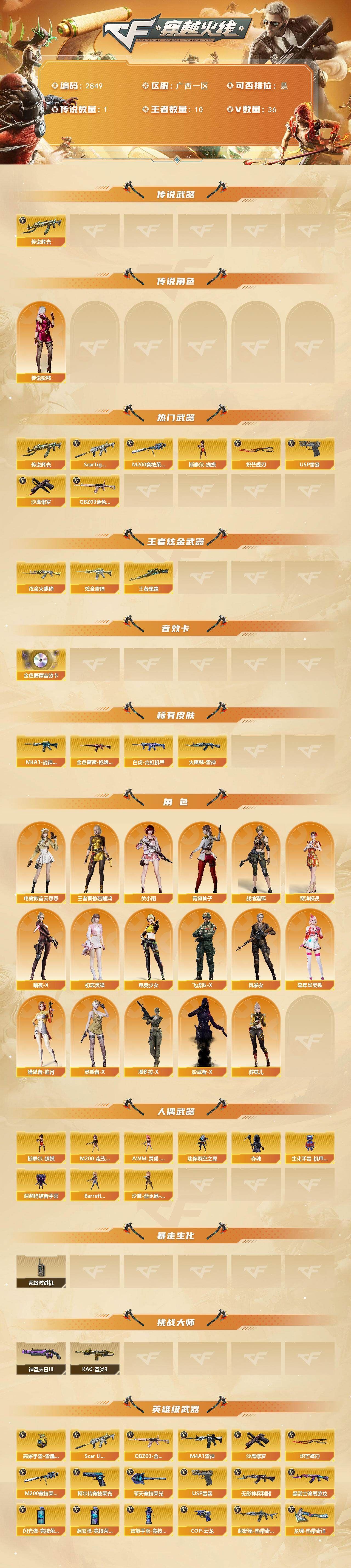 可二次可排位广西一区-36V【传说武器】:传说辉光【传说角色】:传说影煞【热门武器】:传说辉光,QBZ03-金色蔷薇,Scar Light-白虎,M200-竞技荣光,斯泰尔-蝴蝶,USP-雷暴,沙鹰-修罗*2,炽芒蝶刃【王者炫金武器】:王者星霆,炫金火麒麟,炫金雷神【音效卡】:QBZ03-金色蔷薇音效卡【皮肤】:白虎-霓虹机甲 皮肤,金色蔷薇-枪娘阿敏 皮肤,M4A1-战神赵云,火麒麟-雷神【角色】:电竞教官-云悠悠,关小雨,战地猎狐,王者葵-惊若翩鸿,奇洋探员,暗夜-X,初恋灵狐,电竞少女,飞虎队-X,风暴女*2,嘉年华灵狐,猎狐者-追月,灵狐者-X,潘多拉-X,青霞仙子,影武者-X,游珑儿【人偶武器】:斯泰尔-蝴蝶,Barrett-云海玲珑,AWM-灵狐-15周年嘉年华,迷你裂空之翼,夺魂,生化手雷-机甲核心,深渊终结者手雷,沙鹰-蓝水晶-曼陀罗,M200-夜玫瑰【暴走生化】:超级对讲机【挑战大师】:KAC-圣炎切割者III,神圣爆裂者-末日III【英雄级武器】:M4A1-雷神,Scar Light-白虎,无影-神兵利器,黑武士-锦绣游龙,超新星-热带奇洋,QBZ03-金色蔷薇,王者风势-觉醒版,M200-竞技荣光,沙鹰-修罗*2,USP-雷暴,柯尔特-竞技荣光,COP 357-云龙,擎天-竞技荣光,炽芒蝶刃,龙啸-热带奇洋,高爆手雷-竞技荣光,高爆手雷-云龙,手雷-热带奇洋,高爆手雷-雷霆王者-觉醒版*4,闪光弹-竞技荣光,闪光弹-云龙*3,闪光弹-雷霆王者-觉醒版*4,烟雾弹-竞技荣光,M4A1-赤狱骑士【道具】:全能枪王背包,奇洋探员-海龟背包,热带奇洋炫彩背包,超级背包,女皇终结者-魔龙之吻,救世主-黑桃战神,生化弹匣,夺命之镰,防化服,金色流光-枪王排位*2,星辰流光-枪王排位,枪王排位28赛季金色流光,枪王排位29赛季金色流光,热带奇洋表情,循环实验表情,C4-黑曜,防弹头盔,防弹衣,C4工具钳*2,手雷包*2【特殊枪械】:蝴蝶斯泰尔+0烈龙,1白虎,1蝴蝶斯泰尔,各种道具详情看截图、低价出售找回包 赔、截图展示段位不代 表实际段位,如赛季更新等不可抗拒因素发生变化、时限道具不保证所剩时间、标题未写送点劵默认不送【卖号买号首选亿梦】