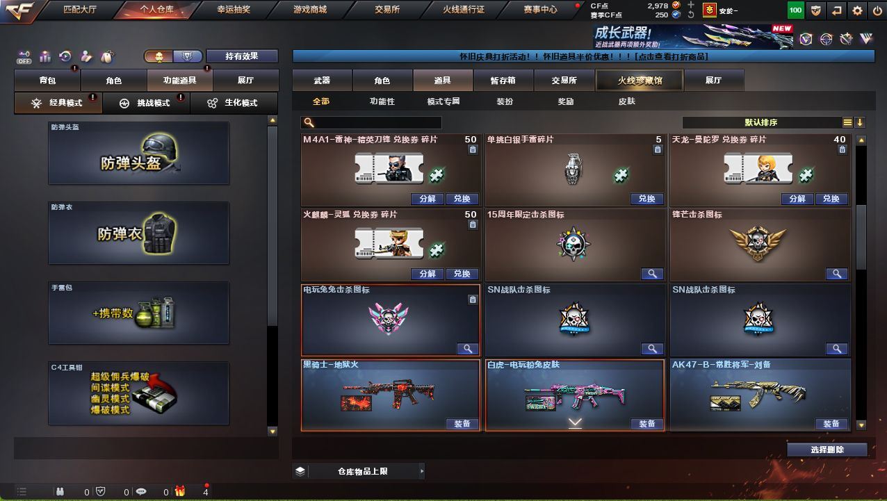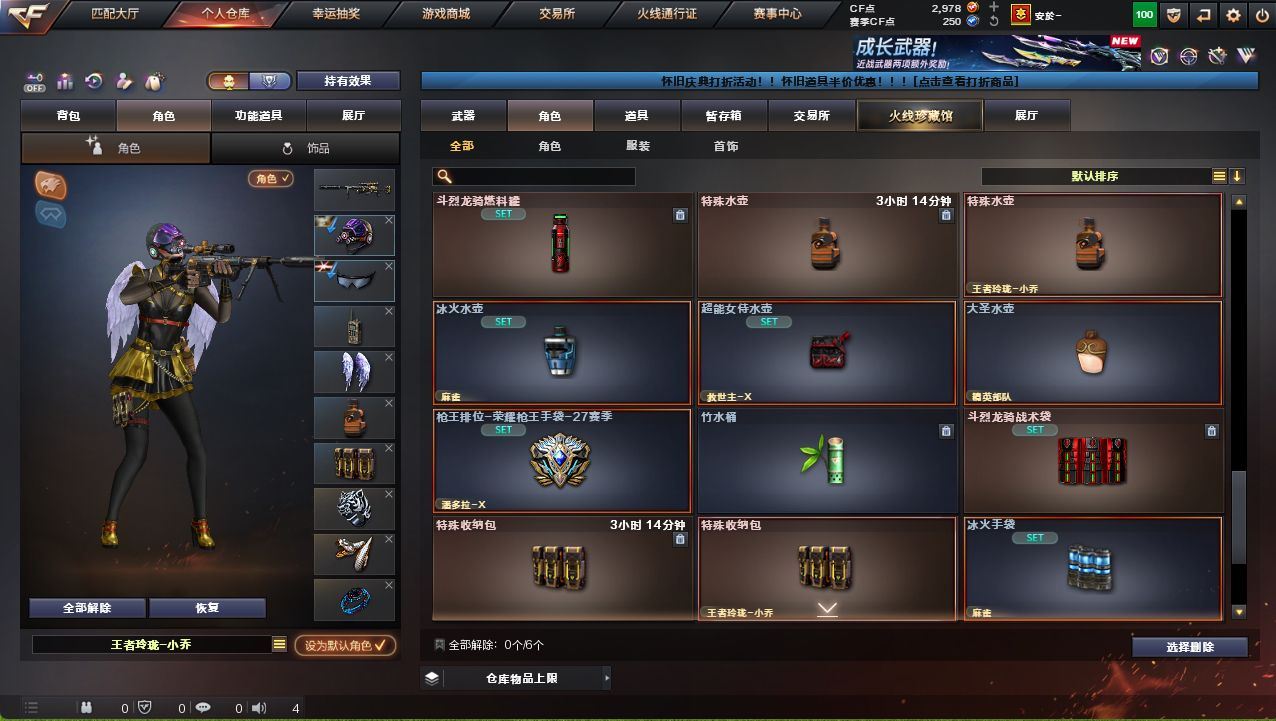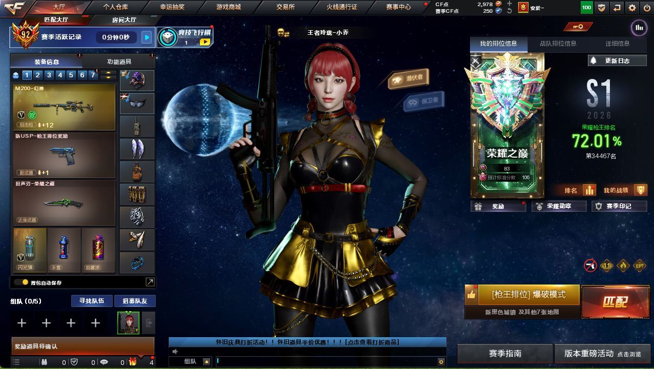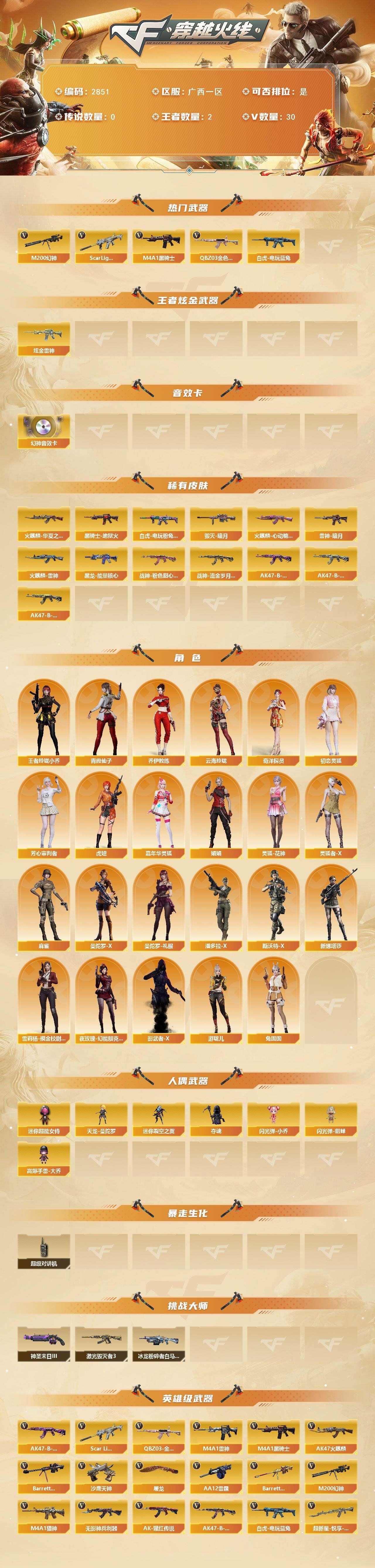 可二次可排位广西一区-30V-2王者武器数-1炫金武器数【热门武器】:QBZ03-金色蔷薇,Scar Light-白虎,M200-幻神,白虎-电玩蓝兔,M4A1-黑骑士【王者炫金武器】:炫金雷神【音效卡】:M200-幻神音效卡【皮肤】:白虎-电玩粉兔皮肤,雷神-暗月,火麒麟-雷神,火麒麟-华夏之心,火麒麟-心动糖果,毁灭-暗月,黑龙-能量核心*2,黑骑士-地狱火,战神-粉色甜心皮肤,战神-流金岁月皮肤*2,AK47-B-常胜将军-曹操,AK47-B-常胜将军-刘备*2,AK47-B-常胜将军-孙权*2【角色】:四防王者玲珑-小乔,奇洋探员,乔伊教练,云海玲珑,初恋灵狐,芳心审判者,虎妞,嘉年华灵狐,娟娟,灵狐-花神,灵狐者-X,麻雀,曼陀罗-X,曼陀罗-礼服,潘多拉-X,青霞仙子,斯沃特-X,兔囡囡,新娜塔莎,雪莉杨-摸金校尉,夜玫瑰-幻能朋克,影武者-X,游珑儿【人偶武器】:天龙-曼陀罗,迷你裂空之翼*2,夺魂,闪光弹-小乔,闪光弹-貂蝉,高爆手雷-大乔,迷你超能女侍【暴走生化】:超级对讲机【挑战大师】:冰龙粉碎者-白马银枪,激光毁灭者III,神圣爆裂者-末日III【英雄级武器】:AK47-火麒麟,M4A1-雷神,M4A1-黑骑士,Scar Light-白虎,无影-神兵利器,QBZ03-金色蔷薇,M4A1-猎神,超新星-悦享-觉醒版,AK-47-猩红传说*3,AK47-B-战神,AK47-B-常胜将军,白虎-电玩蓝兔,Barrett-毁灭,M200-幻神,Barrett-朱雀,王者之力-觉醒版,AA-12-雷霆,沙鹰-天神,屠龙,王者之啸-觉醒版【道具】:全能枪王背包,超级背包,黄金生化钩,生化弹匣,夺命之镰,防化服,金色流光-枪王排位*2,星辰流光-枪王排位,枪王排位28赛季金色流光,电玩兔兔表情,防弹头盔*2,防弹衣,C4工具钳,手雷包,各种道具详情看截图、低价出售找回包 赔、截图展示段位不代 表实际段位,如赛季更新等不可抗拒因素发生变化、时限道具不保证所剩时间、标题未写送点劵默认不送【卖号买号首选亿梦】