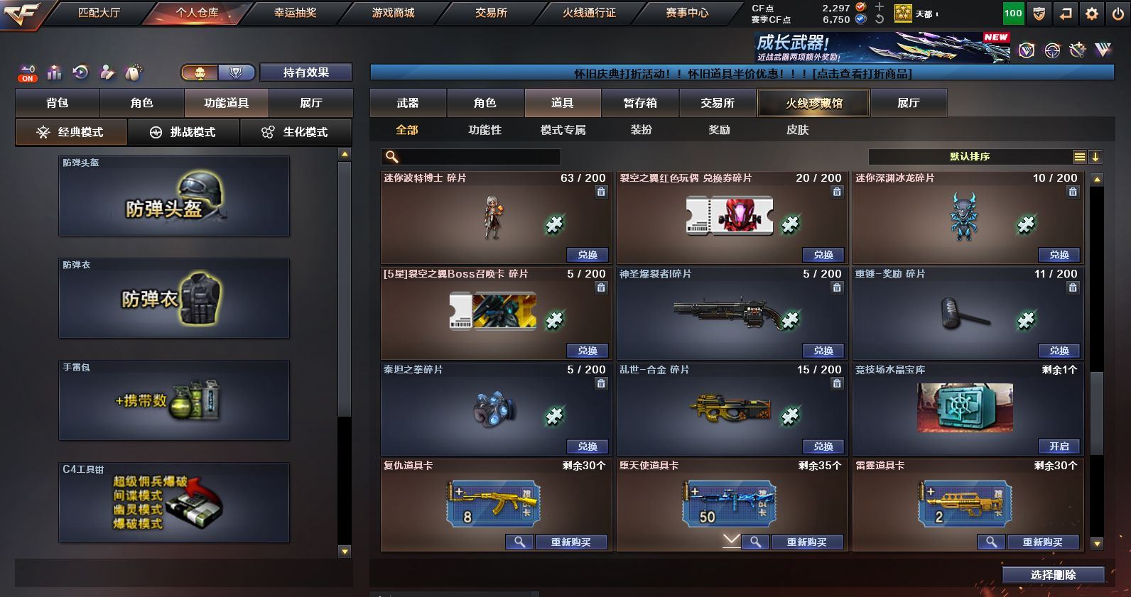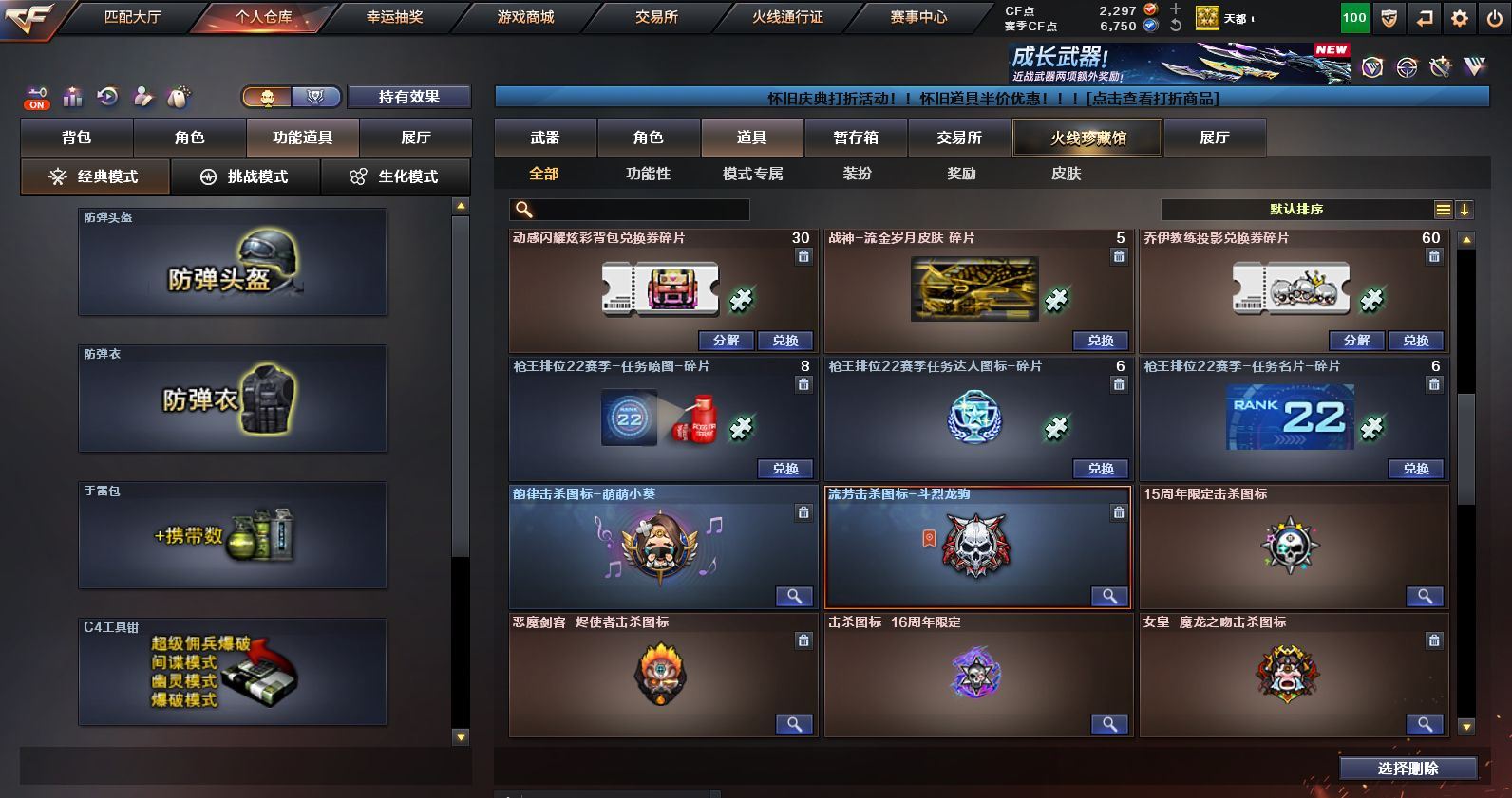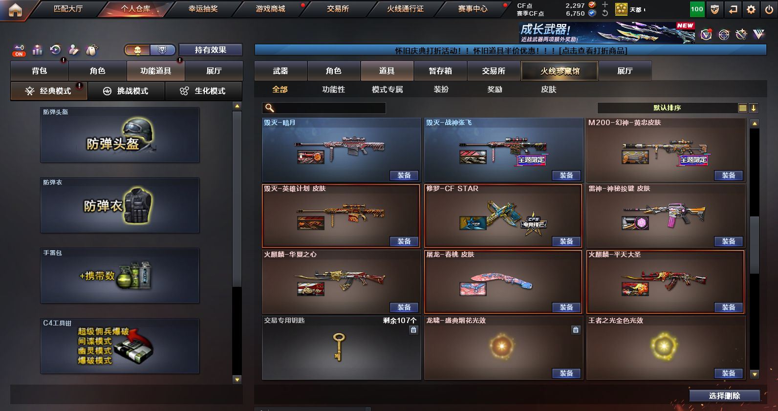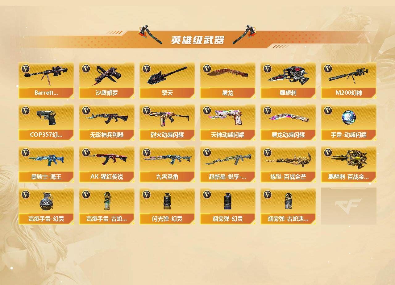 可二次可排位 浙江一区-45V-1王者武器数-1炫金武器数【热门武器】:M200-幻神,金色蔷薇-古蛇迷踪,修罗-古蛇迷踪,QBZ03-街机,金色小号,M4A1-黑骑士,雷神-小红,COP 357-幻灵*2,沙鹰-修罗*2,金刚伞【王者炫金武器】:炫金火麒麟【音效卡】:M4A1-黑骑士音效卡,Barrett-毁灭音效卡,九霄圣角音效卡,M4A1-苍鸣雷神音效卡,白虎-盛典舞曲音效卡,炼狱-百战金芒-庆典舞曲音效卡【皮肤】:M200-幻神-黄忠皮肤,M200-幻神-荣耀世冠白鲨,QBZ03-巅峰荣耀皮肤,雷神-暗月,M4A1-战神赵云,雷神-维纳斯皮肤,雷神-高能霹雳 皮肤,雷神-源计划2.0专属 皮肤,M4A1-再燃火线,雷神-神秘按键 皮肤,火麒麟-雷神,火麒麟-华夏之心,火麒麟-平天大圣,毁灭-暗月,毁灭-战神张飞,毁灭-英雄计划 皮肤,黑骑士-地狱火,九霄圣角-高洁仙镜 皮肤,修罗-百战金芒 皮肤,屠龙-春桃 皮肤,轻型军用手斧-再燃火线【角色】:4防影豹,关小雨,零·纪元,4防王者鹰,蛇隐宗,乔伊教练,修道士,云海玲珑,葵-阿尔法武装,暗夜-X,初恋灵狐,虎妞,嘉年华灵狐,麻雀,曼陀罗-X,潘多拉-X,潘多拉-甜心教官,蛇姬,斯沃特-X,蜀雪,雪莉杨-摸金校尉,影武者-X【人偶武器】:雷神-小红,王者Barrett-英勇金戈,AWM-灵狐-15周年嘉年华,迷你裂空之翼,迷你牛牛,生化手雷-机甲核心,迷你超能女侍【暴走生化】:黑龙吞噬者,超级对讲机【挑战大师】:AK47-冰龙粉碎者,冰龙粉碎者-白马银枪,激光毁灭者III-白马银枪*2【英雄级武器】:AK47-火麒麟,M4A1-雷神*2,M4A1-黑骑士,AK12-天启,无影-神兵利器,金色蔷薇-古蛇迷踪,九霄圣角,烈火-动感闪耀,超新星-悦享-觉醒版,AK-47-猩红传说*2,黑骑士-海王,机械迷城-穹宇,Barrett-毁灭,M200-幻神,炼狱-百战金芒,沙鹰-修罗*2,COP 357-幻灵*2,天神-动感闪耀,修罗-古蛇迷踪,屠龙,擎天,麒麟刺,屠龙-动感闪耀,麒麟刺-百战金芒,屠龙-斗烈龙驹,龙啸-烈火龙威,高爆手雷-幻灵*3,手雷-动感闪耀,高爆手雷-古蛇迷踪,闪光弹-幻灵*3,烟雾弹-幻灵*3,烟雾弹-古蛇迷踪,AK47-竞魂无影【源级武器】:御·火麒麟-平天大圣,火麒麟-雷神,源-黑龙,源·雷神,魂·M4A1-雷神-化蛇*2,魂·雷神-神秘按键,魂·雷神-维纳斯,魂·雷神-新春神龙,魂-雷神-萌杀,魂·雷神-15周年嘉年华,魂·雷神-萌柴,御·雷神-机甲刑天,御·雷神-烈虎,M4A1-十二生肖·龙-雷神,源·黑骑士*2,魂·黑骑士-摸金校尉,魂·黑骑士-现代金属,魂·黑骑士-幻能朋克,魂·黑骑士-破浪10年,魂·黑骑士-娜塔莉娅,御·黑骑士-冰魄,御·黑骑士·哪吒闹海,魂-死神-机甲核心,源·AK47-黑武士,魂·黑武士-锋芒破茧,源·天启,源·超新星,御·超新星-圣诞,源·武圣*2,源·机械迷城,魂·龙血-锋芒破茧*2,灵·HK417-朱雀-甜蜜火力,源·HK417-朱雀,白虎-九尾白狐,源-金色蔷薇*2,金色蔷薇-狼王,魂·QBZ03-金色蔷薇-古蛇迷踪,魂·QBZ03-金色蔷薇-萌杀,魂·QBZ03-金色蔷薇-蛇姬,源·玫瑰精灵,源-极光,Barrett-极光-掌火,魂·天龙-彼岸花,AWM-裁决-百城联赛天津,魂·裁决-凤灵*2,魂·裁决-神秘按键,魂·裁决-新人王绿豆*2,魂·裁决-羽掣*2,魂·毁灭-航天科技*2,魂·毁灭-秦师,魂·毁灭-青帝,魂·毁灭-神秘黑洞*2,御·毁灭-黑大圣*2,魂·Barrett-金色蔷薇-蛇姬,灵·Barrett-金色蔷薇-甜蜜火力,魂·Barrett-朱雀-锦鲤,魂·Barrett-朱雀- 新春神龙,源·Barrett-朱雀,灵·Barrett-朱雀-炫光*2,魂·炼狱-玩具枪*2,魂·炼狱-月*3,魂·炼狱-蒸汽钟表*2,加特林-炼狱-掌火,御·炼狱-女娲,魂·修罗-15周年嘉年华,魂·修罗-迷彩,灵·天神-穹宇,源·武圣glock,魂·屠龙-春桃,魂·擎天-破浪10年,源·擎天-萌杀,源·龙啸*4,魂·麒麟刺-月,灵·麒麟刺-穹宇【道具】:CFS限定背包,EDG炫彩背包,亚洲杯纪念炫彩背包,古蛇迷踪炫彩背包,百战金芒炫彩背包,超级背包,女皇终结者-魔龙之吻,绿色巨人,灵魂忍者,变异宝贝,妖姬,迷雾幽灵,夺命之镰,防化服*2,金色流光-枪王排位*2,星辰流光-枪王排位,枪王排位28赛季金色流光,语音特效-盛典烟火,古蛇迷踪打击特效,蛇隐宗表情,萌萌小葵表情,电玩兔兔表情,动感闪耀表情,防弹头盔*5,防弹衣*6,C4工具钳*5,手雷包*5【特殊枪械】:1黑骑士各种道具