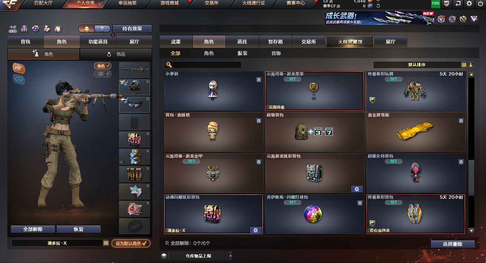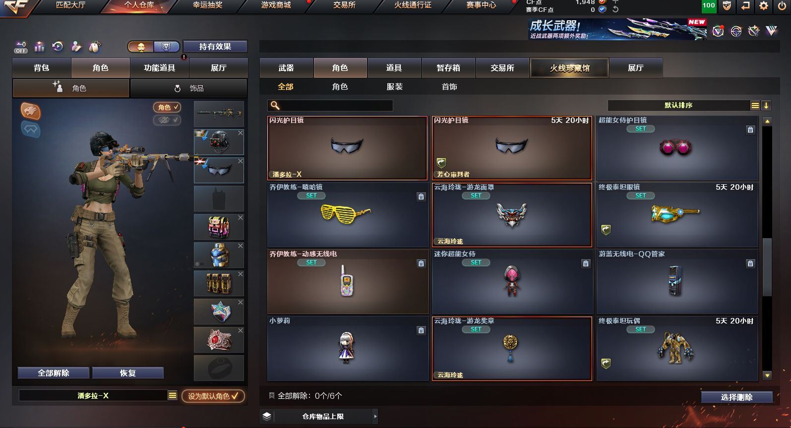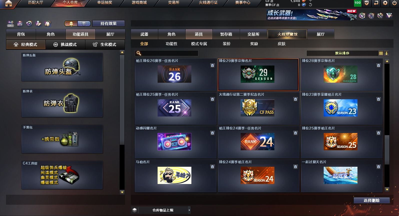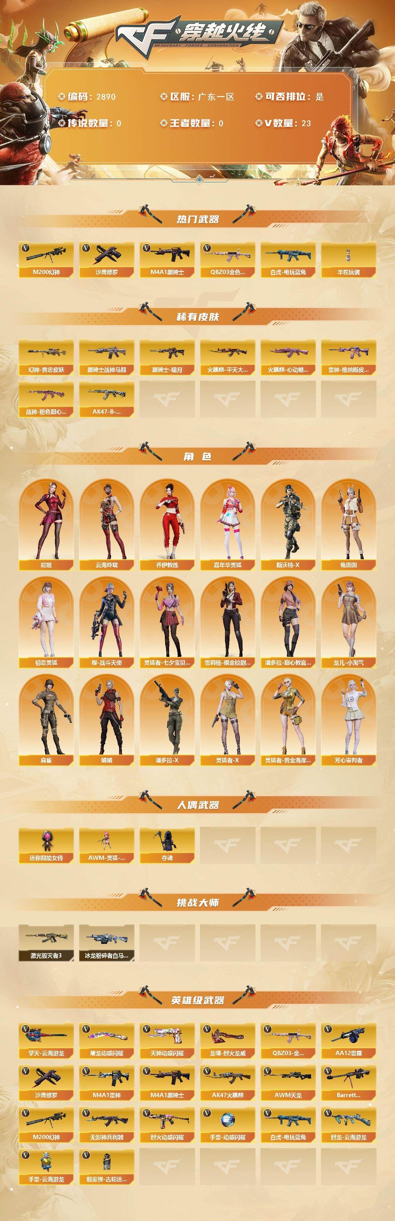 可二次可排位 广东一区-23V-0王者武器数-0炫金武器数【热门武器】:QBZ03-金色蔷薇,M200-幻神,白虎-电玩蓝兔,M4A1-黑骑士,羊驼玩偶,沙鹰-修罗【皮肤】:M200-幻神-黄忠皮肤,雷神-维纳斯皮肤,火麒麟-平天大圣*2,火麒麟-心动糖果,黑骑士-暗月,黑骑士-战神马超,战神-粉色甜心皮肤,AK47-B-常胜将军-刘备【角色】:乔伊教练,云海玲珑,初恋灵狐,芳心审判者,嘉年华灵狐,娟娟,灵狐者-X,灵狐者-黄金海岸,灵狐者-七夕宝贝,龙儿-小淘气,麻雀,潘多拉-X,潘多拉-甜心教官,蛇姬,斯沃特-X,兔囡囡,雪莉杨-摸金校尉,樱-战斗天使【人偶武器】:AWM-灵狐-15周年嘉年华,夺魂,迷你超能女侍【挑战大师】:冰龙粉碎者-白马银枪,激光毁灭者III*2【英雄级武器】:AK47-火麒麟*2,M4A1-雷神,M4A1-黑骑士,无影-神兵利器,QBZ03-金色蔷薇,烈火-动感闪耀,白虎-电玩蓝兔,AWM-天龙,Barrett-毁灭,M200-幻神,烈龙-云海游龙,AA-12-雷霆,沙鹰-修罗,天神-动感闪耀,屠龙-动感闪耀,擎天-云海游龙,龙啸-烈火龙威,手雷-动感闪耀,手雷-云海游龙,烟雾弹-古蛇迷踪【源级武器】:源·超新星,魂·HK417-朱雀-凤灵,魂·屠龙-都是Cfer,源·擎天-萌杀,魂·麒麟刺-神秘黑洞【道具】:云海游龙炫彩背包,背包-洛丽塔,超级背包,绿色巨人,灵魂忍者,迷雾幽灵,夺命之镰,防化服*2,金色流光-枪王排位*2,星辰流光-枪王排位,枪王排位28赛季金色流光,电玩兔兔表情,动感闪耀表情,云海游龙表情,防弹头盔*2,防弹衣*2,C4工具钳*2,手雷包*2【特殊枪械】:1黑骑士,各种道具详情看截图、低价出售找回包 赔、截图展示段位不代 表实际段位,如赛季更新等不可抗拒因素发生变化、时限道具不保证所剩时间、标题未写送点劵默认不送【卖号买号首选亿梦】