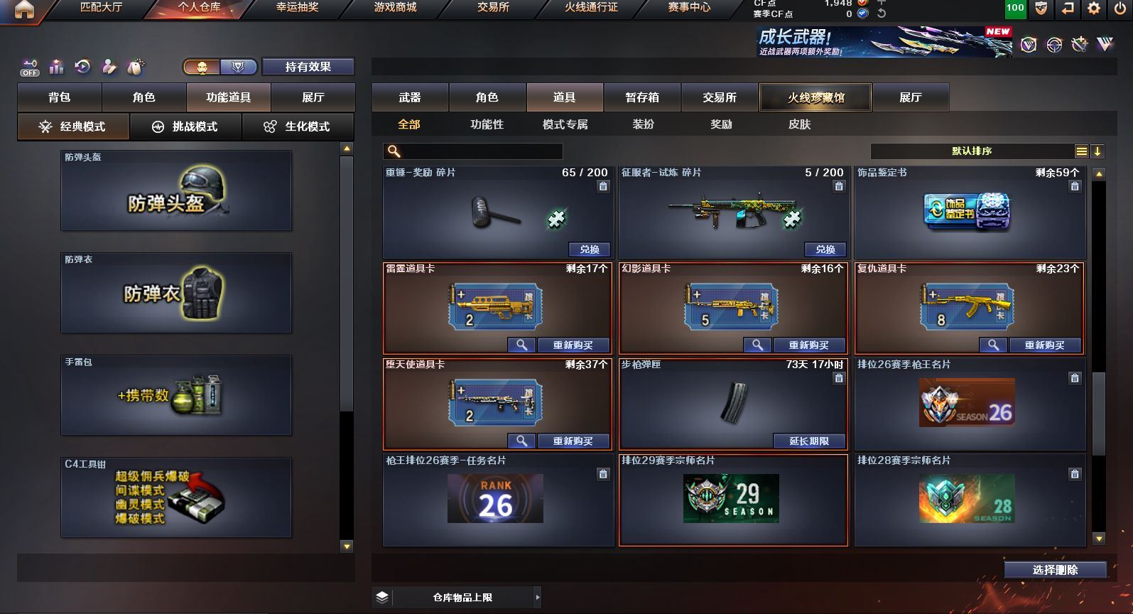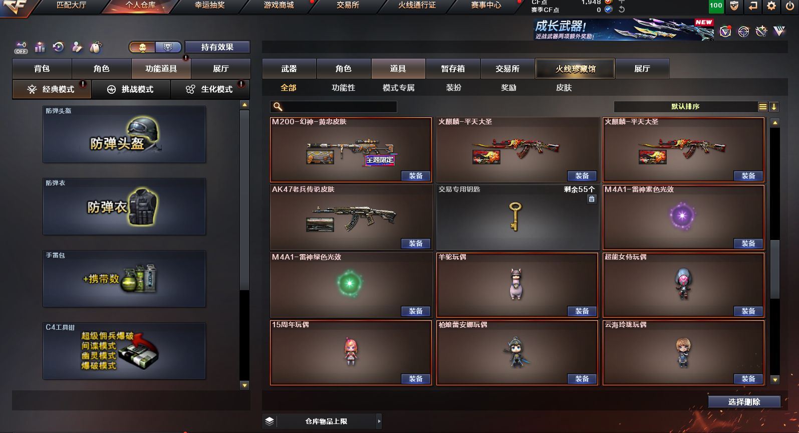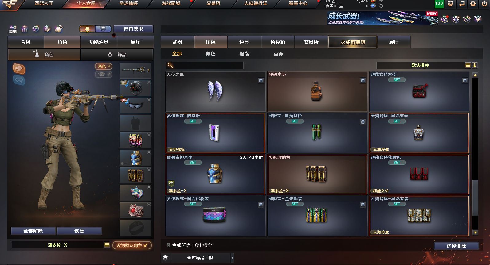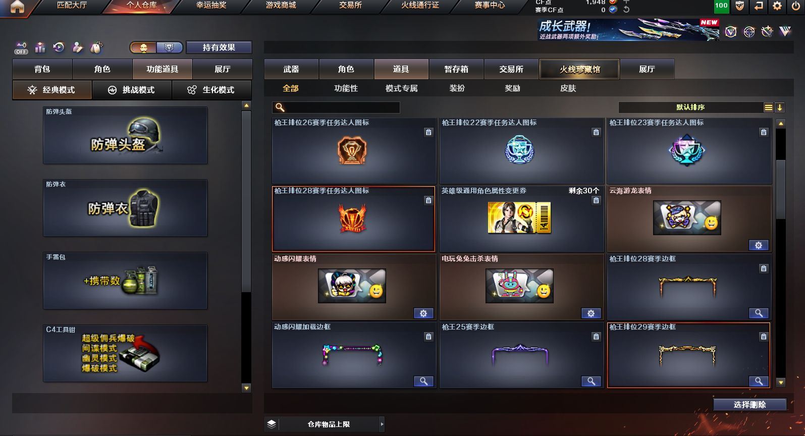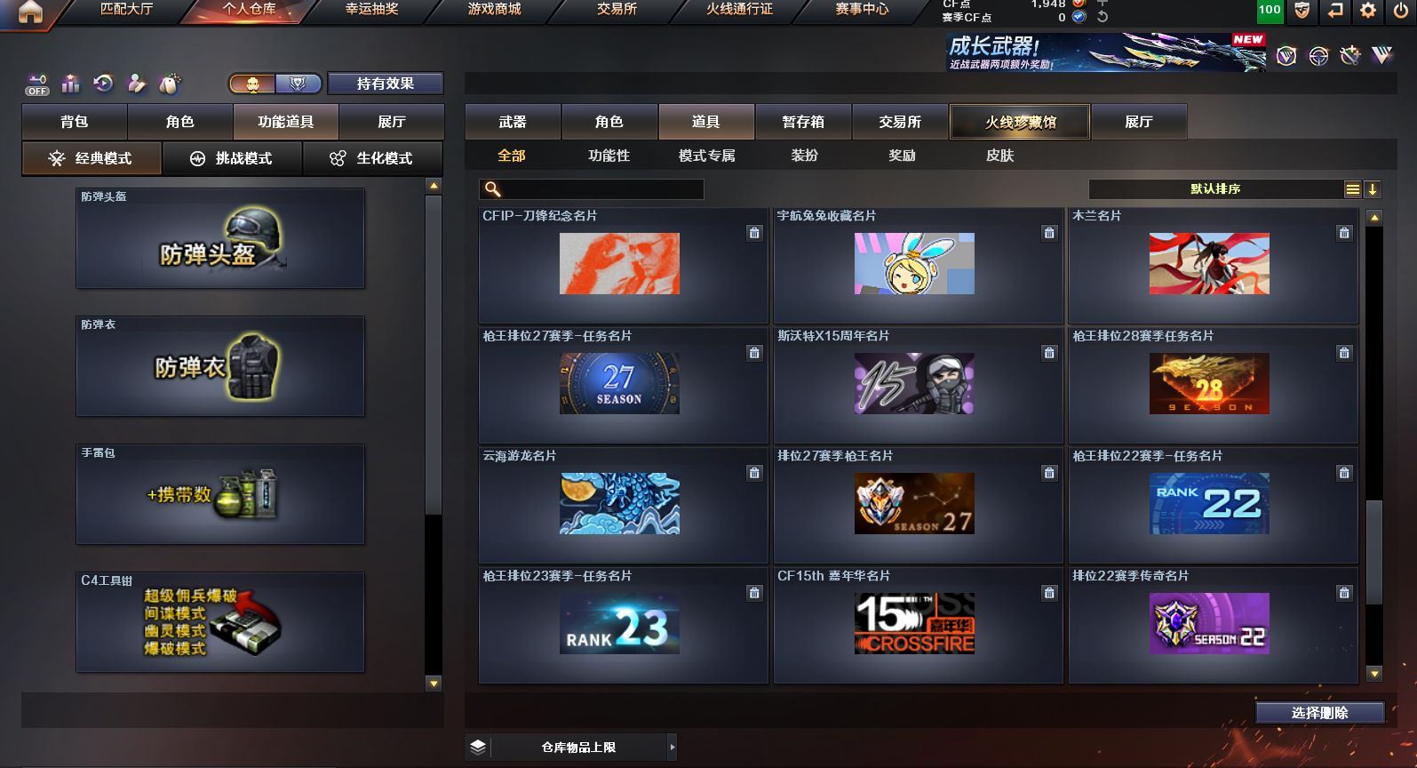 可二次可排位 广东一区-23V-0王者武器数-0炫金武器数【热门武器】:QBZ03-金色蔷薇,M200-幻神,白虎-电玩蓝兔,M4A1-黑骑士,羊驼玩偶,沙鹰-修罗【皮肤】:M200-幻神-黄忠皮肤,雷神-维纳斯皮肤,火麒麟-平天大圣*2,火麒麟-心动糖果,黑骑士-暗月,黑骑士-战神马超,战神-粉色甜心皮肤,AK47-B-常胜将军-刘备【角色】:乔伊教练,云海玲珑,初恋灵狐,芳心审判者,嘉年华灵狐,娟娟,灵狐者-X,灵狐者-黄金海岸,灵狐者-七夕宝贝,龙儿-小淘气,麻雀,潘多拉-X,潘多拉-甜心教官,蛇姬,斯沃特-X,兔囡囡,雪莉杨-摸金校尉,樱-战斗天使【人偶武器】:AWM-灵狐-15周年嘉年华,夺魂,迷你超能女侍【挑战大师】:冰龙粉碎者-白马银枪,激光毁灭者III*2【英雄级武器】:AK47-火麒麟*2,M4A1-雷神,M4A1-黑骑士,无影-神兵利器,QBZ03-金色蔷薇,烈火-动感闪耀,白虎-电玩蓝兔,AWM-天龙,Barrett-毁灭,M200-幻神,烈龙-云海游龙,AA-12-雷霆,沙鹰-修罗,天神-动感闪耀,屠龙-动感闪耀,擎天-云海游龙,龙啸-烈火龙威,手雷-动感闪耀,手雷-云海游龙,烟雾弹-古蛇迷踪【源级武器】:源·超新星,魂·HK417-朱雀-凤灵,魂·屠龙-都是Cfer,源·擎天-萌杀,魂·麒麟刺-神秘黑洞【道具】:云海游龙炫彩背包,背包-洛丽塔,超级背包,绿色巨人,灵魂忍者,迷雾幽灵,夺命之镰,防化服*2,金色流光-枪王排位*2,星辰流光-枪王排位,枪王排位28赛季金色流光,电玩兔兔表情,动感闪耀表情,云海游龙表情,防弹头盔*2,防弹衣*2,C4工具钳*2,手雷包*2【特殊枪械】:1黑骑士,各种道具详情看截图、低价出售找回包 赔、截图展示段位不代 表实际段位,如赛季更新等不可抗拒因素发生变化、时限道具不保证所剩时间、标题未写送点劵默认不送【卖号买号首选亿梦】