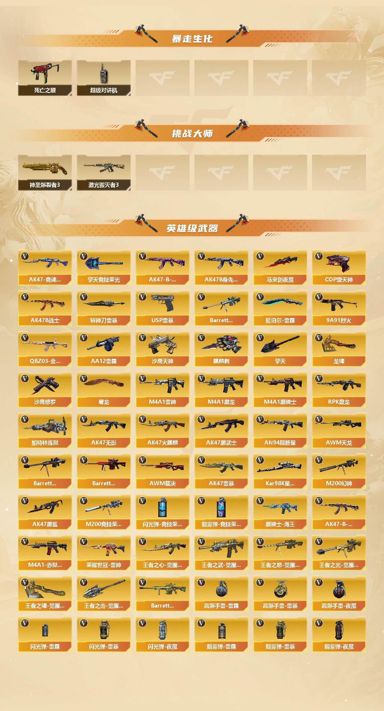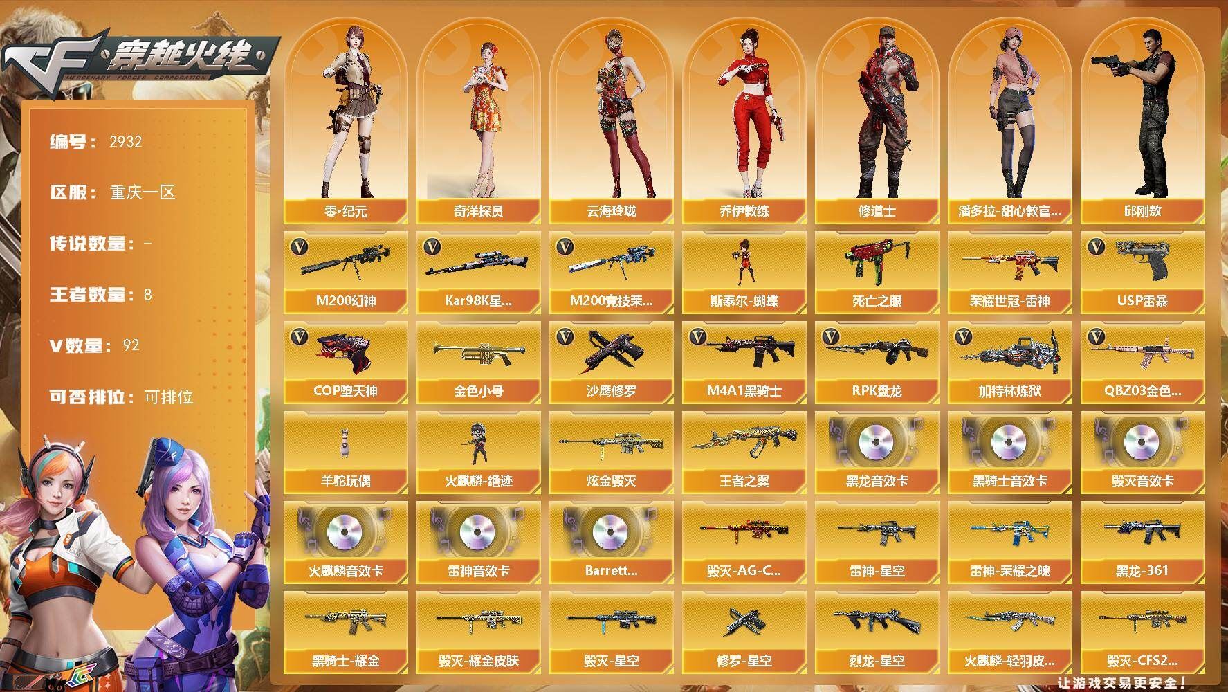 可二次可排位重庆一区-92V【热门武器】:QBZ03-金色蔷薇,M200-幻神,M200-竞技荣光,死亡之眼,荣耀世冠-雷神,Kar98K-星神,金色小号,M4A1-黑骑士,RPK-盘龙*2,加特林-炼狱,斯泰尔-蝴蝶,羊驼玩偶,火麒麟-绝迹,USP-雷暴,COP-堕天神,沙鹰-修罗*2【王者炫金武器】:王者之翼,炫金毁灭【音效卡】:AK47-火麒麟音效卡,M4A1-雷神音效卡,M4A1-黑龙音效卡,M4A1-黑骑士音效卡,Barrett-毁灭音效卡,Barrett-碧霄极光音效卡【皮肤】:烈龙-星空*2,雷神-暗月,雷神-荣耀之魄,雷神-星空,雷神-虎将,火麒麟-冠军之心,火麒麟-华夏之心,火麒麟-轻羽皮肤,火麒麟-平天大圣,毁灭-荣耀之怒,毁灭耀金皮肤,毁灭-星空*2,毁灭-冠军之怒,毁灭-AG-CFPLS15冠军,毁灭-CFS2020,毁灭-风暴*2,M4A1-千变-孔明皮肤,黑龙-能量核心,M4A1-黑龙-361,黑骑士耀金皮肤,无影-能量核心,战神-粉色甜心皮肤,战神-紫绶金章皮肤,战神-流金岁月皮肤*7,AK47-B-常胜将军-曹操,AK47-B-常胜将军-孙权,AWM-天龙-传奇70KG*2,AWM-天龙-传奇白鲨,极光-能量核心,修罗-星空,屠龙-荣耀之锋*2【角色】:樱,魅影,零·纪元,奇洋探员,乔伊教练,修道士,云海玲珑,暗夜-X,风暴女,娟娟,灵狐者-X,灵狐者-黄金海岸,潘多拉-X,潘多拉-甜心教官,邱刚敖,铁骑荣耀,新娜塔莎,雪莉杨,影武者-X,职业选手【人偶武器】:火麒麟-绝迹,火麒麟-灵狐*3,斯泰尔-蝴蝶,COP-旗袍,闪光弹-小乔,闪光弹-貂蝉,高爆手雷-大乔【暴走生化】:死亡之眼,超级对讲机【挑战大师】:神圣爆裂者III,激光毁灭者III*2【英雄级武器】:AK47-火麒麟,M4A1-黑龙*2,M4A1-雷神*2,M4A1-黑骑士,AK47-无影,AK47-黑武士,AN94-超新星,AK47-黑鲨*3,AK47-雷暴,QBZ03-金色蔷薇,9A91-烈火,王者之心-觉醒版,王者之武-觉醒版,AK47-B-战神,黑骑士-海王,AK47-B-常胜将军,荣耀世冠-雷神,AK47-B-身先士卒,AK47-B-战士*2,AWM-天龙*4,Barrett-毁灭*3,Barrett-极光,AWM-裁决*3,M200-幻神,Kar98K-星神,M200-竞技荣光,王者之怒-觉醒版,王者之光-觉醒版,Barrett-暗月传说,RPK-盘龙*2,加特林-炼狱,AA-12-雷霆,沙鹰-修罗*2,沙鹰-天神*3,USP-雷暴,COP-堕天神,屠龙*2,龙啸,马来剑-夜魔,擎天,麒麟刺*2,尼泊尔-雷霆,擎天-竞技荣光*2,斩神刀-雷暴,王者之啸-觉醒版,王者之击-觉醒版*2,高爆手雷-雷霆,高爆手雷-雷暴*5,高爆手雷-夜魔,闪光弹-雷霆,闪光弹-雷暴*5,闪光弹-夜魔,闪光弹-竞技荣光,烟雾弹-雷霆,烟雾弹-雷暴*5,烟雾弹-夜魔,烟雾弹-竞技荣光*2,M4A1-赤狱骑士,AK47-竞魂无影,Barrett-碧霄极光【源级武器】:源·火麒麟,源·雷神,魂·雷神-神秘按键,御·雷神-机甲刑天,御·雷神-烈虎,御·雷神-小白龙*2,魂·黑骑士-现代金属,源·猎神,魂·裁决-凤灵,源·毁灭,魂·毁灭-神秘黑洞,御·毁灭-葫芦兄弟,魂·Barrett-朱雀-锦鲤,灵·Barrett-朱雀-炫光,源-擎天*2【道具】:AG战队炫彩背包,R.LGD炫彩背包,XROCK炫彩背包,冰冰企鹅背包-猛男专用,战舰背包,炫彩背包,老虎背包,虎牙炫彩背包,超级背包,女皇终结者-魔龙之吻,绿色巨人,变异宝贝,夺命之镰*3,防化服*3,电玩兔兔表情,动感闪耀表情,EP战队名片,EP战队击杀图标,C4-红龙,防弹头盔*5,防弹衣*4,C4工具钳*3,手雷包*3【特殊枪械】:蝴蝶斯泰尔+0烈龙,1黑骑士,2盘龙,1炼狱,1蝴蝶斯泰尔,各种道具详情看截图、低价出售找回包 赔、截图展示段位不代 表实际段位,如赛季更新等不可抗拒因素发生变化、时限道具不保证所剩时间、标题未写送点劵默认不送【卖号买号首选亿梦】