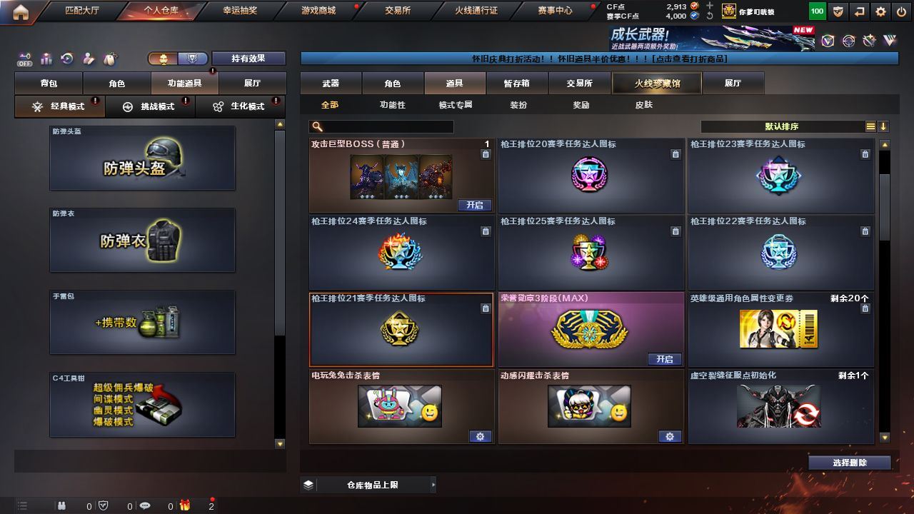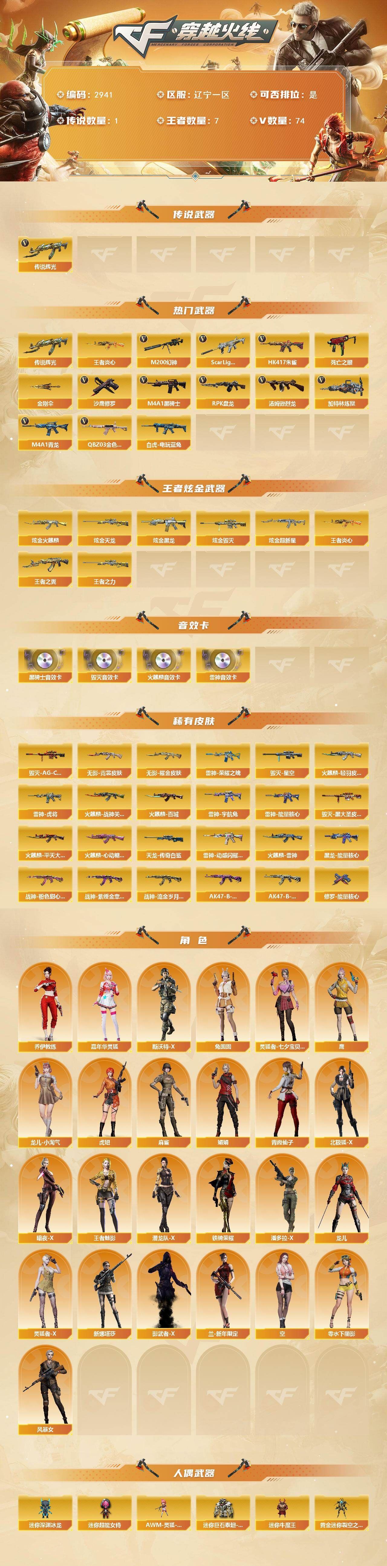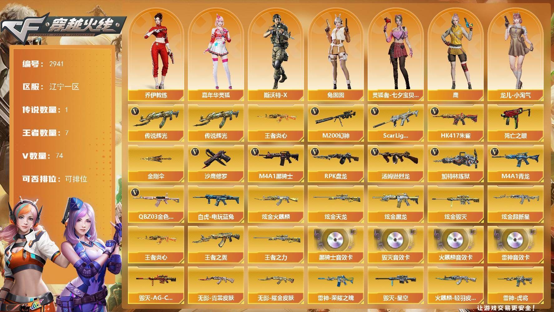 可二次可排位辽宁一区-78V【传说武器】:传说辉光【热门武器】:传说辉光,QBZ03-金色蔷薇,Scar Light-白虎,HK417-朱雀,M4A1-青龙,M200-幻神,死亡之眼*2,白虎-电玩蓝兔,王者炎心,M4A1-黑骑士,汤姆逊-烈龙*6,RPK-盘龙,加特林-炼狱,沙鹰-修罗*4,金刚伞【王者炫金武器】:王者炎心,王者之翼,王者之力,炫金火麒麟,炫金黑龙,炫金超新星,炫金毁灭,炫金天龙【音效卡】:AK47-火麒麟音效卡,M4A1-雷神音效卡,M4A1-黑骑士音效卡,Barrett-毁灭音效卡【皮肤】:雷神-能量核心,雷神-荣耀之魄,雷神-虎将,雷神-宇航兔皮肤,雷神-动感闪耀 皮肤,火麒麟-雷神,火麒麟-轻羽皮肤,火麒麟-战神关羽,火麒麟-平天大圣,火麒麟-百城,火麒麟-心动糖果,毁灭-星空,毁灭-AG-CFPLS15冠军,毁灭-黑大圣皮肤,黑龙-能量核心,无影耀金皮肤,无影-霓裳皮肤,战神-粉色甜心皮肤*4,战神-紫绶金章皮肤*4,战神-流金岁月皮肤*3,AK47-B-常胜将军-曹操,AK47-B-常胜将军-刘备*2,AWM-天龙-传奇白鲨,修罗-能量核心【角色】:鹰,王者-魅影,乔伊教练,空,暗夜-X,北极狐-X,风暴女,虎妞,嘉年华灵狐,娟娟,兰-新年限定,零-水下丽影,灵狐者-X,灵狐者-七夕宝贝,龙儿,龙儿-小淘气,麻雀,潘多拉-X,潜龙队-X,青霞仙子,斯沃特-X,铁骑荣耀,兔囡囡,新娜塔莎,影武者-X【人偶武器】:AWM-灵狐-15周年嘉年华,迷你深渊冰龙,迷你牛魔王,黄金迷你裂空之翼,迷你波特博士,夺魂,迷你牛牛,深渊终结者手雷,闪光弹-小乔,闪光弹-貂蝉,高爆手雷-大乔,迷你超能女侍,迷你巨石泰坦-魔花研究所,灵狐娃娃手雷【暴走生化】:死亡之眼*2,超级对讲机【挑战大师】:AK47-冰龙粉碎者,冰龙粉碎者-白马银枪*2,激光毁灭者III-白马银枪,激光毁灭者III*2,神圣爆裂者-末日III【英雄级武器】:AK47-火麒麟*2,M4A1-黑龙,M4A1-雷神*2,M4A1-黑骑士,AK47-无影,M4A1-死神,AK47-黑武士,AK12-天启,AN94-超新星,AK47-机械迷城,AK47-黑鲨,M4A1-龙血,M4A1-青龙,HK417-朱雀,Scar Light-白虎,无影-神兵利器,QBZ03-金色蔷薇,9A91-烈火,烈火-动感闪耀,王者之魄-觉醒版,AK-47-猩红传说,AK47-B-战神,AK47-B-常胜将军,M4A1-雷霆王者-觉醒版,白虎-电玩蓝兔,AK47-B-身先士卒,AWM-天龙,Barrett-毁灭*2,AWM-裁决,M200-幻神,Barrett-金色蔷薇,王者星神-觉醒版,Barrett-暗月传说,RPK-盘龙,加特林-炼狱,汤姆逊-烈龙*6,AA-12-雷霆,沙鹰-修罗*4,沙鹰-天神*3,天神-动感闪耀,屠龙*4,龙啸,马来剑-夜魔,擎天*2,麒麟刺,屠龙-动感闪耀,斩神刀-雷暴,王者之锋-觉醒版,龙啸-烈火龙威,高爆手雷-雷暴*2,高爆手雷-夜魔,手雷-动感闪耀,闪光弹-雷暴*2,闪光弹-夜魔,烟雾弹-雷暴*2,烟雾弹-夜魔,M4A1-赤狱骑士,AK47-竞魂无影【道具】:全能枪王背包,战舰背包,炫彩背包,虎牙炫彩背包,超级背包,哔哩哔哩名片,绿色巨人,灵魂忍者,迷雾幽灵,夺命之镰,防化服*3,金色流光-枪王排位,电玩兔兔表情,动感闪耀表情,C4-红龙,防弹头盔*5,防弹衣*8,C4工具钳*5,手雷包*6【特殊枪械】:1白虎,1黑骑士,6烈龙,1盘龙,1炼狱,各种道具详情看截图、低价出售找回包 赔、截图展示段位不代 表实际段位,如赛季更新等不可抗拒因素发生变化、时限道具不保证所剩时间、标题未写送点劵默认不送【卖号买号首选亿梦】
