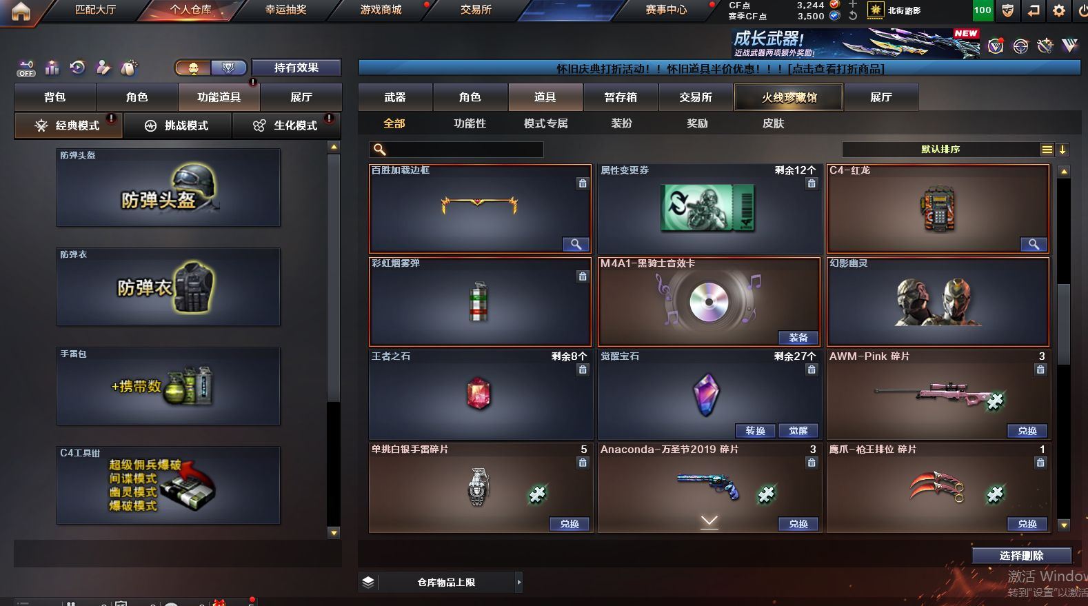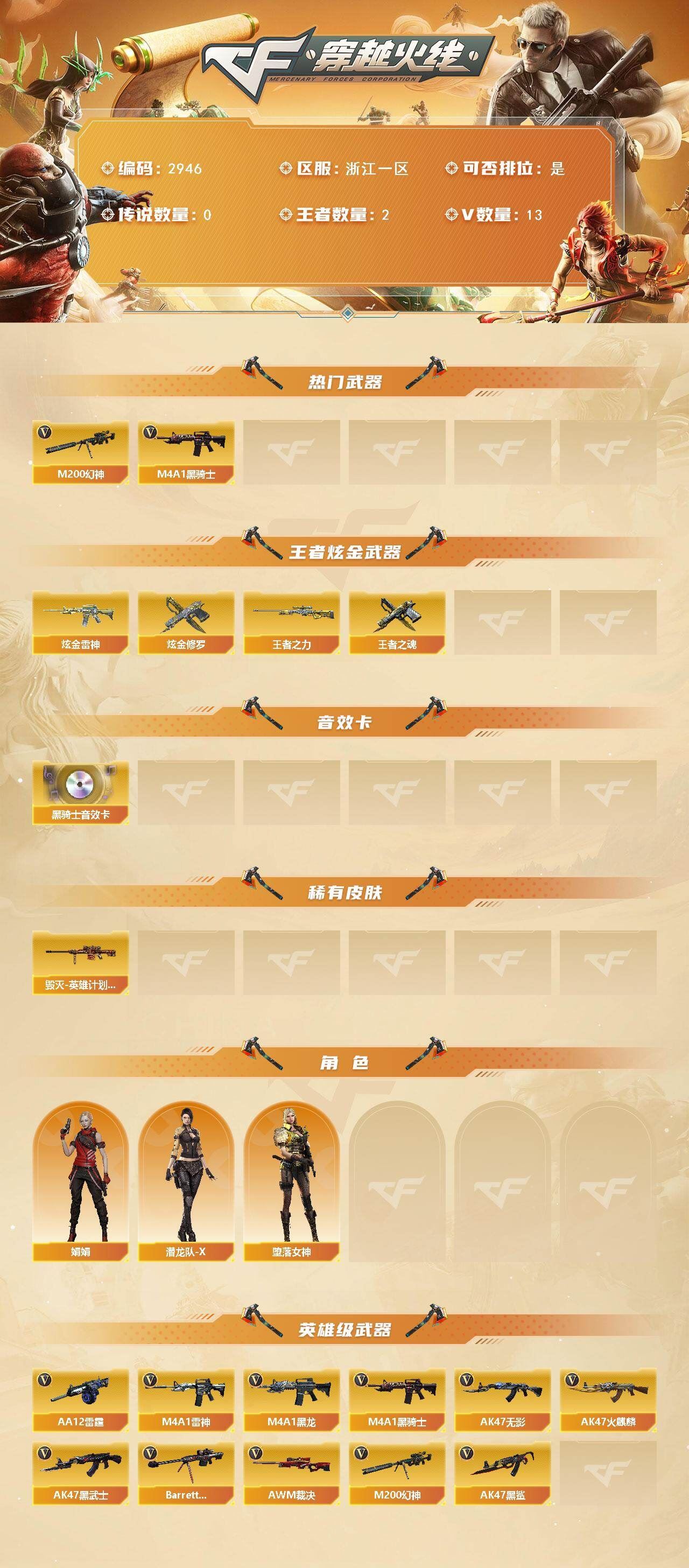 可二次可排位 浙江一区-13V-2王者武器数-2炫金武器数【热门武器】:M200-幻神,M4A1-黑骑士*2【王者炫金武器】:王者之力,王者之魂,炫金雷神,炫金修罗【音效卡】:M4A1-黑骑士音效卡【皮肤】:毁灭-英雄计划 皮肤【角色】:堕落女神,娟娟,潜龙队-X【英雄级武器】:AK47-火麒麟,M4A1-黑龙,M4A1-雷神,M4A1-黑骑士*2,AK47-无影,AK47-黑武士,AK47-黑鲨,Barrett-毁灭,AWM-裁决*2,M200-幻神,AA-12-雷霆【源级武器】:源·火麒麟*2,源·雷神*2,源·黑骑士,源·AK47-黑武士,源·青龙,源·天龙,源·Barrett-朱雀,魂·天神-宇航兔兔【道具】:绿色巨人,灵魂忍者,迷雾幽灵,夺命之镰,防化服*2,C4-红龙,防弹头盔*2,防弹衣*2,C4工具钳*2,手雷包*2【特殊枪械】:2黑骑士,各种道具详情看截图、低价出售找回包 赔、截图展示段位不代 表实际段位,如赛季更新等不可抗拒因素发生变化、时限道具不保证所剩时间、标题未写送点劵默认不送【卖号买号首选亿梦】