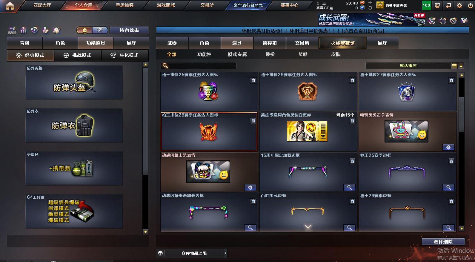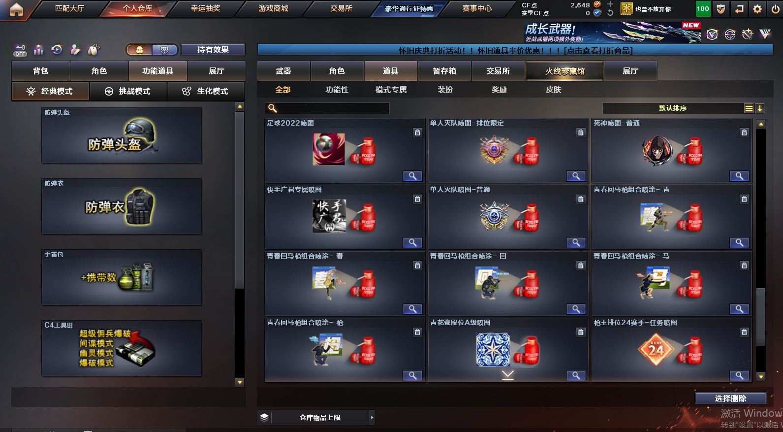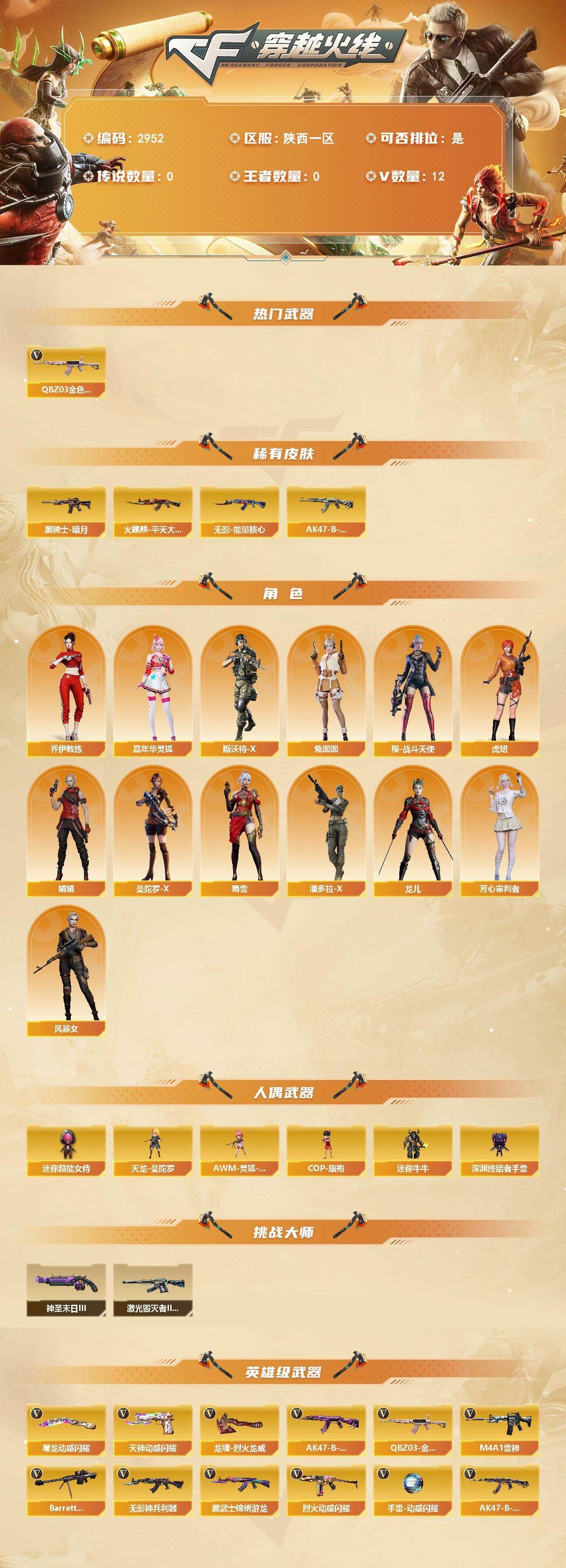可二次可排位 陕西一区-12V-0王者武器数-0炫金武器数【热门武器】:QBZ03-金色蔷薇【皮肤】:火麒麟-平天大圣,黑骑士-暗月,无影-能量核心,AK47-B-常胜将军-刘备【角色】:乔伊教练,芳心审判者,风暴女,虎妞,嘉年华灵狐,娟娟,龙儿,曼陀罗-X,潘多拉-X,斯沃特-X,蜀雪,兔囡囡,樱-战斗天使【人偶武器】:天龙-曼陀罗,AWM-灵狐-15周年嘉年华,COP-旗袍,迷你牛牛,深渊终结者手雷,迷你超能女侍【挑战大师】:激光毁灭者III-白马银枪,神圣爆裂者-末日III【英雄级武器】:M4A1-雷神,无影-神兵利器,黑武士-锦绣游龙,QBZ03-金色蔷薇,烈火-动感闪耀,AK47-B-战神,AK47-B-常胜将军,Barrett-毁灭,天神-动感闪耀,屠龙-动感闪耀,龙啸-烈火龙威,手雷-动感闪耀【源级武器】:源·火麒麟,御·黑龙-龙太子,源·雷神,魂·雷神-维纳斯,魂·雷神-新春神龙,魂-雷神-萌杀,魂·雷神-15周年嘉年华,魂·雷神-萌柴,御·雷神-机甲刑天*2,御·雷神-烈虎*3,M4A1-十二生肖·龙-雷神,源·黑骑士,魂·黑骑士-现代金属*3,魂·黑骑士-幻能朋克*3,魂·黑骑士-破浪10年*4,魂-死神-机甲核心,魂·黑武士-锋芒破茧,源·天启,源·武圣*4,魂·龙血-锋芒破茧*2,M4A1-青龙-掌上穿越火线,源-金色蔷薇,魂·QBZ03-金色蔷薇-萌杀,源·玫瑰精灵*2,源-极光,AWM-裁决-百城联赛天津,魂·裁决-凤灵,魂·裁决-新人王绿豆*2,魂·裁决-羽掣,源·毁灭,魂·毁灭-航天科技*2,魂·毁灭-秦师,魂·毁灭-青帝*3,魂·毁灭-神秘黑洞,御·毁灭-黑大圣,魂·Barrett-朱雀- 新春神龙,源·Barrett-朱雀,灵·Barrett-朱雀-炫光,魂·炼狱-玩具枪,魂·炼狱-月*2,魂·炼狱-蒸汽钟表,御·炼狱-女娲*2,魂·修罗-15周年嘉年华,魂·修罗-神兵利器,魂·修罗-现代金属,源·天神*2,魂·天神-阿努比斯,源·武圣glock*2,魂·屠龙-都是Cfer,魂·擎天-破浪10年,源·擎天-萌杀*2,源·龙啸*2,魂·麒麟刺-神秘黑洞【道具】:全能枪王背包,夺命之镰,防化服,金色流光-枪王排位*2,星辰流光-枪王排位,枪王排位28赛季金色流光,电玩兔兔表情,动感闪耀表情,EP战队名片,防弹头盔*6,防弹衣*6,C4工具钳*6,手雷包*6各种道具详情看截图、低价出售找回包 赔、截图展示段位不代 表实际段位,如赛季更新等不可抗拒因素发生变化、时限道具不保证所剩时间、标题未写送点劵默认不送【卖号买号首选亿梦】
