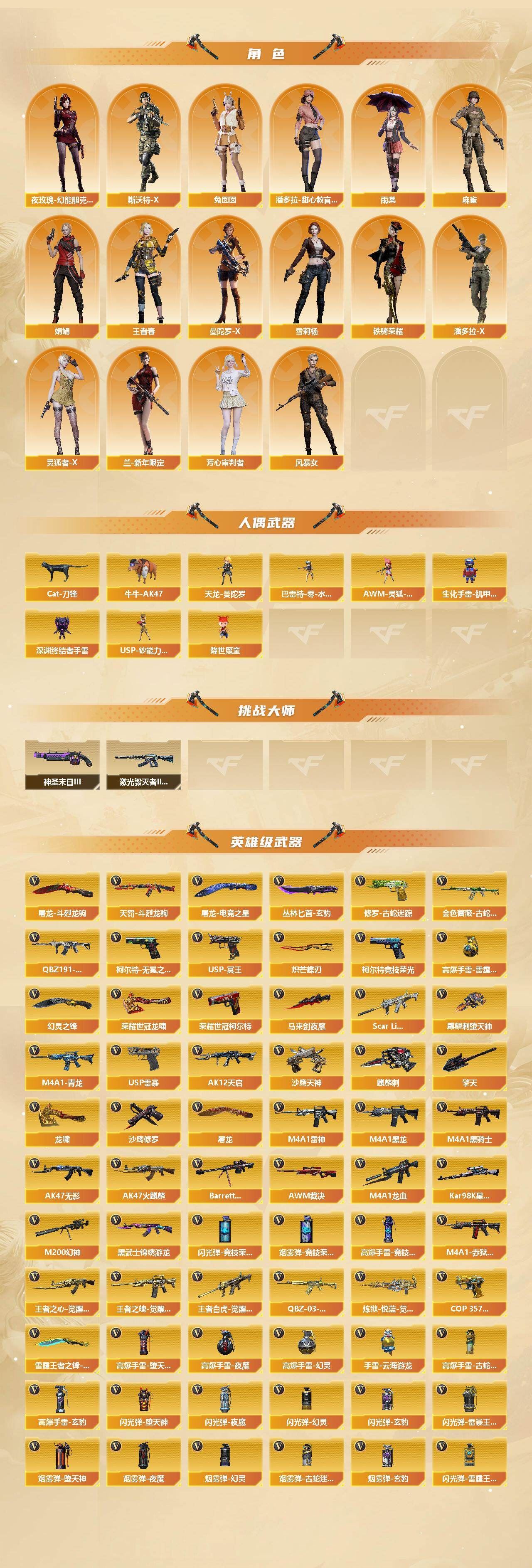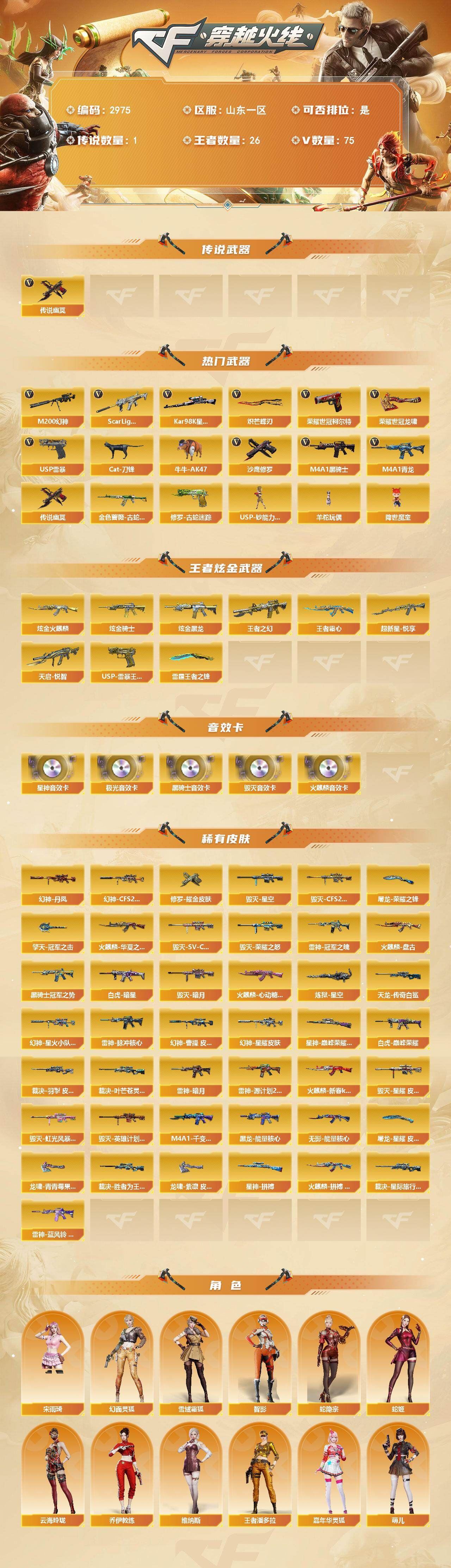 可二次可排位山东一区-75V【传说武器】:传说幽冥【热门武器】:传说幽冥,Scar Light-白虎,M4A1-青龙,M200-幻神,金色蔷薇-古蛇迷踪,修罗-古蛇迷踪,荣耀世冠-柯尔特,Kar98K-星神,Cat-刀锋,牛牛-AK47,M4A1-黑骑士,USP-钞能力灵狐,羊驼玩偶,降世魔童,USP-雷暴*2,沙鹰-修罗,炽芒蝶刃*2,荣耀世冠-龙啸【王者炫金武器】:超新星-悦享,天启-悦智,王者之幻,王者霜心,USP-雷暴王者,雷霆王者之锋,炫金火麒麟,炫金骑士,炫金黑龙【音效卡】:AK47-火麒麟音效卡,M4A1-黑骑士音效卡,Barrett-毁灭音效卡,Barrett-极光音效卡,Kar98K-星神音效卡【皮肤】:幻神-丹凤,幻神-CFS2022,幻神-星耀 皮肤,幻神-星火小队签名臻藏版 皮肤,幻神-曹操 皮肤,Scar Light-白虎-暗星,白虎-巅峰荣耀 皮肤,裁决-羽掣 皮肤,裁决-叶芒苍灵 皮肤,裁决-胜者为王 皮肤,裁决-星际旅行 皮肤,星神-巅峰荣耀 皮肤,星神-拼搏 皮肤,雷神-暗月,雷神-冠军之魄,雷神-脉冲核心,雷神-源计划2.0专属 皮肤,雷神-蓝风铃 皮肤,火麒麟-华夏之心,火麒麟-盘古,火麒麟-新春kwai乐,火麒麟-心动糖果,火麒麟-拼搏 皮肤,毁灭-暗月,毁灭-荣耀之怒,毁灭-星空,毁灭-CFS2020,毁灭-SV-CFPLS16冠军,毁灭-星耀 皮肤,毁灭-虹光风暴 皮肤,毁灭-英雄计划 皮肤,M4A1-千变-孔明皮肤,黑龙-能量核心,黑骑士-冠军之势,无影-能量核心,AWM-天龙-传奇白鲨,炼狱-星空,修罗耀金皮肤,屠龙-荣耀之锋*2,屠龙-星耀 皮肤,龙啸-青青莓果 皮肤,龙啸-紫凛 皮肤,擎天-冠军之击【角色】:雨棠,王者春,王者潘多拉,雪域霜狐,蛇隐宗,乔伊教练,云海玲珑,幻面灵狐,宋雨琦,芳心审判者,风暴女,嘉年华灵狐,娟娟,兰-新年限定,灵狐者-X,麻雀,曼陀罗-X,萌儿,潘多拉-X,潘多拉-甜心教官,蛇姬,斯沃特-X,铁骑荣耀,兔囡囡,维纳斯,雪莉杨,夜玫瑰-幻能朋克,智影【人偶武器】:天龙-曼陀罗,巴雷特-零-水下丽影,USP-钞能力灵狐,AWM-灵狐-15周年嘉年华,Cat-刀锋,牛牛-AK47,生化手雷-机甲核心,深渊终结者手雷,降世魔童【挑战大师】:激光毁灭者III-白马银枪,神圣爆裂者-末日III【英雄级武器】:AK47-火麒麟,M4A1-黑龙,M4A1-雷神*2,M4A1-黑骑士,AK47-无影,AK12-天启,M4A1-龙血,M4A1-青龙,Scar Light-白虎,黑武士-锦绣游龙,金色蔷薇-古蛇迷踪,QBZ191-银翼,王者之心-觉醒版,王者之魄-觉醒版,王者白虎-觉醒版,QBZ-03-王者蔷薇-觉醒版,HK417-朱雀-电竞之星,机械迷城-穹宇,天罚-斗烈龙驹,Barrett-毁灭,AWM-裁决,M200-幻神,Kar98K-星神,炼狱-悦蓝-觉醒版,沙鹰-修罗,沙鹰-天神*2,USP-雷暴*2,COP 357-雷霆王者-觉醒版,柯尔特-无冕之王,荣耀世冠-柯尔特,柯尔特-竞技荣光,USP-冥王*2,修罗-古蛇迷踪,屠龙*3,龙啸,麒麟刺-堕天神,马来剑-夜魔,擎天*3,麒麟刺,幻灵之锋,炽芒蝶刃*2,荣耀世冠-龙啸,雷霆王者之锋-觉醒版,丛林匕首-玄豹,屠龙-电竞之星,屠龙-斗烈龙驹【道具】:BS战队炫彩背包,CFS限定背包,EP战队炫彩背包,云山科技背包,亚洲杯纪念炫彩背包,全能枪王背包,古蛇迷踪炫彩背包,背包-洛丽塔,裂空之翼背包-金色,超级背包,雪域霜狐炫彩背包,救世主-黑桃战神,绿色巨人,灵魂忍者*2,变异宝贝,迷雾幽灵*2,生化弹匣,夺命之镰,防化服*2,金色流光-枪王排位*2,星辰流光-枪王排位,巅峰赛先锋-金色流光,枪王排位28赛季金色流光,枪王排位29赛季金色流光,语音特效-怀旧,古蛇迷踪打击特效,雪域霜狐表情,蛇隐宗表情,斯沃特表情,EP战队击杀图标,C4-黑曜,C4-红龙,防弹头盔*5,防弹衣*5,C4工具钳*4,手雷包*5【特殊枪械】:1白虎,1黑骑士,各种道具详情看截图、低价出售找回包 赔、截图展示段位不代 表实际段位,如赛季更新等不可抗拒因素发生变化、时限道具不保证所剩时间、标题未写送点劵默认不送【卖号买号首选亿梦】