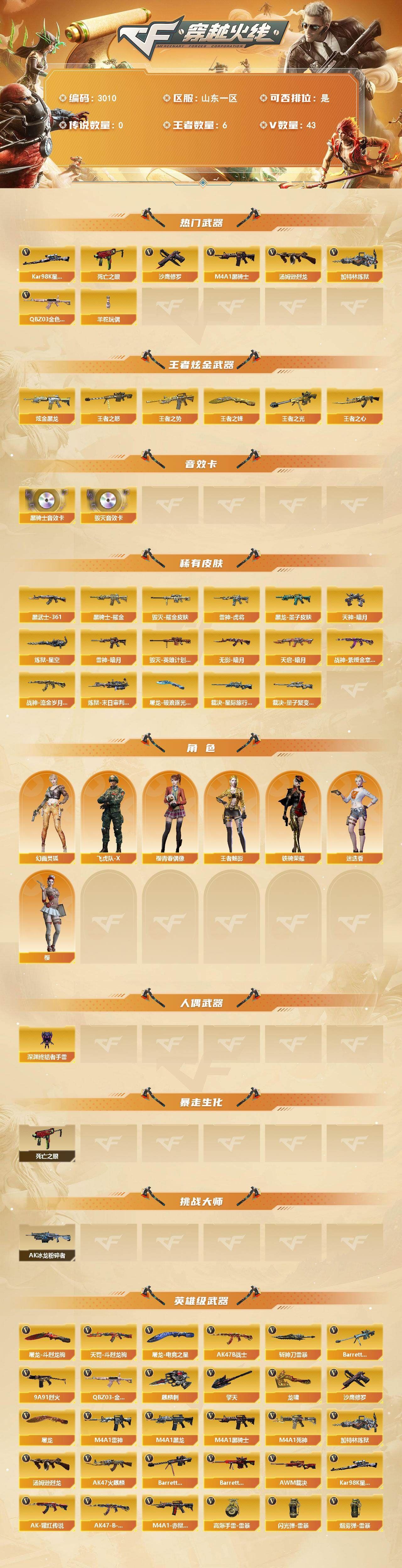 可二次可排位 山东一区-43V-6王者武器数-1炫金武器数【热门武器】:QBZ03-金色蔷薇,死亡之眼,Kar98K-星神,M4A1-黑骑士,汤姆逊-烈龙,加特林-炼狱*4,羊驼玩偶,沙鹰-修罗【王者炫金武器】:王者之势,王者之心,王者之光,王者之怒*2,王者之锋,炫金黑龙【音效卡】:M4A1-黑骑士音效卡,Barrett-毁灭音效卡【皮肤】:裁决-星际旅行 皮肤,裁决-量子聚变 皮肤,雷神-暗月,雷神-虎将,毁灭耀金皮肤,毁灭-英雄计划 皮肤,黑龙-墨子皮肤,黑骑士耀金皮肤,无影-暗月,AK47-黑武士-361,天启-暗月,战神-紫绶金章皮肤*3,战神-流金岁月皮肤*2,炼狱-星空,炼狱-末日审判 皮肤,天神-暗月*3,屠龙-破浪逐光 皮肤【角色】:樱,迷迭香,4防王者-魅影,幻面灵狐,飞虎队-X,铁骑荣耀,樱-青春偶像【人偶武器】:深渊终结者手雷【暴走生化】:死亡之眼【挑战大师】:AK47-冰龙粉碎者【英雄级武器】:AK47-火麒麟,M4A1-黑龙,M4A1-雷神*2,M4A1-黑骑士,M4A1-死神,QBZ03-金色蔷薇,9A91-烈火,AK-47-猩红传说*4,AK47-B-战神,HK417-朱雀-电竞之星,机械迷城-穹宇,AK47-B-战士,天罚-斗烈龙驹,Barrett-毁灭*2,Barrett-极光,AWM-裁决,Kar98K-星神,Barrett-暗月传说,加特林-炼狱*4,汤姆逊-烈龙,沙鹰-修罗,屠龙,龙啸,擎天,麒麟刺,斩神刀-雷暴,屠龙-电竞之星,屠龙-斗烈龙驹,高爆手雷-雷暴,闪光弹-雷暴,闪光弹-量子之心,烟雾弹-雷暴,M4A1-赤狱骑士【源级武器】:源·雷神,源·黑骑士,魂·修罗-现代金属,魂·天神-宇航兔兔*2,魂·龙啸-NICE,魂·龙啸-秦师【道具】:冰冰企鹅背包,战舰背包,炫彩背包,背包-葫芦兄弟,超级背包,救世主-黑桃战神,绿色巨人,灵魂忍者,迷雾幽灵,夺命之镰,防化服*2,流光-再燃火线,枪王排位29赛季金色流光,防弹头盔*4,防弹衣*3,C4工具钳*2,手雷包*2【特殊枪械】:1黑骑士,1烈龙,4炼狱,各种道具详情看截图、低价出售找回包 赔、截图展示段位不代 表实际段位,如赛季更新等不可抗拒因素发生变化、时限道具不保证所剩时间、标题未写送点劵默认不送【卖号买号首选亿梦】