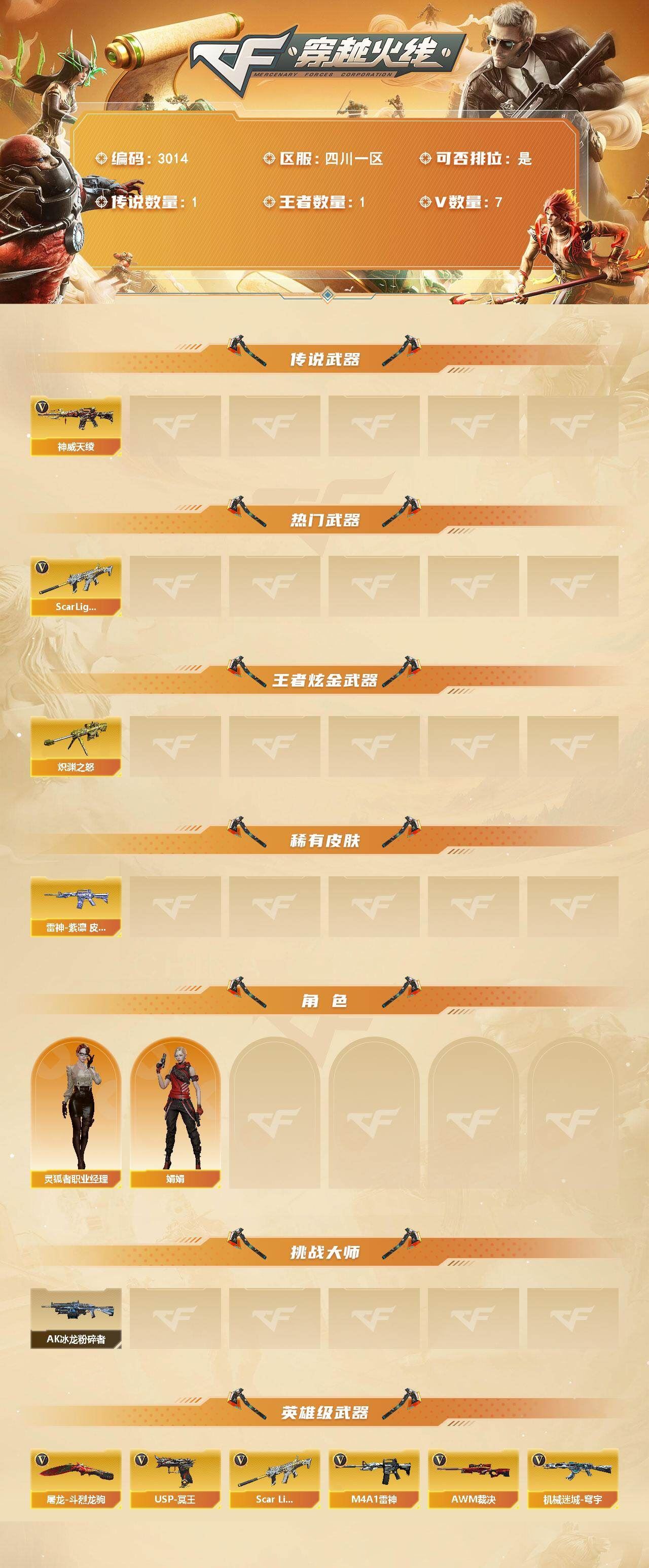 可二次可排位 四川一区-7V-0王者武器数-0炫金武器数【传说武器】:神威天绫【热门武器】:Scar Light-白虎【王者炫金武器】:炽渊之怒【皮肤】:雷神-紫凛 皮肤【角色】:娟娟,灵狐者-职业经理【挑战大师】:AK47-冰龙粉碎者【英雄级武器】:M4A1-雷神,Scar Light-白虎,机械迷城-穹宇,AWM-裁决,USP-冥王,屠龙-斗烈龙驹【源级武器】:源·雷神*2,魂·雷神-神秘按键,源·天龙,源·毁灭,灵·天神-穹宇,灵·麒麟刺-穹宇【道具】:绿色巨人,灵魂忍者,迷雾幽灵,夺命之镰,防化服*2,防弹头盔*2,防弹衣*2,C4工具钳*2,手雷包*2【特殊枪械】:1白虎,各种道具详情看截图、低价出售找回包 赔、截图展示段位不代 表实际段位,如赛季更新等不可抗拒因素发生变化、时限道具不保证所剩时间、标题未写送点劵默认不送【卖号买号首选亿梦】