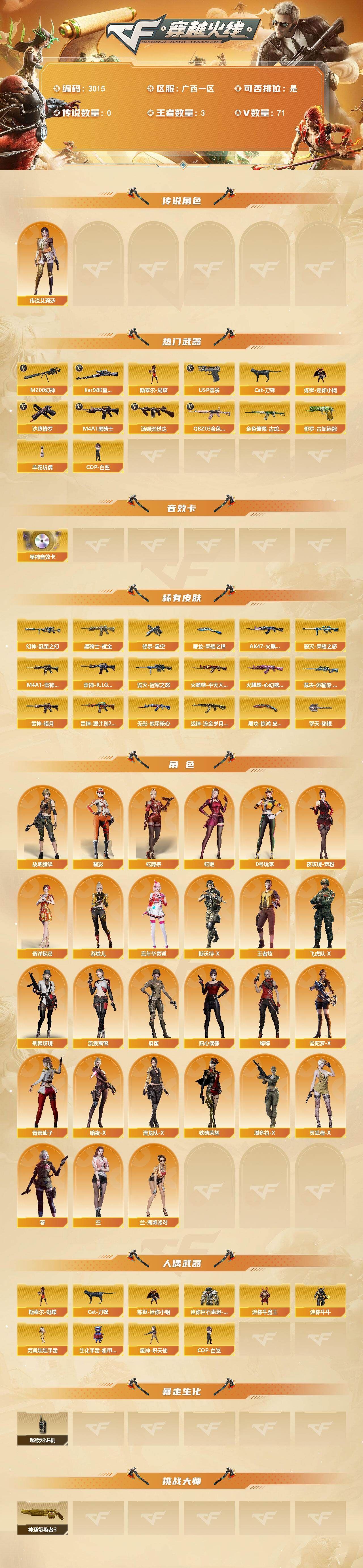 可二次可排位广西一区-71V-3王者武器数【传说角色】:四防传说艾莉莎【热门武器】:QBZ03-金色蔷薇,M200-幻神*2,金色蔷薇-古蛇迷踪,修罗-古蛇迷踪,Kar98K-星神,Cat-刀锋,炼狱-迷你小钢,M4A1-黑骑士*2,汤姆逊-烈龙,斯泰尔-蝴蝶,羊驼玩偶,COP-白鲨,USP-雷暴,沙鹰-修罗*3【音效卡】:Kar98K-星神音效卡【皮肤】:幻神-冠军之幻,裁决-运输船 皮肤,雷神-暗月*2,M4A1-雷神-CFS 2019,雷神-R.LGD-CFPLS18冠军,雷神-源计划2.0专属 皮肤,AK47-火麒麟-传奇EVEN,火麒麟-平天大圣*2,火麒麟-心动糖果,毁灭-荣耀之怒,毁灭-冠军之怒,黑骑士耀金皮肤,无影-能量核心,战神-流金岁月皮肤,修罗-星空,屠龙-荣耀之锋,屠龙-惊鸿 皮肤,擎天-秘银【角色】:春,战地猎狐,四防王者炫,蛇隐宗,奇洋探员,空,暗夜-X,飞虎队-X,嘉年华灵狐,荆棘玫瑰,娟娟,兰-海滩派对,0号玩家,灵狐者-X,流浪蔷薇,麻雀,曼陀罗-X,潘多拉-X,潜龙队-X,青霞仙子,蛇姬,斯沃特-X,甜心偶像,铁骑荣耀,夜玫瑰-宠粉,游珑儿,智影【人偶武器】:COP-白鲨,星神-炽天使,炼狱-迷你小钢,斯泰尔-蝴蝶,Cat-刀锋,迷你牛魔王,迷你牛牛,生化手雷-机甲核心*3,迷你巨石泰坦-魔花研究所,灵狐娃娃手雷【暴走生化】:超级对讲机【挑战大师】:神圣爆裂者III【英雄级武器】:AK47-火麒麟*2,M4A1-雷神,M4A1-黑骑士*2,AK12-天启,超新星-热带奇洋,金色蔷薇-古蛇迷踪,QBZ03-金色蔷薇,白虎之魄-觉醒版,机械迷城-穹宇,Barrett-毁灭,Barrett-极光,AWM-裁决,M200-幻神*2,Kar98K-星神,汤姆逊-烈龙,沙鹰-修罗*3,USP-雷暴,COP 357-云龙,【道具】:BS战队炫彩背包,CFS限定背包,XROCK炫彩背包,云山科技背包,亚洲杯纪念炫彩背包,全能枪王背包,古蛇迷踪炫彩背包,奇洋探员-海龟背包,炫彩背包-诺拉,炫彩背包,热带奇洋炫彩背包,老虎背包,超级背包,女皇终结者-魔龙之吻,救世主-黑桃战神,黄金生化钩,绿色巨人,灵魂忍者*2,变异宝贝,迷雾幽灵*2,生化弹匣,夺命之镰,防化服*3,C4-再燃火线,防弹头盔*9,防弹衣*9,C4工具钳*4,手雷包*6,各种道具详情看截图、低价出售找回包 赔、截图展示段位不代 表实际段位,如赛季更新等不可抗拒因素发生变化、时限道具不保证所剩时间、标题未写送点劵默认不送【卖号买号首选亿梦】