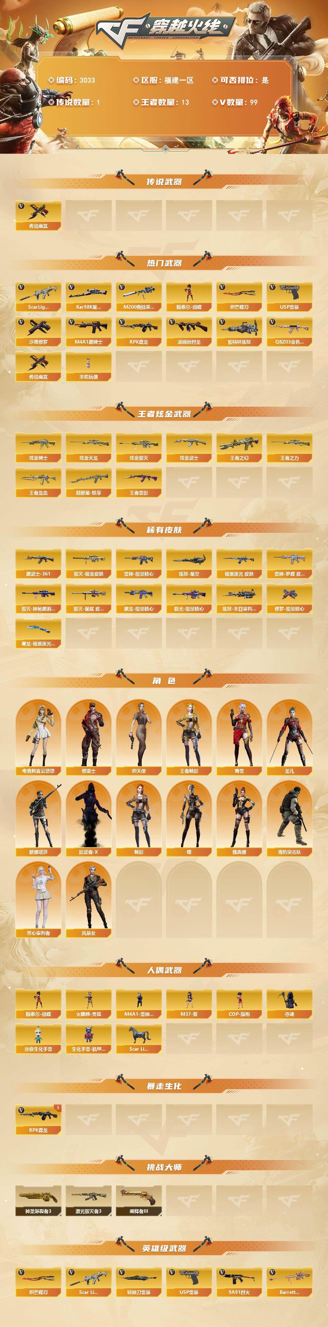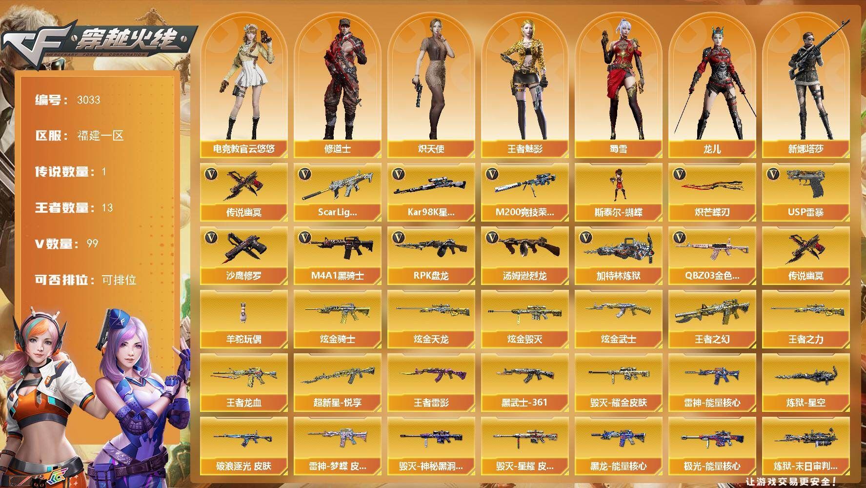 可二次可排位福建一区-99V【传说武器】:传说幽冥【热门武器】:传说幽冥,QBZ03-金色蔷薇*2,Scar Light-白虎,M200-竞技荣光,Kar98K-星神,M4A1-黑骑士,汤姆逊-烈龙*4,RPK-盘龙*5,加特林-炼狱*2,斯泰尔-蝴蝶,羊驼玩偶,USP-雷暴,沙鹰-修罗,炽芒蝶刃【王者炫金武器】:超新星-悦享,王者之幻,王者龙血,王者雷影,王者之力*3,炫金骑士,炫金武士,炫金毁灭,炫金天龙【皮肤】:金色蔷薇-破浪逐光 皮肤,雷神-能量核心,雷神-梦蝶 皮肤,毁灭耀金皮肤,毁灭-神秘黑洞皮肤,毁灭-星耀 皮肤,黑龙-能量核心,AK47-黑武士-361,极光-能量核心,炼狱-星空,炼狱-末日审判 皮肤,修罗-能量核心,屠龙-破浪逐光 皮肤【角色】:瞳,魅影,电竞教官-云悠悠,王者-魅影,修道士,炽天使,芳心审判者,风暴女,龙儿,蜀雪,新娜塔莎,影武者-X,雅典娜,海豹突击队【人偶武器】:火麒麟-灵狐,M4A1-雷神-精英刀锋,斯泰尔-蝴蝶,Scar Light-马枪,M37-葵,COP-旗袍,夺魂,迷你生化手雷,生化手雷-机甲核心【挑战大师】:神圣爆裂者III,激光毁灭者III,阐释者III【英雄级武器】:AK47-火麒麟*2,M4A1-雷神*2,M4A1-黑骑士,M4A1-死神*3,AK47-黑武士*5,AN94-超新星*3,M4A1-武圣*5,AK47-黑鲨,M4A1-龙血*4,AK47-雷暴,Scar Light-白虎,QBZ03-金色蔷薇*2,M4A1-猎神,9A91-烈火,王者之心-觉醒版,王者之魄-觉醒版,黑骑士-海王,王者风势-觉醒版,Barrett-毁灭*6,Barrett-极光*3,AWM-裁决,Kar98K-星神,M200-竞技荣光,Barrett-金色蔷薇,RPK-盘龙*5,加特林-炼狱*2,汤姆逊-烈龙*4,AA-12-雷霆*2,沙鹰-修罗,沙鹰-天神*3,USP-雷暴,王者之灵-觉醒版,屠龙*5,龙啸*2,麒麟刺,炽芒蝶刃,斩神刀-雷暴,王者之击-觉醒版,高爆手雷-雷暴*5,闪光弹-雷暴*5,烟雾弹-雷暴*5,烟雾弹-雷霆王者-觉醒版【源级武器】:源·火麒麟,魂·M4A1-雷神-化蛇*2,御·雷神-烈虎,魂·黑骑士-破浪10年,御·黑骑士·哪吒闹海,灵·黑骑士-破界 I,魂·黑武士-锋芒破茧,源·武圣,源·机械迷城,魂·HK417-朱雀-凤灵,源-金色蔷薇,魂·9A91·烈火-电子连击,魂·玫瑰精灵-傲梅,源·天龙,魂·天龙-彼岸花,魂·裁决-羽掣,魂·毁灭-秦师,御·毁灭-黑大圣,魂·Barrett-金色蔷薇-蛇姬,魂·Barrett-朱雀- 新春神龙,灵·Barrett-朱雀-炫光,魂·炼狱-电子连击*2,魂·炼狱-玩具枪,魂·天神-维纳斯,源·武圣glock,魂·擎天-蒸汽钟表,魂·麒麟刺-神秘黑洞,魂·麒麟刺-月【道具】:炫彩背包,超级背包,妩媚妖姬,变异宝贝,夺命之镰,防化服,枪王排位29赛季金色流光,语音特效-机器人,防弹头盔,防弹衣*2,C4工具钳,手雷包【特殊枪械】:蝴蝶斯泰尔+4烈龙,1白虎,1黑骑士,4烈龙,5盘龙,2炼狱,1蝴蝶斯泰尔,各种道具详情看截图、低价出售找回包 赔、截图展示段位不代 表实际段位,如赛季更新等不可抗拒因素发生变化、时限道具不保证所剩时间、标题未写送点劵默认不送【卖号买号首选亿梦】