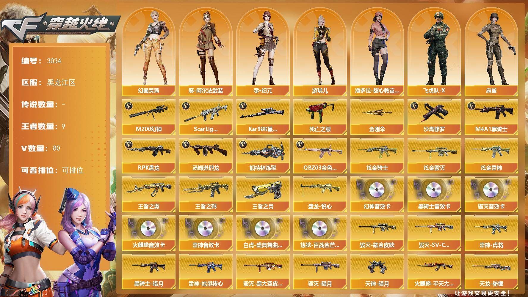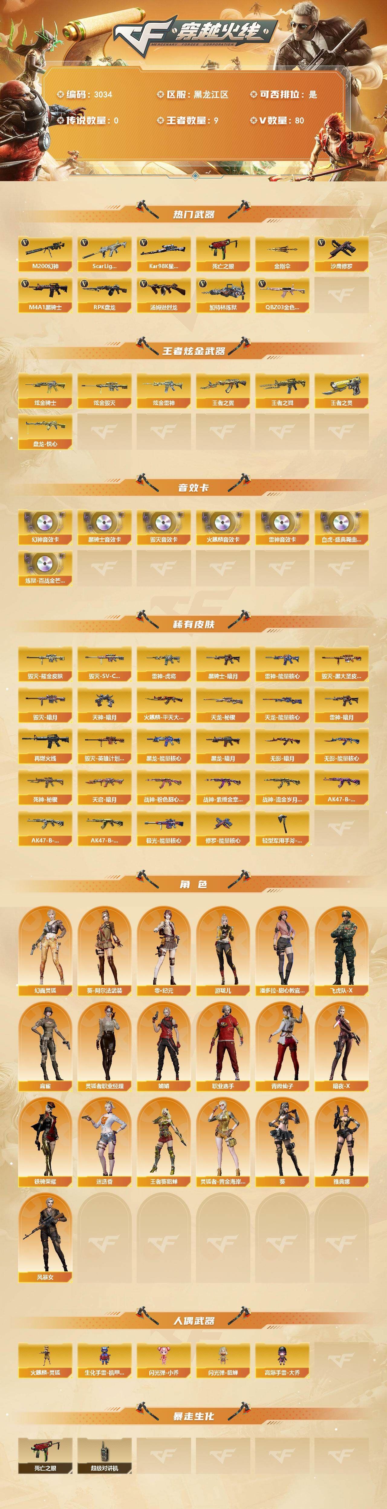 可二次可排位黑龙江区-80V【热门武器】:QBZ03-金色蔷薇,Scar Light-白虎,M200-幻神,死亡之眼,Kar98K-星神,M4A1-黑骑士,汤姆逊-烈龙*3,RPK-盘龙,加特林-炼狱,沙鹰-修罗*10,金刚伞【王者炫金武器】:王者之戮,王者之翼,盘龙-悦心*2,王者之灵*2,炫金骑士,炫金雷神*2,炫金毁灭【音效卡】:M200-幻神音效卡,AK47-火麒麟音效卡,M4A1-雷神音效卡,M4A1-黑骑士音效卡,Barrett-毁灭音效卡,白虎-盛典舞曲音效卡,炼狱-百战金芒-庆典舞曲音效卡【皮肤】:雷神-暗月,雷神-能量核心,雷神-虎将*2,M4A1-再燃火线,火麒麟-平天大圣,毁灭-暗月*6,毁灭耀金皮肤,毁灭-SV-CFPLS16冠军,毁灭-黑大圣皮肤,毁灭-英雄计划 皮肤,黑龙-能量核心,黑龙-暗月,黑骑士-暗月*4,无影-暗月*5,无影-能量核心,死神-秘银*3,天启-暗月*3,战神-粉色甜心皮肤,战神-紫绶金章皮肤,战神-流金岁月皮肤,AK47-B-常胜将军-曹操,AK47-B-常胜将军-刘备,AK47-B-常胜将军-孙权,天龙-秘银*2,天龙-能量核心,极光-能量核心,修罗-能量核心*3,天神-暗月*6,轻型军用手斧-再燃火线【角色】:葵,迷迭香,零·纪元,王者-葵-貂蝉,葵-阿尔法武装,幻面灵狐,暗夜-X,飞虎队-X,风暴女,娟娟,灵狐者-黄金海岸,灵狐者-职业经理,麻雀,潘多拉-甜心教官,青霞仙子,铁骑荣耀,游珑儿,职业选手,雅典娜【人偶武器】:火麒麟-灵狐,生化手雷-机甲核心,闪光弹-小乔,闪光弹-貂蝉,高爆手雷-大乔【暴走生化】:死亡之眼,超级对讲机【英雄级武器】:M4A1-千变,AK47-火麒麟*2,M4A1-黑龙,M4A1-雷神,M4A1-黑骑士,AK47-黑武士,AK47-黑鲨,M4A1-龙血,Scar Light-白虎,无影-神兵利器,黑武士-锦绣游龙,M4A1-玫瑰精灵,QBZ03-金色蔷薇,9A91-烈火*2,王者之魄-觉醒版,AK-47-猩红传说,AK47-B-战神,黑骑士-海王,AK47-B-常胜将军,QBZ-03-王者蔷薇-觉醒版,机械迷城-穹宇,AK47-B-身先士卒,AK47-B-战士,AWM-天龙*6,Barrett-毁灭*2,Barrett-极光,AWM-裁决,M200-幻神,Kar98K-星神,Barrett-暗月传说,RPK-盘龙,加特林-炼狱,炼狱-百战金芒,炼狱-悦蓝-觉醒版,汤姆逊-烈龙*3,AA-12-雷霆,沙鹰-修罗*10,【道具】:BS战队炫彩背包,CFS限定背包,KZ战队炫彩背包,亚洲杯纪念炫彩背包,女皇终结者-背包,炫彩背包,百战金芒炫彩背包,超级背包,女皇终结者-魔龙之吻,绿色巨人,灵魂忍者,迷雾幽灵,生化弹匣,夺命之镰,防化服*2,流光-鎏金之域,枪王排位28赛季金色流光,枪王排位29赛季金色流光,语音特效-盛典烟火,萌萌小葵表情,CFPL选手表情-第1套,CFPL选手表情-第2套,防弹头盔*6,防弹衣*7,C4工具钳*3,手雷包*3【特殊枪械】:1白虎,1黑骑士,3烈龙,1盘龙,1炼狱,各种道具详情看截图、低价出售找回包 赔、截图展示段位不代 表实际段位,如赛季更新等不可抗拒因素发生变化、时限道具不保证所剩时间、标题未写送点劵默认不送【卖号买号首选亿梦】