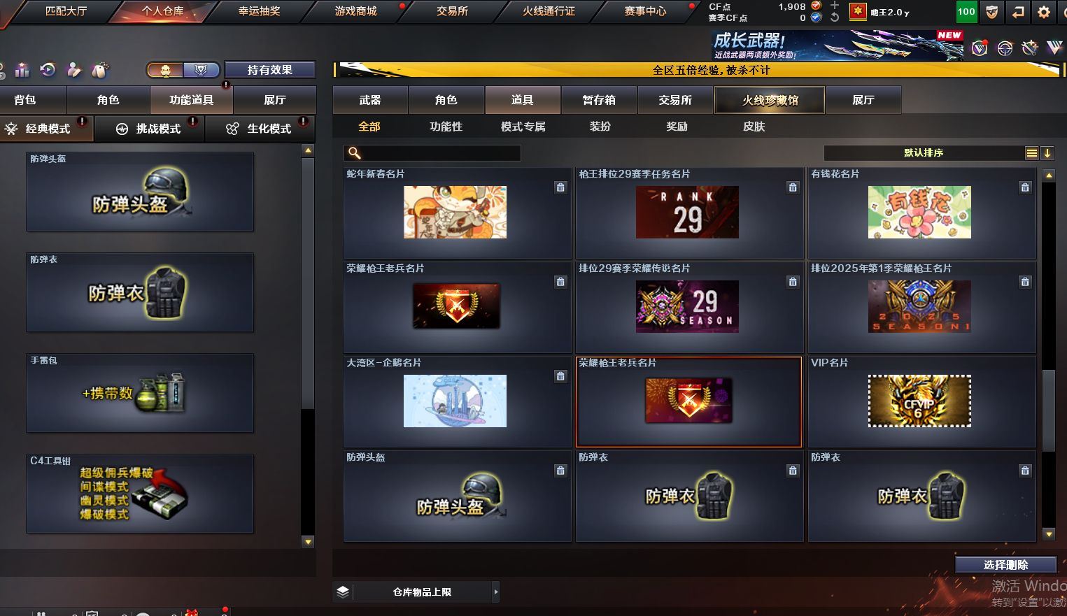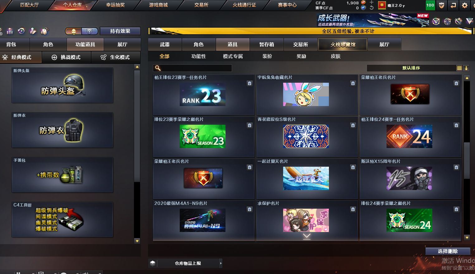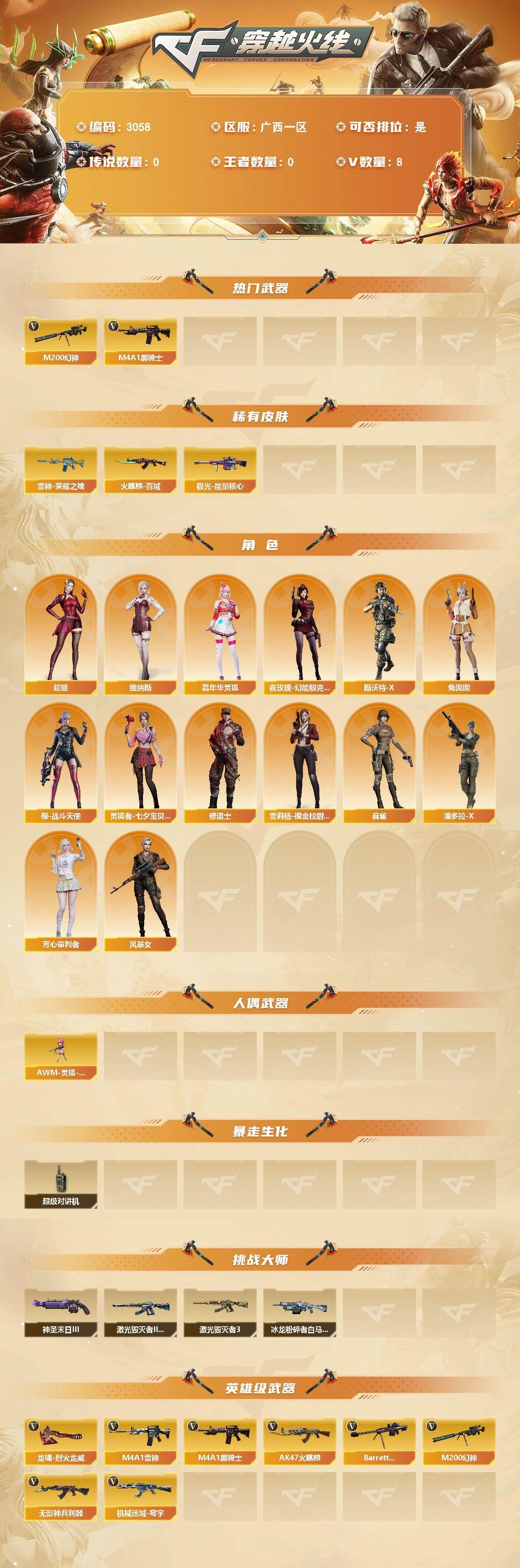 可二次可排位 广西一区-8V-0王者武器数-0炫金武器数【热门武器】:M200-幻神,M4A1-黑骑士【皮肤】:雷神-荣耀之魄,火麒麟-百城,极光-能量核心【角色】:修道士,芳心审判者,风暴女,嘉年华灵狐,灵狐者-七夕宝贝,麻雀,潘多拉-X,蛇姬,斯沃特-X,兔囡囡,维纳斯,雪莉杨-摸金校尉,夜玫瑰-幻能朋克,樱-战斗天使【人偶武器】:AWM-灵狐-15周年嘉年华【暴走生化】:超级对讲机【挑战大师】:冰龙粉碎者-白马银枪,激光毁灭者III-白马银枪,激光毁灭者III,神圣爆裂者-末日III【英雄级武器】:AK47-火麒麟,M4A1-雷神,M4A1-黑骑士,无影-神兵利器,机械迷城-穹宇,Barrett-毁灭,M200-幻神,龙啸-烈火龙威【源级武器】:源·火麒麟,源-黑龙,魂·雷神-维纳斯,魂·雷神-新春神龙,魂-雷神-萌杀,魂·雷神-15周年嘉年华,御·雷神-小白龙,源·黑骑士,魂·黑骑士-现代金属,魂·黑骑士-幻能朋克,源·超新星,源·武圣,源·机械迷城*2,魂·龙血-锋芒破茧*2,源·青龙,M4A1-青龙-掌上穿越火线,魂·HK417-朱雀-凤灵*3,源-金色蔷薇,魂·QBZ03-金色蔷薇-萌杀,魂·QBZ03-金色蔷薇-蛇姬,QBZ03-文殊坊,魂·英雄-湾区光枢,源·天龙,魂·天龙-彼岸花,AWM-裁决-百城联赛天津,魂·裁决-凤灵,源·Barrett-朱雀*2,魂·炼狱-玩具枪,魂·炼狱-月,加特林-炼狱-掌火,魂·修罗-15周年嘉年华,魂·修罗-神兵利器,源·天神,灵·天神-穹宇,魂·屠龙-春桃,魂·屠龙-都是Cfer,魂·屠龙-惊鸿,源·擎天-萌杀,灵·麒麟刺-穹宇【道具】:CFS限定背包,全能枪王背包,虎牙炫彩背包,超级背包,夺命之镰,防化服,金色流光-枪王排位*2,星辰流光-枪王排位,枪王排位28赛季金色流光,枪王排位29赛季金色流光,防弹头盔*5,防弹衣*5,C4工具钳*3,手雷包*2【特殊枪械】:1黑骑士各种道具详情看截图、低价出售找回包 赔、截图展示段位不代 表实际段位,如赛季更新等不可抗拒因素发生变化、时限道具不保证所剩时间、标题未写送点劵默认不送【卖号买号首选亿梦】