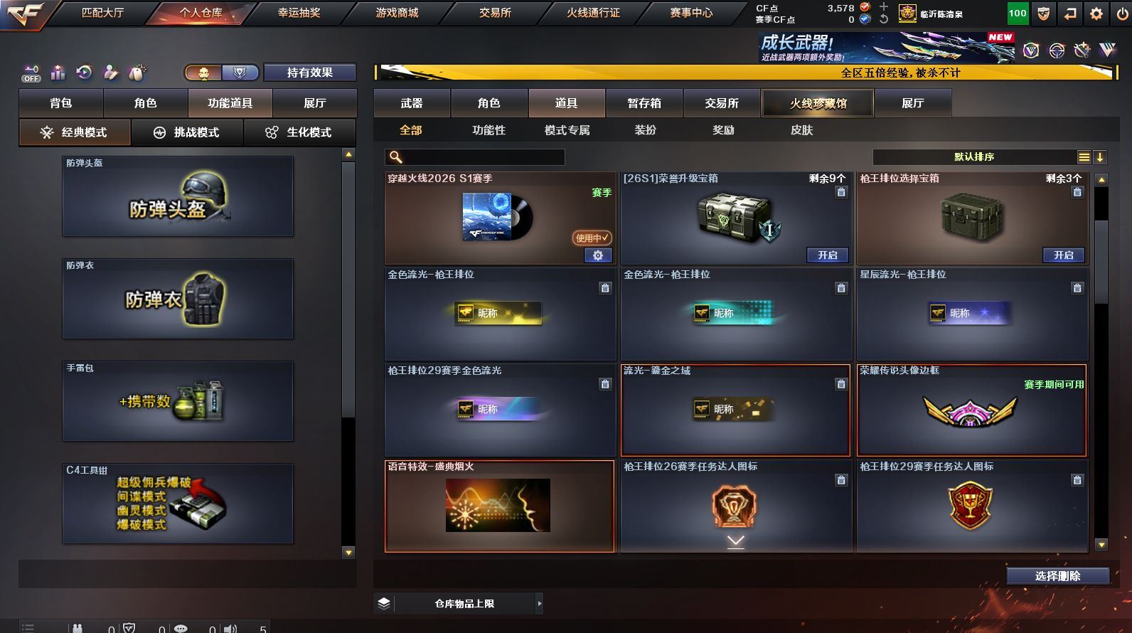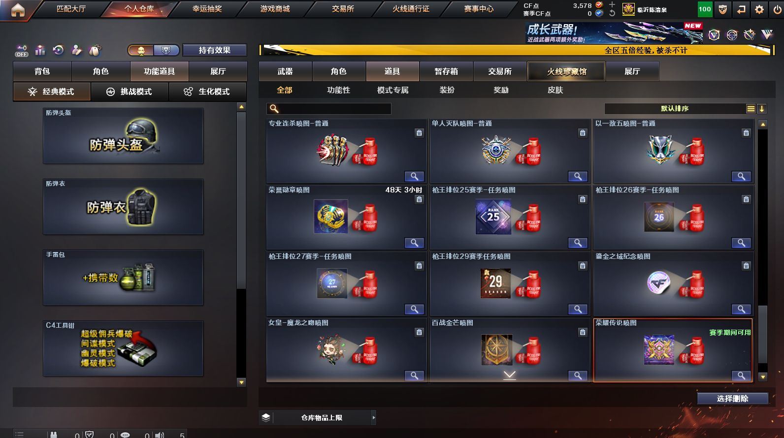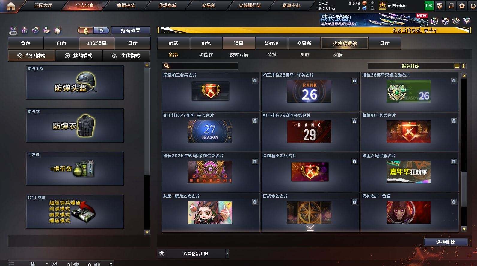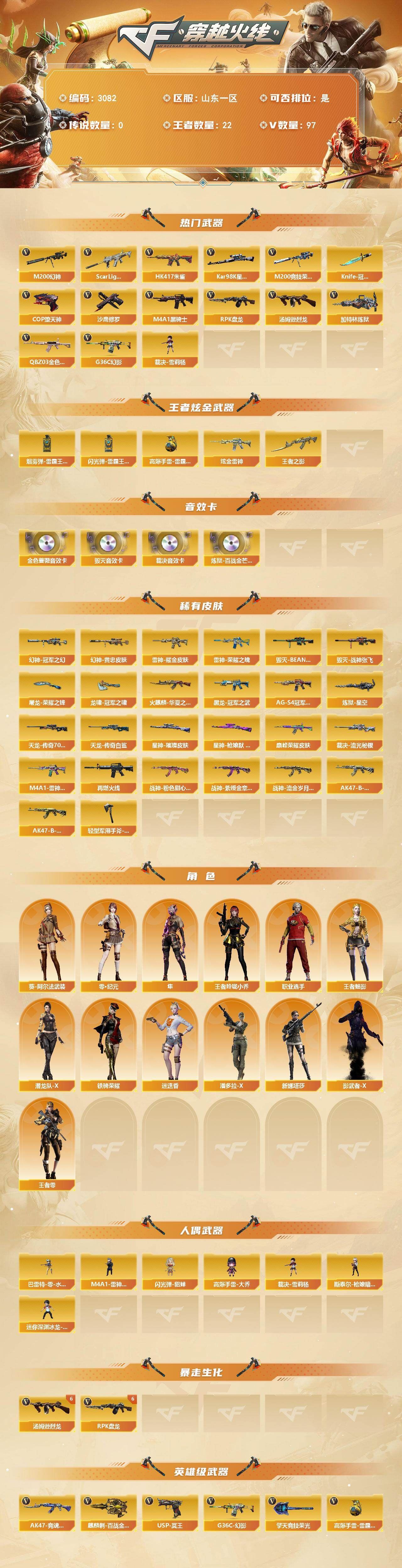 可二次可排位 山东一区-97V-22王者武器数-1炫金武器数【热门武器】:G36C-幻影*2,QBZ03-金色蔷薇,Scar Light-白虎,HK417-朱雀,M200-幻神,M200-竞技荣光,Kar98K-星神,M4A1-黑骑士,汤姆逊-烈龙*6,RPK-盘龙*6,加特林-炼狱,裁决-雪莉杨,COP-堕天神*2,沙鹰-修罗*2,Knife-冠军之刃【王者炫金武器】:王者之影,高爆手雷-雷霆王者*2,烟雾弹-雷霆王者*3,闪光弹-雷霆王者,炫金雷神【音效卡】:Barrett-毁灭音效卡,QBZ03-金色蔷薇音效卡,AWM-裁决音效卡,炼狱-百战金芒-庆典舞曲音效卡【皮肤】:M200-幻神-黄忠皮肤,幻神-冠军之幻,QBZ03-巅峰荣耀皮肤,裁决-流光秘银,星神-璀璨皮肤,星神-枪娘默 皮肤,雷神-荣耀之魄,雷神-耀金皮肤,M4A1-雷神-巅峰荣耀皮肤,M4A1-再燃火线,火麒麟-华夏之心,毁灭-战神张飞,毁灭-BEAN-2020MVP,黑龙-冠军之武,黑骑士-AG-S4冠军典藏,战神-粉色甜心皮肤,战神-紫绶金章皮肤,战神-流金岁月皮肤,AK47-B-常胜将军-刘备,AK47-B-常胜将军-孙权*2,AWM-天龙-传奇70KG,AWM-天龙-传奇白鲨,炼狱-星空,屠龙-荣耀之锋,龙啸-冠军之啸,轻型军用手斧-再燃火线【角色】:迷迭香,隼,零·纪元,王者-零,4防王者-魅影,4防王者玲珑-小乔,葵-阿尔法武装,潘多拉-X,潜龙队-X,铁骑荣耀,新娜塔莎,影武者-X,职业选手【人偶武器】:裁决-雪莉杨,M4A1-雷神-精英刀锋,巴雷特-零-水下丽影,斯泰尔-枪娘暗刃,闪光弹-貂蝉,高爆手雷-大乔,迷你深渊冰龙-王绿豆【英雄级武器】:AK47-火麒麟,M4A1-雷神*2,M4A1-黑骑士,M4A1-死神,AN94-超新星,M4A1-龙血,M4A1-堕天神,HK417-朱雀,Scar Light-白虎,G36C-幻影*2,M4A1-玫瑰精灵,QBZ03-金色蔷薇,王者之心-觉醒版,王者之魄-觉醒版,王者之势-觉醒版,AK-47-猩红传说,AK47-B-常胜将军,M4A1-雷霆王者-觉醒版,QBZ-03-王者蔷薇-觉醒版,AK47-B-身先士卒,AK47-B-战士,AWM-天龙,Barrett-毁灭,Barrett-极光,AWM-裁决,M200-幻神,Kar98K-星神,M200-竞技荣光,Barrett-金色蔷薇,王者之怒-觉醒版,王者之力-觉醒版,王者风神-觉醒版,Barrett-暗月传说,RPK-盘龙*6,加特林-炼狱,炼狱-百战金芒,汤姆逊-烈龙*6,沙鹰-修罗*2,COP-堕天神*2,USP-冥王,屠龙*3,龙啸,麒麟刺-堕天神*2,麒麟刺,擎天-竞技荣光,龙啸-堕天神,麒麟刺-百战金芒,王者之锋-觉醒版,王者之啸-觉醒版*2,王者之击-觉醒版*2,高爆手雷-堕天神*7,高爆手雷-雷霆王者-觉醒版,闪光弹-堕天神*7,闪光弹-竞技荣光,闪光弹-雷霆王者-觉醒版,烟雾弹-堕天神*7,烟雾弹-竞技荣光,烟雾弹-雷霆王者-觉醒版,M4A1-赤狱骑士,AK47-竞魂无影,Barrett-碧霄极光【源级武器】:源·火麒麟,源·雷神,魂·雷神-神秘按键,魂·雷神-维纳斯,御·雷神-葫芦兄弟,御·雷神-小白龙,魂·黑骑士-现代金属,御·黑骑士·哪吒闹海,源·无影,源·武圣,魂·HK417-朱雀-凤灵,源·天龙,魂·毁灭-航天科技,御·炼狱-女娲,源·武圣glock,魂·屠龙-春桃,源·龙啸【道具】:炫彩背包,百战金芒炫彩背包,超级背包,女皇终结者-魔龙之吻,绿色巨人,灵魂忍者,变异宝贝,妖姬,迷雾幽灵,夺命之镰,防化服*2,金色流光-枪王排位*2,星辰流光-枪王排位,流光-鎏金之域,枪王排位29赛季金色流光,语音特效-盛典烟火,萌萌小葵表情,防弹头盔*2,防弹衣*2,C4工具钳*2,手雷包*2【特殊枪械】:1白虎,1黑骑士,6烈龙,6盘龙,1炼狱,各种道具详情看截图、低价出售找回包 赔、截图展示段位不代 表实际段位,如赛季更新等不可抗拒因素发生变化、时限道具不保证所剩时间、标题未写送点劵默认不送