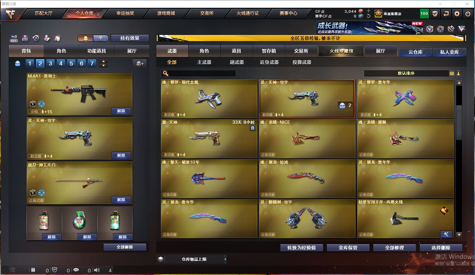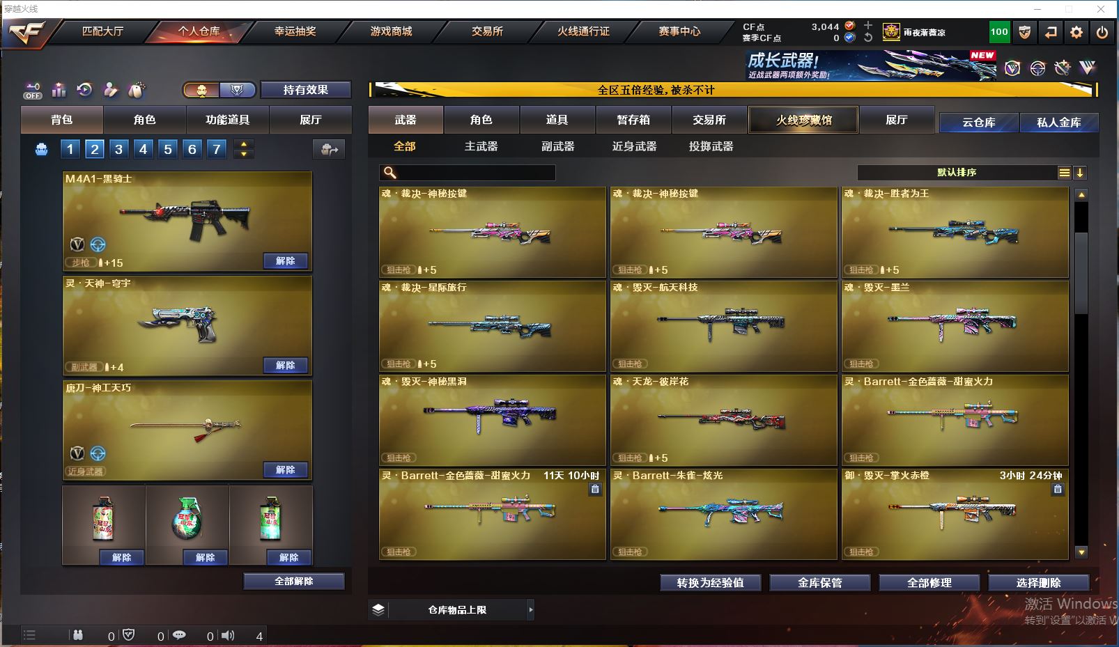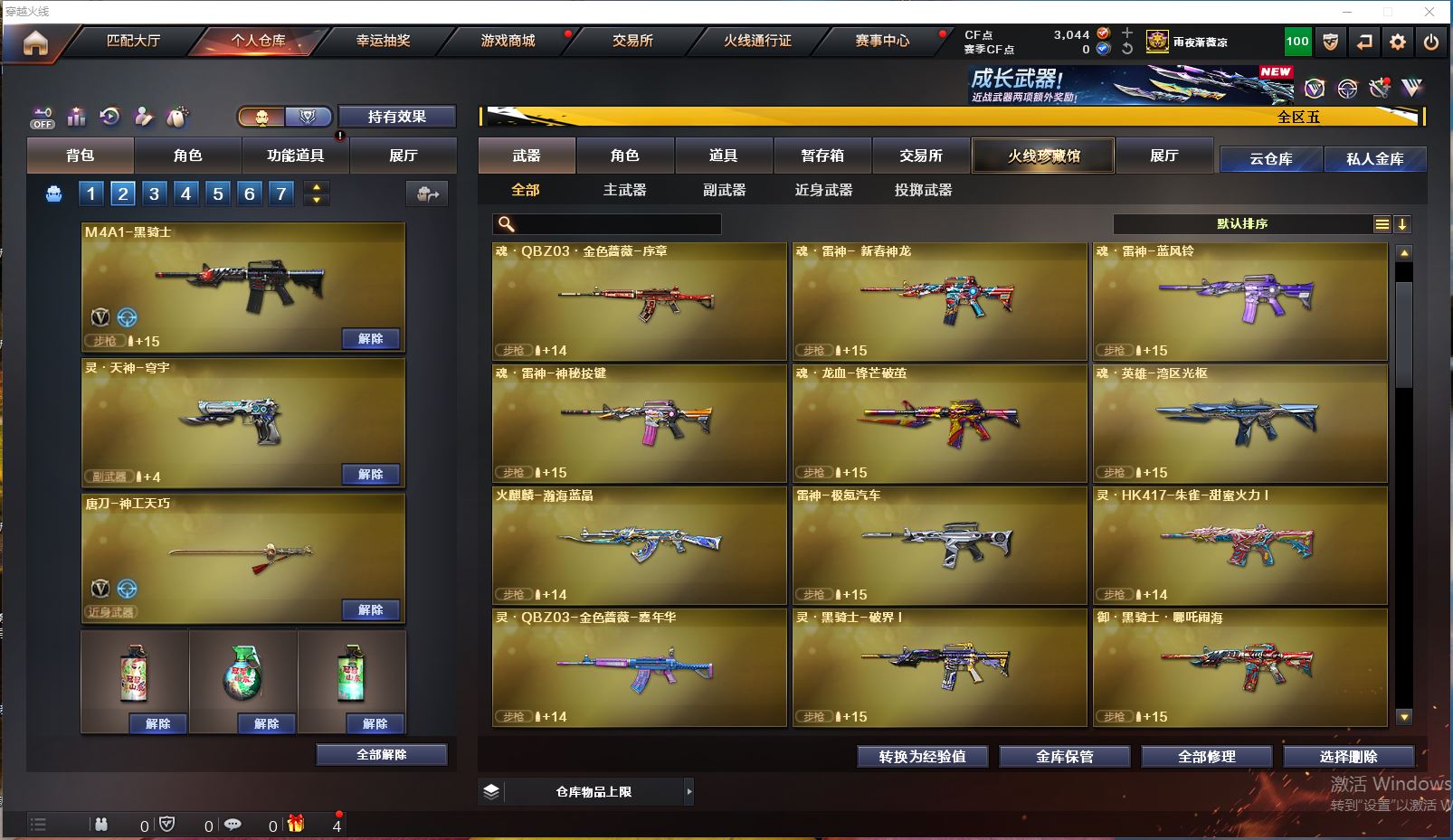 Lv.102段位精英5,VIP3,24V,0传说,0王者,0炫金,3044CF点,游戏年龄1.3年;【重要角色8】:司雨/兰-巾帼英雄/幻面灵狐/葵-阿尔法武装/铁骑荣耀/炽天使/灵狐者-职业经理/宋雨琦;【武器皮肤4】:毁灭-神秘黑洞/擎天-傲竹金蛇/超新星-傲竹金蛇/雷神-神秘按键;【英雄武器20】:barrett-金色蔷薇/Barrett-毁灭/ScarLight-白虎*3/QBZ03-金色蔷薇/M4A1-黑骑士/M4A1-玫瑰精灵/M4A1-再燃火线/HK417-朱雀-电竞之星/USP-神工天巧/炽芒蝶刃/擎天/唐刀-神工天巧/高爆手雷-神工天巧/烟雾弹-神工天巧/屠龙-电竞之星/炼狱-百战金芒/麒麟刺-百战金芒/机械迷城-穹宇;【热门武器1】:1黑骑士;【音效卡4】:ScarLight-白虎音效卡/HK417-朱雀-电竞之星-竞星跃动音效卡/屠龙-电竞之星-竞星跃动音效卡/炼狱-百战金芒-庆典舞曲音效卡;【小人枪22】:降世魔童/迷你火种*2/生化手雷-小钢*2/迷你白狐*8/ScarLight-马枪/迷你裂空之翼*5/迷你波特博士/AWM-灵狐-15周年嘉年华/Mini沃特X;【挑战大师17】:迷你火种*2/神圣爆裂者III/激光毁灭者III/试炼破坏者III/阐释者III/KAC-圣炎切割者III/冰龙粉碎者-白马银枪/末日裁决者/迷你白狐*8;【官方截图】【所有武器的数量可能含有时效性,具体请以游戏内仓库实际拥有为准】【湖北一区】【不可二次实名】