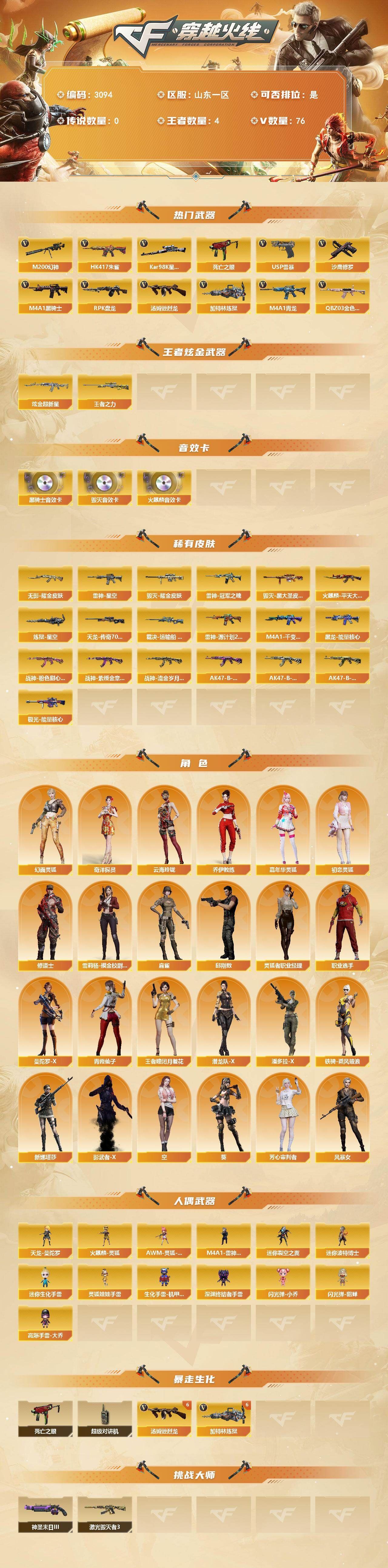 可二次可排位 山东一区-76V-3王者武器数-1炫金武器数【热门武器】:QBZ03-金色蔷薇,HK417-朱雀,M4A1-青龙,M200-幻神,死亡之眼*2,Kar98K-星神,M4A1-黑骑士*3,汤姆逊-烈龙*6,RPK-盘龙,加特林-炼狱*7,USP-雷暴,沙鹰-修罗【王者炫金武器】:王者之力,炫金超新星【音效卡】:AK47-火麒麟音效卡,M4A1-黑骑士音效卡,Barrett-毁灭音效卡【皮肤】:裁决-运输船 皮肤,雷神-星空,雷神-冠军之魄,雷神-源计划2.0专属 皮肤,火麒麟-平天大圣,毁灭耀金皮肤,毁灭-黑大圣皮肤,M4A1-千变-孔明皮肤*2,黑龙-能量核心,无影耀金皮肤,战神-粉色甜心皮肤,战神-紫绶金章皮肤*3,战神-流金岁月皮肤*2,AK47-B-常胜将军-曹操,AK47-B-常胜将军-刘备*2,AK47-B-常胜将军-孙权,AWM-天龙-传奇70KG,极光-能量核心,炼狱-星空【角色】:葵,4防王者-瞳-闭月羞花,奇洋探员,乔伊教练,修道士,云海玲珑,幻面灵狐,空,初恋灵狐,芳心审判者,风暴女,嘉年华灵狐,灵狐者-职业经理,麻雀,曼陀罗-X,潘多拉-X,潜龙队-X,邱刚敖,青霞仙子,铁骑-乘风破浪,新娜塔莎,雪莉杨-摸金校尉,影武者-X,职业选手【人偶武器】:天龙-曼陀罗,火麒麟-灵狐,M4A1-雷神-精英刀锋,AWM-灵狐-15周年嘉年华,迷你裂空之翼*2,迷你波特博士,迷你生化手雷,生化手雷-机甲核心,深渊终结者手雷,闪光弹-小乔,闪光弹-貂蝉,高爆手雷-大乔,灵狐娃娃手雷【暴走生化】:死亡之眼*2,超级对讲机【挑战大师】:激光毁灭者III*2,神圣爆裂者-末日III*2【英雄级武器】:M4A1-千变,AK47-火麒麟,AK47-麒麟,M4A1-黑龙,M4A1-雷神,M4A1-黑骑士*3,AK47-无影,M4A1-死神,AK47-黑武士,AN94-超新星,M4A1-龙血,M4A1-青龙,HK417-朱雀,无影-神兵利器,黑武士-锦绣游龙,M4A1-玫瑰精灵,QBZ03-金色蔷薇,9A91-烈火,王者之心-觉醒版,AK-47-猩红传说*6,AK47-B-战神,黑骑士-海王,AK47-B-常胜将军,AK47-B-身先士卒,AK47-B-战士*2,AWM-天龙,Barrett-毁灭,Barrett-极光,AWM-裁决,M200-幻神,Barrett-朱雀,Kar98K-星神,Barrett-金色蔷薇,Barrett-暗月传说,RPK-盘龙,加特林-炼狱*7,炼狱-悦蓝-觉醒版,汤姆逊-烈龙*6,AA-12-雷霆,沙鹰-修罗,USP-雷暴,屠龙*2,龙啸,擎天,麒麟刺,斩神刀-雷暴,王者之啸-觉醒版,屠龙-电竞之星,高爆手雷-雷暴,闪光弹-雷暴,烟雾弹-雷暴,烟雾弹-幻灵*2,烟雾弹-竞技荣光,AK47-竞魂无影【源级武器】:源-千变,源·火麒麟*3,御·黑龙-龙太子,源·雷神*4,魂·M4A1-雷神-化蛇,魂·雷神-新春神龙,魂-雷神-萌杀,魂·雷神-15周年嘉年华,御·雷神-机甲刑天*2,御·雷神-烈虎*2,M4A1-十二生肖·龙-雷神,御·雷神-葫芦兄弟,御·雷神-小白龙*2,源·黑骑士,魂·黑骑士-现代金属,魂·黑骑士-幻能朋克*2,魂·黑骑士-破浪10年,御·黑骑士-冰魄,御·黑骑士·哪吒闹海*2,源·无影,源·AK47-黑武士,源·天启,魂·超新星-春桃,源·武圣*2,源·机械迷城,源·青龙*2,M4A1-青龙-掌上穿越火线,源-金色蔷薇,魂·QBZ03-金色蔷薇-萌杀,魂·QBZ03-金色蔷薇-蛇姬,源-极光,源·天龙*2,魂·天龙-彼岸花,魂·裁决-凤灵*2,魂·裁决-羽掣,源·毁灭*3,魂·毁灭-青帝,魂·毁灭-神秘黑洞*2,御·毁灭-黑大圣,御·毁灭-葫芦兄弟,御·毁灭-怒火大圣,魂·Barrett-朱雀-锦鲤,魂·Barrett-朱雀- 新春神龙,源·Barrett-朱雀,灵·Barrett-朱雀-炫光,魂·炼狱-月,加特林-炼狱-掌火,御·炼狱-女娲,魂·修罗-15周年嘉年华,魂·修罗-神兵利器,源·天神*3,魂·天神-阿努比斯,魂·天神-宇航兔兔*2,源·武圣glock,魂·屠龙-都是Cfer,源·龙啸*2,魂·龙啸-秦师,魂·麒麟刺-神秘黑洞【道具】:CFS限定背包,亚洲杯纪念炫彩背包,奇洋探员-海龟背包,战舰背包,背包-葫芦兄弟,超级背包,绿色巨人,各种道具详情看截图、低价出售找回包 赔、截图展示段位不代 表实际段位,如赛季更新等不可抗拒因素发生变化、时限道具不保证所剩时间、标题未写送点劵默认不送【卖号买号首选亿梦】