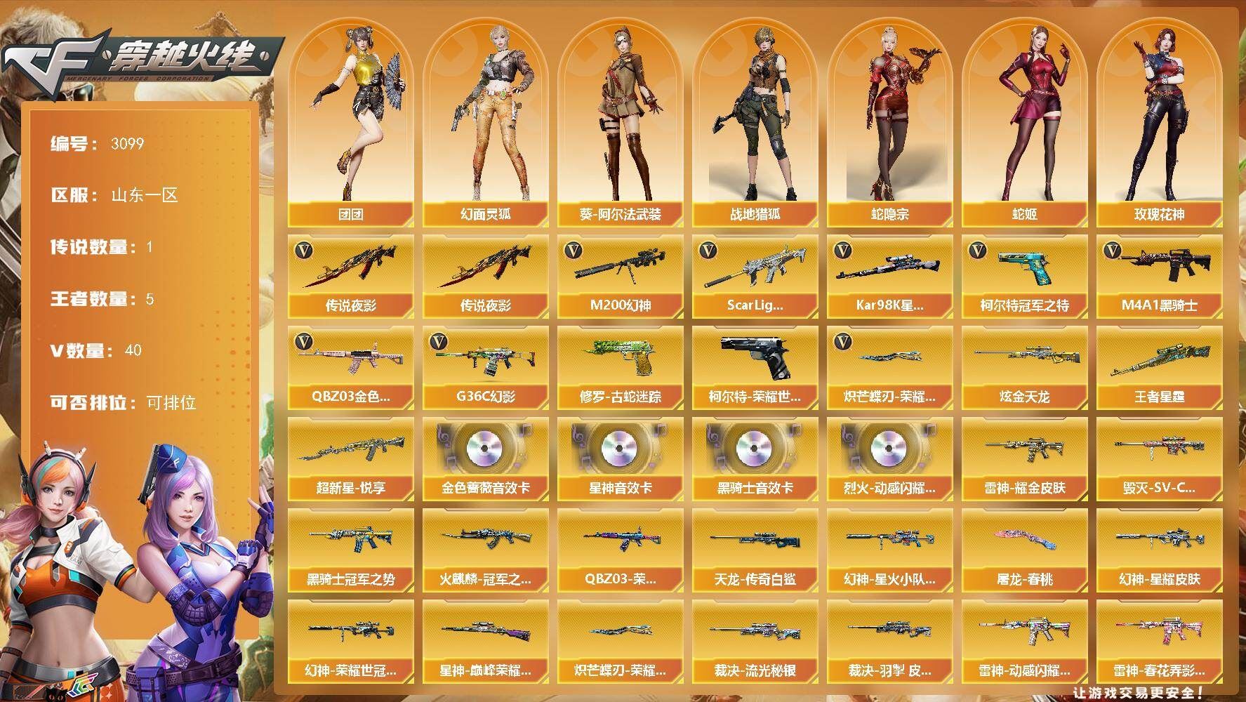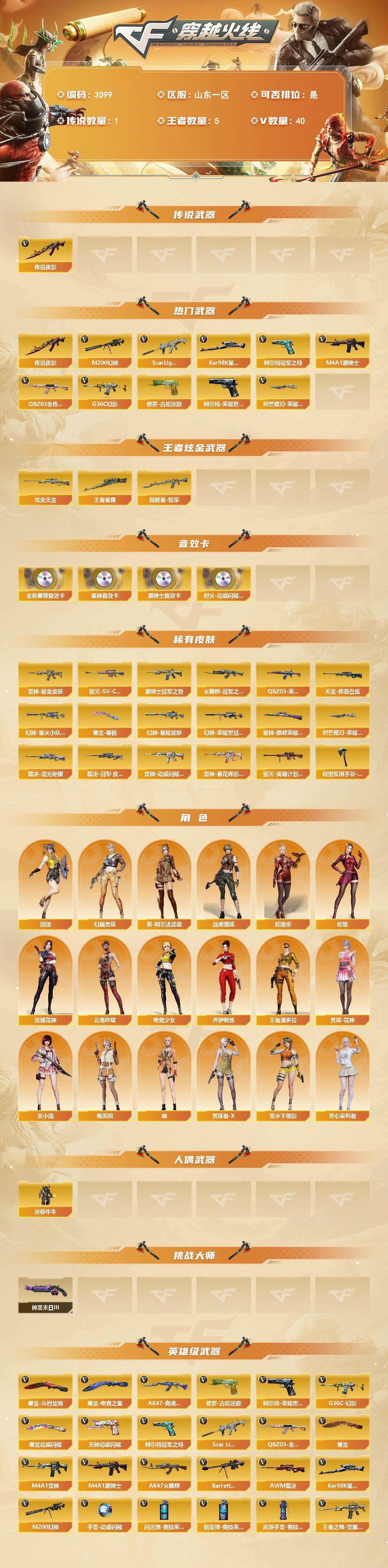 可二次可排位山东一区-40V【传说武器】:传说夜影【热门武器】:传说夜影,G36C-幻影,QBZ03-金色蔷薇,Scar Light-白虎,M200-幻神,柯尔特-荣耀世冠白鲨2023,修罗-古蛇迷踪,柯尔特-冠军之特,Kar98K-星神,M4A1-黑骑士,炽芒蝶刃-荣耀世冠白鲨2023 皮肤【王者炫金武器】:超新星-悦享,王者星霆,炫金天龙【音效卡】:烈火-动感闪耀 音效卡,M4A1-黑骑士音效卡,QBZ03-金色蔷薇音效卡,Kar98K-星神音效卡【皮肤】:幻神-星耀 皮肤,幻神-星火小队签名臻藏版 皮肤,幻神-荣耀世冠白鲨2023 皮肤,QBZ03-荣耀世冠白鲨,裁决-流光秘银,裁决-羽掣 皮肤,星神-巅峰荣耀 皮肤,雷神-耀金皮肤,雷神-动感闪耀 皮肤,雷神-春花弄影 皮肤,火麒麟-冠军之心,毁灭-SV-CFPLS16冠军,毁灭-英雄计划 皮肤,黑骑士-冠军之势,AWM-天龙-传奇白鲨,屠龙-春桃 皮肤,轻型军用手斧-再燃火线,炽芒蝶刃-荣耀世冠白鲨2023 皮肤【角色】:关小雨,战地猎狐,王者潘多拉,蛇隐宗,乔伊教练,云海玲珑,葵-阿尔法武装,幻面灵狐,电竞少女,芳心审判者,零-水下丽影,灵狐-花神,灵狐者-X,玫瑰花神,蛇姬,兔囡囡,幽,团团【人偶武器】:迷你牛牛【挑战大师】:神圣爆裂者-末日III【英雄级武器】:AK47-火麒麟,M4A1-雷神,M4A1-黑骑士,Scar Light-白虎,G36C-幻影,QBZ03-金色蔷薇,王者之魄-觉醒版,王者之势-觉醒版,王者芳薇-觉醒版,HK417-朱雀-电竞之星,Barrett-毁灭,AWM-裁决,M200-幻神,Kar98K-星神,柯尔特-冠军之特,柯尔特-荣耀世冠白鲨2023,天神-动感闪耀,修罗-古蛇迷踪,屠龙*2,屠龙-动感闪耀,屠龙-电竞之星,屠龙-斗烈龙驹,高爆手雷-竞技荣光*3,手雷-动感闪耀,高爆手雷-云龙*2,高爆手雷-古蛇迷踪,闪光弹-竞技荣光,闪光弹-云龙*2,烟雾弹-竞技荣光,烟雾弹-云龙*2,烟雾弹-古蛇迷踪,AK47-竞魂无影【道具】:古蛇迷踪炫彩背包,炫彩背包,超级背包,黑桃战神背包,女皇终结者-魔龙之吻,救世主-黑桃战神,绿色巨人,夺命之镰,防化服,流光-再燃火线,枪王排位28赛季金色流光,枪王排位29赛季金色流光,古蛇迷踪打击特效,蛇隐宗表情,动感闪耀表情,C4-再燃火线,防弹头盔*4,防弹衣*4,C4工具钳*4,手雷包*3【特殊枪械】:1白虎,1黑骑士,各种道具详情看截图、低价出售找回包 赔、截图展示段位不代 表实际段位,如赛季更新等不可抗拒因素发生变化、时限道具不保证所剩时间、标题未写送点劵默认不送【卖号买号首选亿梦】