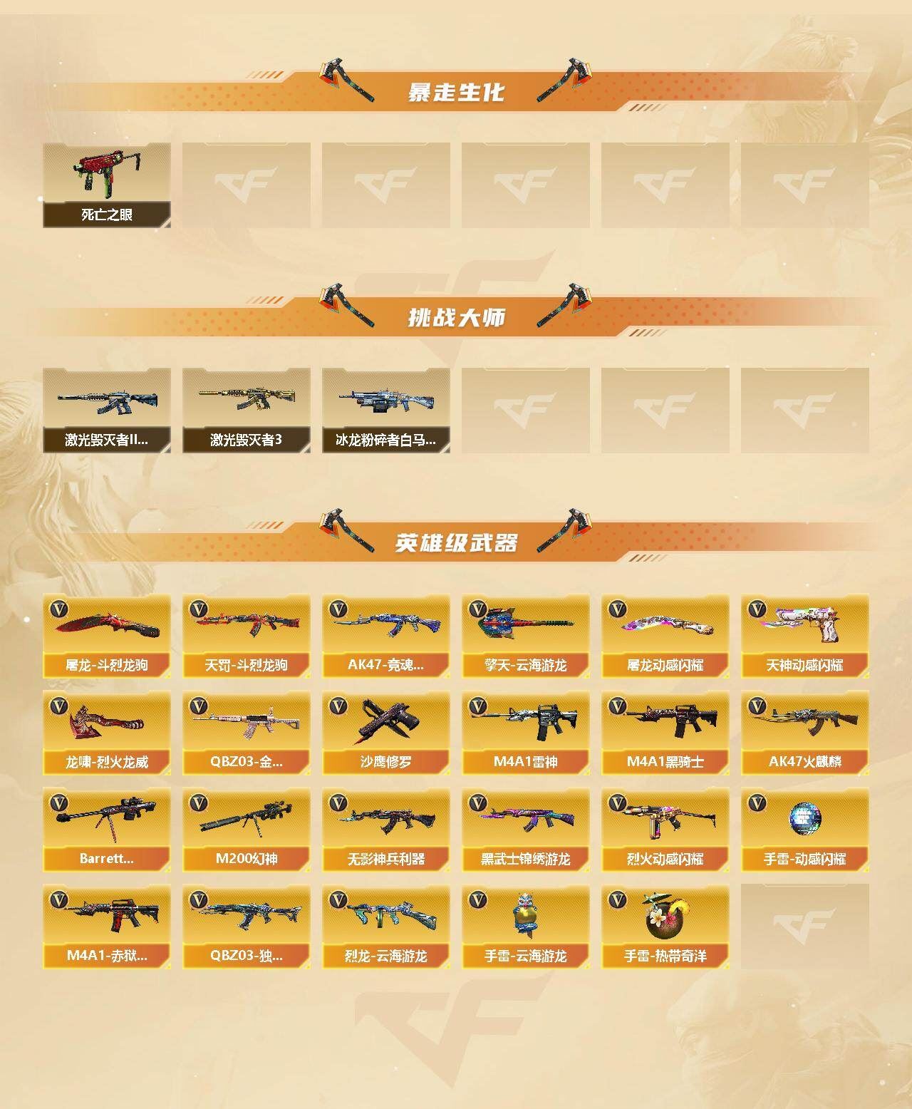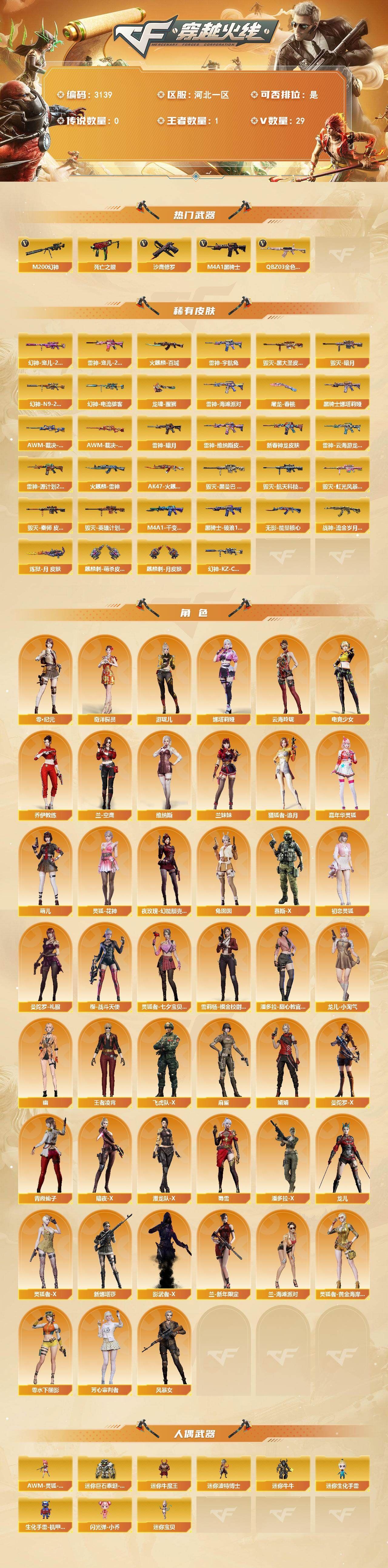 可二次可排位河北一区-29V-1王者武器数-0炫金武器数【热门武器】:QBZ03-金色蔷薇,M200-幻神*2,死亡之眼,M4A1-黑骑士,沙鹰-修罗【皮肤】:幻神-宠儿-2021MVP,M200-幻神-N9-2022MVP,幻神-电流骇客 皮肤,幻神-KZ-CFPLS25冠军 皮肤,AWM-裁决-百城联赛天津皮肤,AWM-裁决-凤灵皮肤,雷神-暗月,雷神-宠儿-2019MVP,雷神-宇航兔皮肤,雷神-维纳斯皮肤,M4A1-雷神-新春神龙皮肤,雷神-云海游龙皮肤,雷神-海滩派对 皮肤,雷神-源计划2.0专属 皮肤,火麒麟-雷神,火麒麟-百城*2,AK47-火麒麟-百城23冠军皮肤,毁灭-暗月,毁灭-黑大圣皮肤,毁灭-黑曼巴 皮肤,毁灭-航天科技皮肤,毁灭-虹光风暴 皮肤,毁灭-秦师 皮肤,毁灭-英雄计划 皮肤,M4A1-千变-孔明皮肤,黑骑士-破浪10年皮肤,M4A1-黑骑士-娜塔莉娅 皮肤,无影-能量核心,战神-流金岁月皮肤,炼狱-月 皮肤,屠龙-春桃 皮肤,龙啸-醒狮 皮肤,麒麟刺-萌杀皮肤,麒麟刺-月皮肤【角色】:零·纪元,王者凌霄,奇洋探员,乔伊教练,云海玲珑,暗夜-X,初恋灵狐,电竞少女,芳心审判者,飞虎队-X,风暴女,嘉年华灵狐,娟娟,兰-海滩派对,兰-空鹰,兰-新年限定,兰妹妹,猎狐者-追月,零-水下丽影,灵狐-花神,灵狐者-X,灵狐者-黄金海岸,灵狐者-七夕宝贝,龙儿,龙儿-小淘气,麻雀,曼陀罗-X,曼陀罗-礼服,萌儿,娜塔莉娅,潘多拉-X,潘多拉-甜心教官,潜龙队-X,青霞仙子,赛斯-X,蜀雪,兔囡囡,维纳斯,新娜塔莎,雪莉杨-摸金校尉,夜玫瑰-幻能朋克,樱-战斗天使,影武者-X,幽,游珑儿【人偶武器】:迷你宝贝,AWM-灵狐-15周年嘉年华,迷你牛魔王,迷你波特博士,迷你牛牛,迷你生化手雷,生化手雷-机甲核心*3,闪光弹-小乔,迷你巨石泰坦-魔花研究所【暴走生化】:死亡之眼【挑战大师】:冰龙粉碎者-白马银枪,激光毁灭者III-白马银枪,激光毁灭者III【英雄级武器】:AK47-火麒麟*2,M4A1-雷神,M4A1-黑骑士,无影-神兵利器,黑武士-锦绣游龙,QBZ03-独角-III,QBZ03-金色蔷薇,烈火-动感闪耀,天罚-斗烈龙驹,Barrett-毁灭,M200-幻神*2,烈龙-云海游龙,沙鹰-修罗,天神-动感闪耀,屠龙-动感闪耀,擎天-云海游龙,屠龙-斗烈龙驹,龙啸-烈火龙威,手雷-动感闪耀,手雷-云海游龙,手雷-热带奇洋,M4A1-赤狱骑士,AK47-竞魂无影【源级武器】:源·火麒麟*2,火麒麟-雷神,AK47-火麒麟-猫爪*2,源·雷神*3,源-雷神-游戏大神,魂·雷神-新春神龙,源·黑骑士*2,魂·HK417-朱雀-凤灵,源-金色蔷薇,源-极光,源·天龙,AWM-裁决-百城联赛天津*2,魂·裁决-凤灵,魂·裁决-羽掣,源·毁灭*2,灵·Barrett-朱雀-炫光,魂·天神-阿努比斯,源·擎天-萌杀,源·龙啸,魂·龙啸-秦师,魂·龙啸-玩具枪,魂·麒麟刺-神秘黑洞【道具】:CFS限定背包,云海游龙炫彩背包,全能枪王背包,冰冰企鹅背包,背包-洛丽塔,虎牙炫彩背包,超级背包,迷你冰龙背包,黄金曼提柯尔的背包,黄金超能特工背包,哔哩哔哩名片,绿色巨人,灵魂忍者,变异宝贝,迷雾幽灵,生化弹匣,夺命之镰*2,防化服*3,金色流光-枪王排位*2,星辰流光-枪王排位,枪王排位28赛季金色流光,斯沃特表情,动感闪耀表情,云海游龙表情,EP战队名片,EP战队喷图,EP战队击杀图标,C4-黑曜,C4-红龙,防弹头盔,防弹衣,C4工具钳,手雷包【特殊枪械】:1黑骑士,各种道具详情看截图、低价出售找回包 赔、截图展示段位不代 表实际段位,如赛季更新等不可抗拒因素发生变化、时限道具不保证所剩时间、标题未写送点劵默认不送【卖号买号首选亿梦】