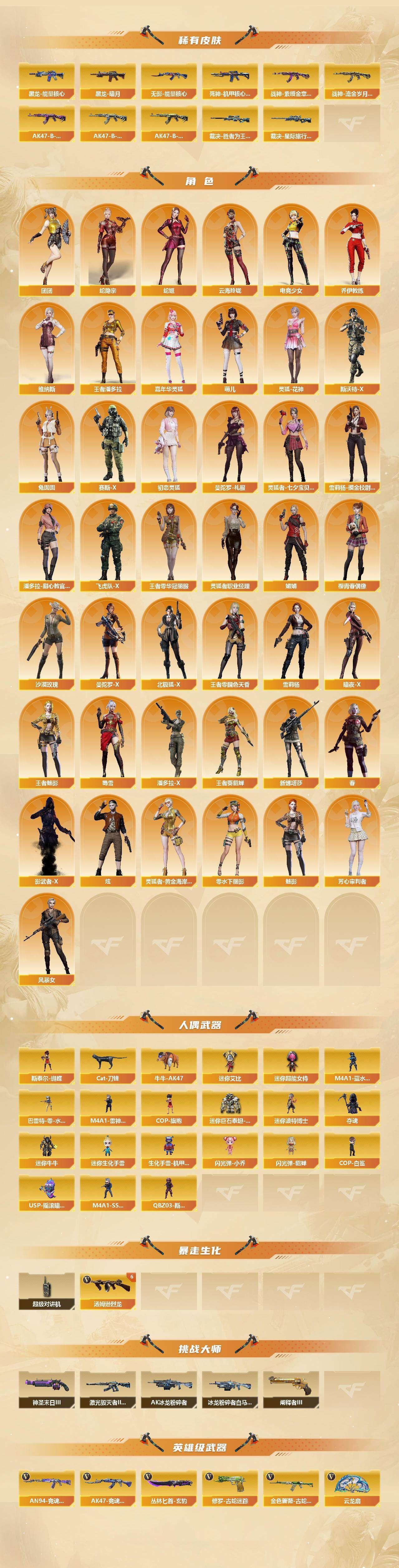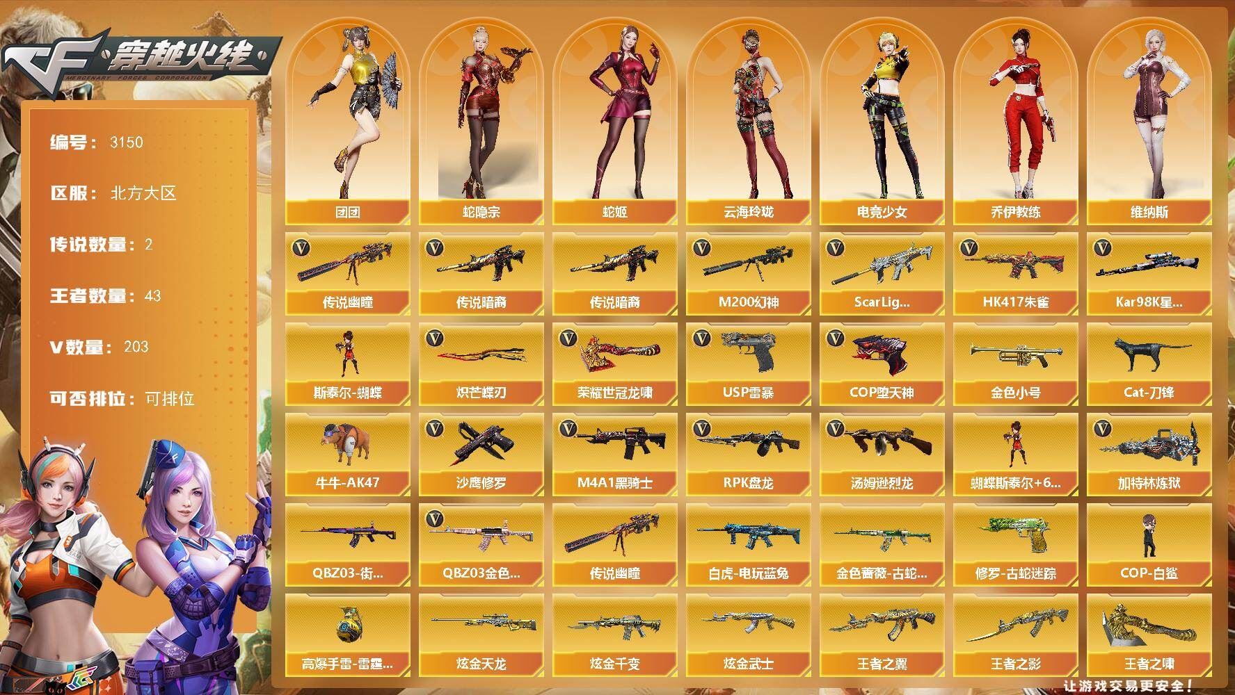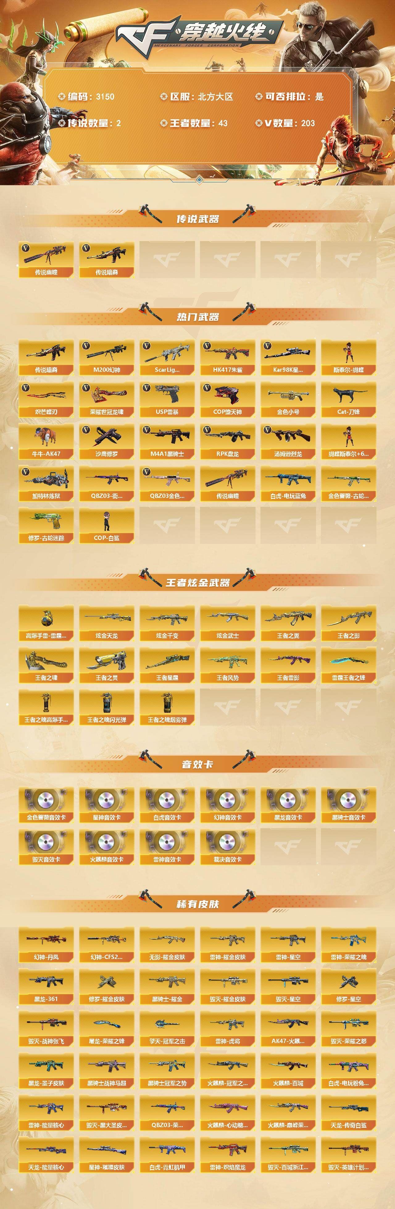 可二次可排位北方大区-203V-43王者武器数-3炫金武器数【传说武器】:传说暗裔,传说幽瞳【热门武器】:传说暗裔,传说幽瞳,QBZ03-金色蔷薇,Scar Light-白虎*2,HK417-朱雀,M200-幻神,金色蔷薇-古蛇迷踪,修罗-古蛇迷踪,白虎-电玩蓝兔,QBZ03-街机,Kar98K-星神,金色小号,Cat-刀锋,牛牛-AK47,M4A1-黑骑士*2,汤姆逊-烈龙*6,RPK-盘龙*3,加特林-炼狱*2,斯泰尔-蝴蝶,COP-白鲨,USP-雷暴,COP-堕天神,沙鹰-修罗*6,炽芒蝶刃,荣耀世冠-龙啸【王者炫金武器】:王者之翼,王者之影,王者风势,王者雷影,王者星霆,王者之灵,王者之啸,雷霆王者之锋*2,王者之魄高爆手雷*2,王者之魄闪光弹*4,王者之魄烟雾弹,高爆手雷-雷霆王者*5,炫金千变,炫金武士,炫金天龙【音效卡】:M200-幻神音效卡,AK47-火麒麟音效卡,M4A1-雷神音效卡,M4A1-黑龙音效卡,M4A1-黑骑士音效卡,Barrett-毁灭音效卡,QBZ03-金色蔷薇音效卡,AWM-裁决音效卡,Scar Light-白虎音效卡,Kar98K-星神音效卡【皮肤】:幻神-丹凤,幻神-CFS2022,白虎-电玩粉兔皮肤,白虎-霓虹机甲 皮肤,QBZ03-荣耀世冠白鲨,裁决-胜者为王 皮肤,裁决-星际旅行 皮肤,星神-璀璨皮肤,雷神-能量核心*2,雷神-荣耀之魄,雷神-星空,雷神-虎将,雷神-耀金皮肤,雷神-炽焰魔龙,火麒麟-冠军之心,AK47-火麒麟-传奇EVEN,火麒麟-百城*2,火麒麟-巅峰荣耀,火麒麟-心动糖果,毁灭-荣耀之怒,毁灭耀金皮肤,毁灭-星空*2,毁灭-战神张飞,毁灭-黑大圣皮肤,毁灭-百城浙江 皮肤,毁灭-英雄计划 皮肤,黑龙-能量核心,黑龙-暗月,M4A1-黑龙-361,黑龙-墨子皮肤,黑骑士耀金皮肤,黑骑士-冠军之势,黑骑士-战神马超,无影-能量核心,无影耀金皮肤,死神-机甲核心皮肤,战神-紫绶金章皮肤,战神-流金岁月皮肤,AK47-B-常胜将军-曹操,AK47-B-常胜将军-刘备,AK47-B-常胜将军-孙权,天龙-能量核心,AWM-天龙-传奇白鲨*2,修罗耀金皮肤,修罗-星空*2,屠龙-荣耀之锋,擎天-冠军之击【角色】:魅影,炫,春,沙漠玫瑰,王者零-华冠丽服,王者-零-国色天香,王者-葵-貂蝉,王者-魅影,王者潘多拉,蛇隐宗,乔伊教练,云海玲珑,暗夜-X,北极狐-X,初恋灵狐,电竞少女,芳心审判者,飞虎队-X,风暴女,嘉年华灵狐,娟娟,零-水下丽影,灵狐-花神,灵狐者-黄金海岸,灵狐者-七夕宝贝,灵狐者-职业经理,曼陀罗-X,曼陀罗-礼服,萌儿,潘多拉-X,潘多拉-甜心教官,赛斯-X,蛇姬,斯沃特-X,蜀雪,兔囡囡,维纳斯,新娜塔莎,雪莉杨,雪莉杨-摸金校尉,樱-青春偶像,影武者-X,团团【人偶武器】:COP-白鲨,M4A1-雷神-精英刀锋,USP-摇滚暗灵,斯泰尔-蝴蝶,巴雷特-零-水下丽影,M4A1-SS-刀锋,M4A1-蓝水晶-斯沃特精英,COP-旗袍,Cat-刀锋,牛牛-AK47,迷你波特博士,夺魂,迷你牛牛,迷你生化手雷,生化手雷-机甲核心,闪光弹-小乔,闪光弹-貂蝉,迷你艾比,迷你超能女侍,迷你巨石泰坦-魔花研究所,QBZ03-斯沃特【暴走生化】:超级对讲机【挑战大师】:AK47-冰龙粉碎者*2,冰龙粉碎者-白马银枪*2,激光毁灭者III-白马银枪,神圣爆裂者-末日III*2,阐释者III【英雄级武器】:AK47-火麒麟*2,M4A1-黑龙*3,M4A1-雷神*2,M4A1-黑骑士*2,AK47-无影,M4A1-死神,AK47-黑武士,AK12-天启,AN94-超新星,AK47-黑鲨,M4A1-龙血,M4A1-雷霆,AK47-雷暴,HK417-朱雀,Scar Light-白虎*2,无影-神兵利器,黑武士-锦绣游龙,金色蔷薇-古蛇迷踪,SCAR Light-玄豹,M4A1-玫瑰精灵,QBZ03-金色蔷薇,M4A1-猎神,烈火-动感闪耀,王者之心-觉醒版,王者之影-觉醒版,王者之武-觉醒版,王者之势-觉醒版,王者之戮-觉醒版,AK-47-猩红传说,AK47-B-战神,王者冰魄-觉醒版,特殊枪械】:蝴蝶斯泰尔+6烈龙,2白虎,2黑骑士,6烈龙,3盘龙,2炼狱,1蝴蝶斯泰尔,各种道具详情看截图、低价出售找回包 赔、截图展示段位不代 表实际段位,如赛季更新等不可抗拒因素发生变化、时限道具不保证所剩时间、标题未写送点劵默认不送【卖号买号首选亿梦】