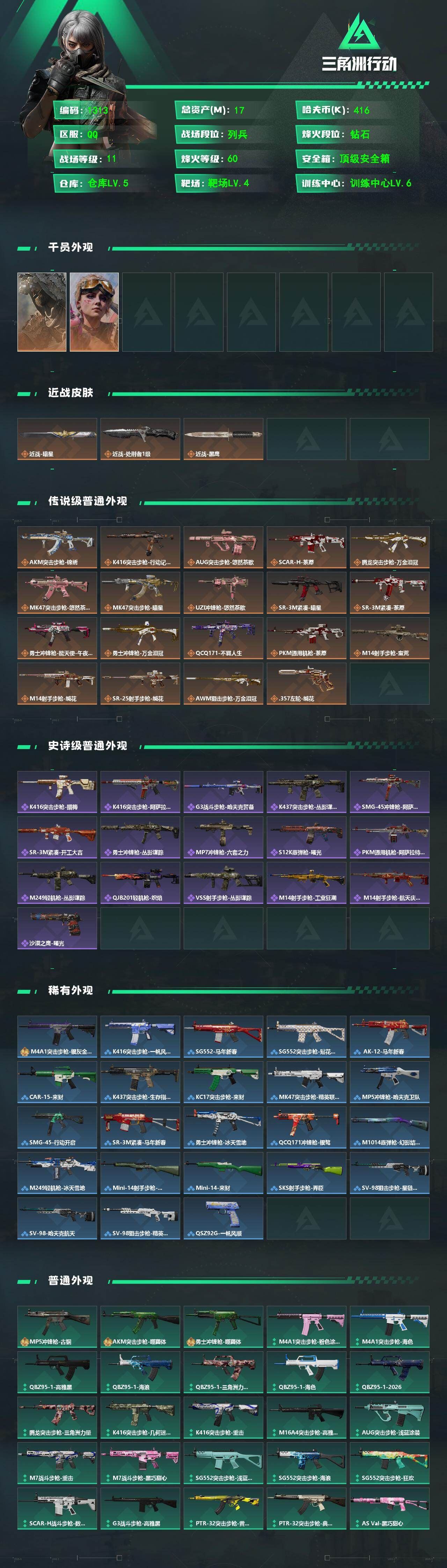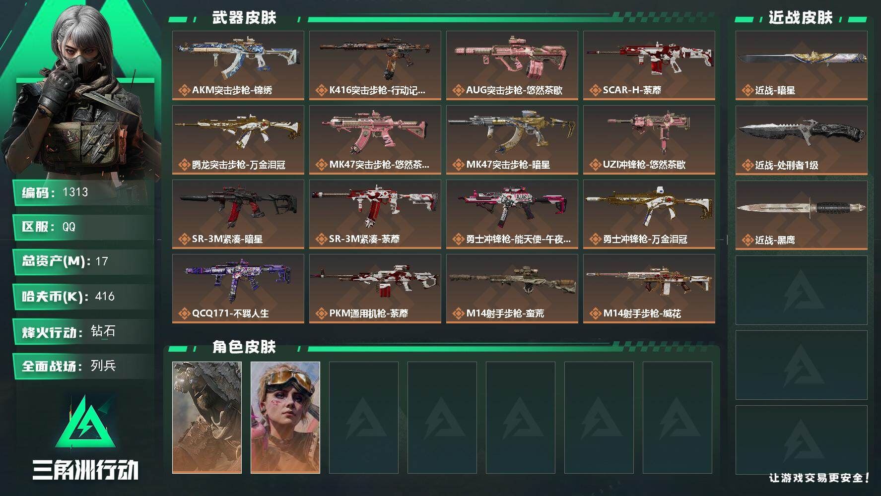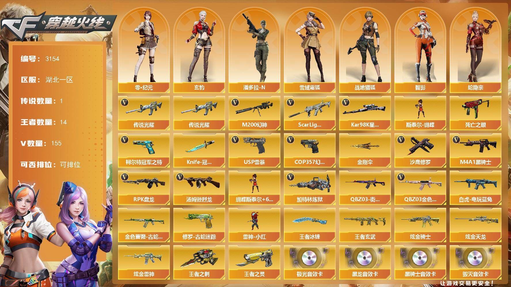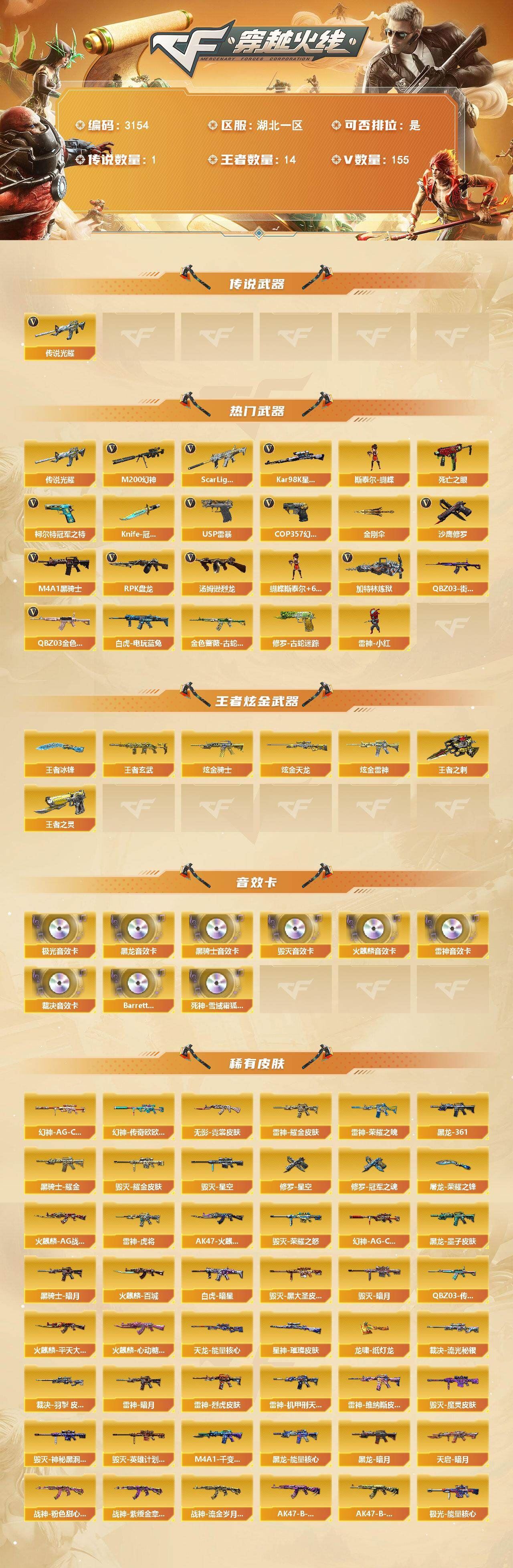 可二次可排位湖北一区-155V【传说武器】:传说光耀【热门武器】:传说光耀,QBZ03-金色蔷薇,Scar Light-白虎,M200-幻神,金色蔷薇-古蛇迷踪,修罗-古蛇迷踪,死亡之眼,白虎-电玩蓝兔,QBZ03-街机,柯尔特-冠军之特,Kar98K-星神,M4A1-黑骑士,汤姆逊-烈龙*6,RPK-盘龙*2,加特林-炼狱,斯泰尔-蝴蝶,雷神-小红,USP-雷暴,COP 357-幻灵*5,沙鹰-修罗*3,Knife-冠军之刃,金刚伞【王者炫金武器】:王者玄武,王者之灵,王者之刺,王者冰锋,炫金骑士,炫金雷神,炫金天龙【音效卡】:AK47-火麒麟音效卡,M4A1-雷神音效卡,M4A1-黑龙音效卡,M4A1-黑骑士音效卡,Barrett-毁灭音效卡,Barrett-极光音效卡,AWM-裁决音效卡,Barrett-碧霄极光音效卡,死神-雪域霜狐-怀旧音效卡【皮肤】:幻神-AG-CFPLS17冠军,幻神-传奇欧欧 皮肤,幻神-AG-CFPL S24冠军 皮肤,Scar Light-白虎-暗星,QBZ03-传奇宠儿,裁决-流光秘银,裁决-羽掣 皮肤,星神-璀璨皮肤,雷神-暗月,雷神-荣耀之魄,雷神-虎将,雷神-耀金皮肤,雷神-烈虎皮肤,雷神-机甲刑天皮肤,雷神-维纳斯皮肤,火麒麟-AG战队皮肤,AK47-火麒麟-传奇EVEN,火麒麟-平天大圣*2,火麒麟-百城,火麒麟-心动糖果,毁灭-暗月*3,毁灭-荣耀之怒,毁灭耀金皮肤*2,毁灭-星空,毁灭-黑大圣皮肤,毁灭-魔灵皮肤,毁灭-神秘黑洞皮肤,毁灭-英雄计划 皮肤,M4A1-千变-孔明皮肤,黑龙-能量核心,黑龙-暗月*2,M4A1-黑龙-361,黑龙-墨子皮肤,黑骑士-暗月,黑骑士耀金皮肤,无影-霓裳皮肤,【角色】:炫,迷迭香,影豹,鹰,玄豹,零·纪元,战地猎狐,王者春,王者玲珑,王者影豹,王者玲珑-小乔,雪域霜狐,蛇隐宗,奇洋探员,炽天使,空,暗夜-X,北极狐-X,初恋灵狐,芳心审判者,风暴女,虎妞,嘉年华灵狐,职业选手,智影,潘多拉-N【人偶武器】:雷神-小红,火麒麟-灵狐,斯泰尔-蝴蝶,巴雷特-零-水下丽影,AWM-灵狐-15周年嘉年华,COP-旗袍,迷你深渊冰龙,迷你牛魔王,迷你波特博士*2,夺魂,迷你牛牛,生化手雷-机甲核心,深渊终结者手雷,闪光弹-貂蝉,高爆手雷-大乔,迷你超能女侍,迷你巨石泰坦-魔花研究所,灵狐娃娃手雷【暴走生化】:双面神,死亡之眼,超级对讲机【挑战大师】:神圣爆裂者III,冰龙粉碎者-白马银枪*2,激光毁灭者III-白马银枪*2,激光毁灭者III,试炼破坏者III,神圣爆裂者-末日III*3【道具】:臻选金狐背包,超级背包,雪域霜狐炫彩背包,女皇终结者-魔龙之吻,救世主-黑桃战神,妩媚妖姬,黄金生化钩,绿色巨人,灵魂忍者*3,变异宝贝,迷雾幽灵*2,生化弹匣,夺命之镰*2,防化服*4,C4-黑曜,新白银C4,C4-红龙,防弹头盔*4,防弹衣*3,C4工具钳*4,手雷包*5【特殊枪械】:蝴蝶斯泰尔+6烈龙,1白虎,1黑骑士,6烈龙,2盘龙,1炼狱,1蝴蝶斯泰尔【送三角洲qq,17m总资产-416k哈夫币-60烽火等级-钻石-11战场等级-列兵【干员外观】:乌鲁鲁-荒原猎手,蛊-不羁人生【近战皮肤】:近战-暗星,近战-处刑者1级,近战-黑鹰【传说外观】:AKM突击步枪-锦绣,K416突击步枪-行动记录,AUG突击步枪-悠然茶歇,SCAR-H战斗步枪-荼蘼,腾龙突击步枪-万金泪冠,MK47突击步枪-悠然茶歇,MK47突击步枪-暗星,UZI冲锋枪-悠然茶歇,SR-3M紧凑突击步枪-暗星,SR-3M紧凑突击步枪-荼蘼,勇士冲锋枪-能天使-午夜邮差,勇士冲锋枪-万金泪冠,QCQ171冲锋枪-不羁人生,PKM通用机枪-荼蘼,M14射手步枪-蛮荒,M14射手步枪-缄花,SR-25射手步枪-缄花,AWM狙击步枪-万金泪冠,.357左轮-缄花】,各种道具详情看截图、低价出售找回包 赔、截图展示段位不代 表实际段位,如赛季更新等不可抗拒因素发生变化、时限道具不保证所剩时间、标题未写送点劵默认不送