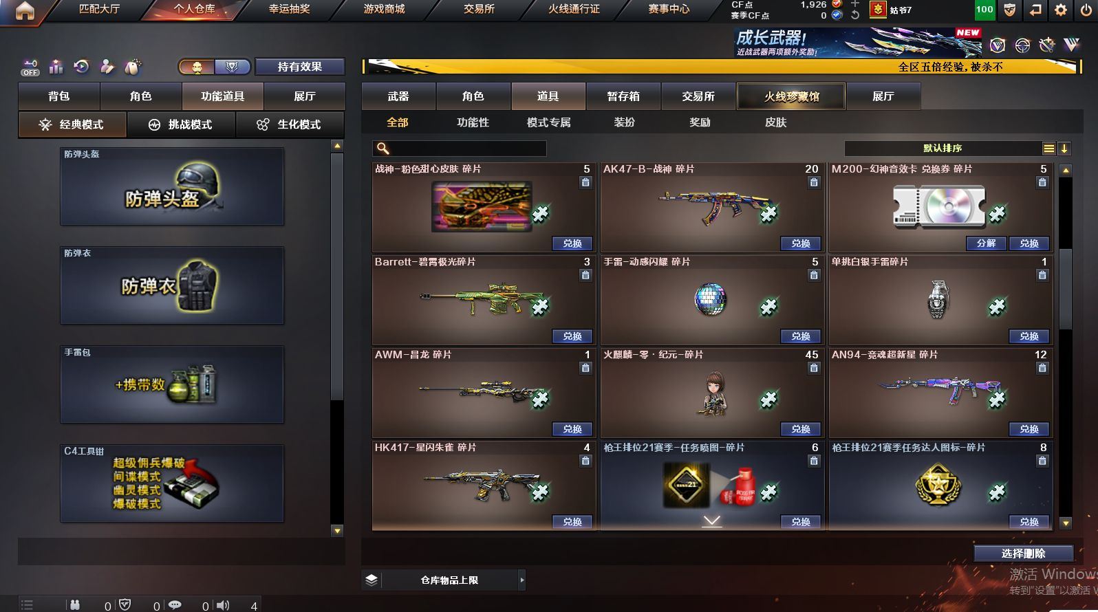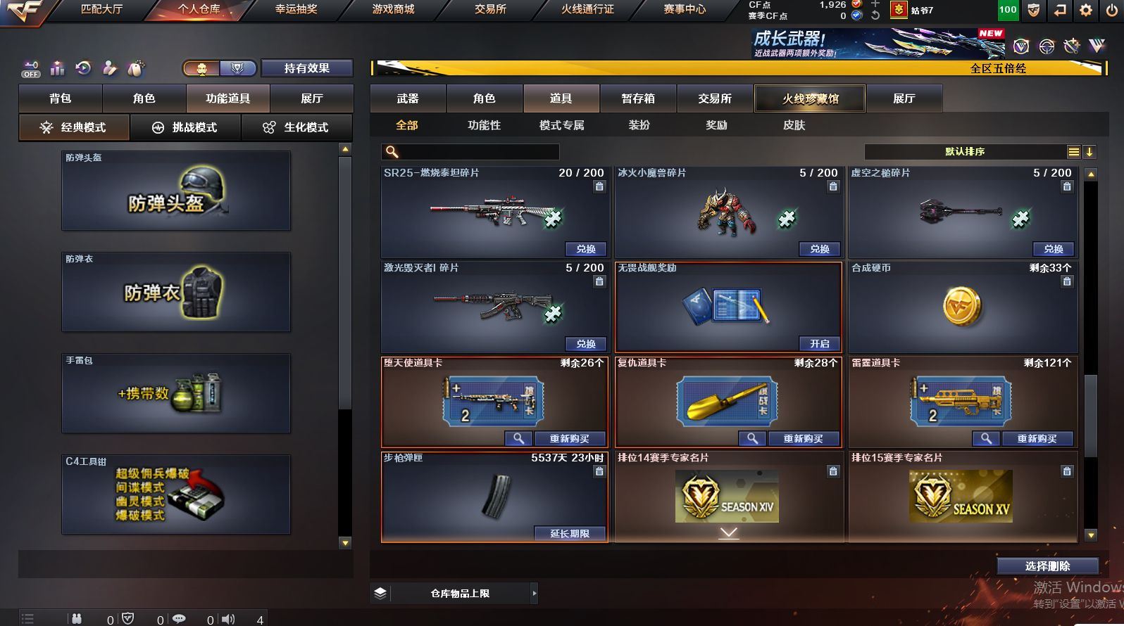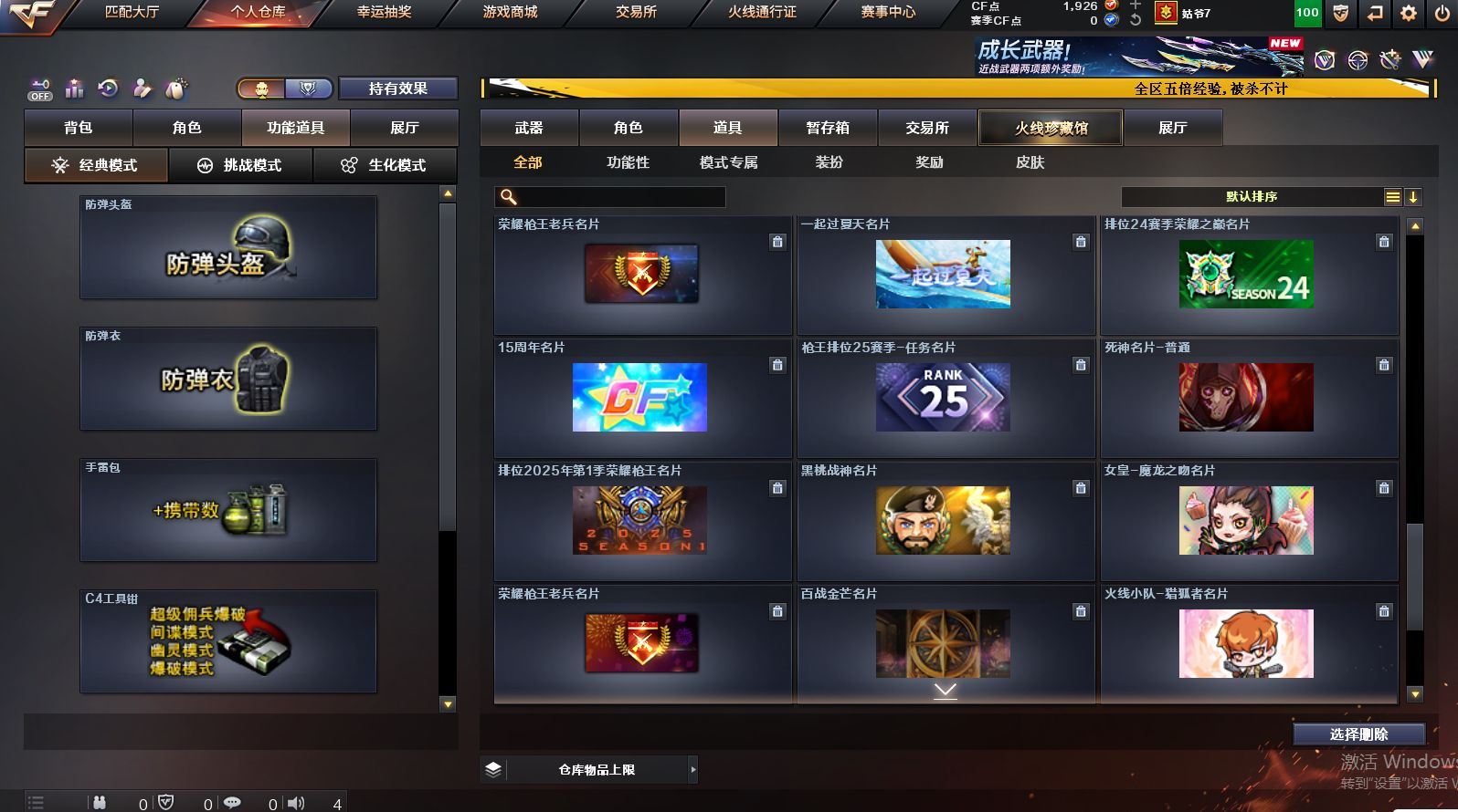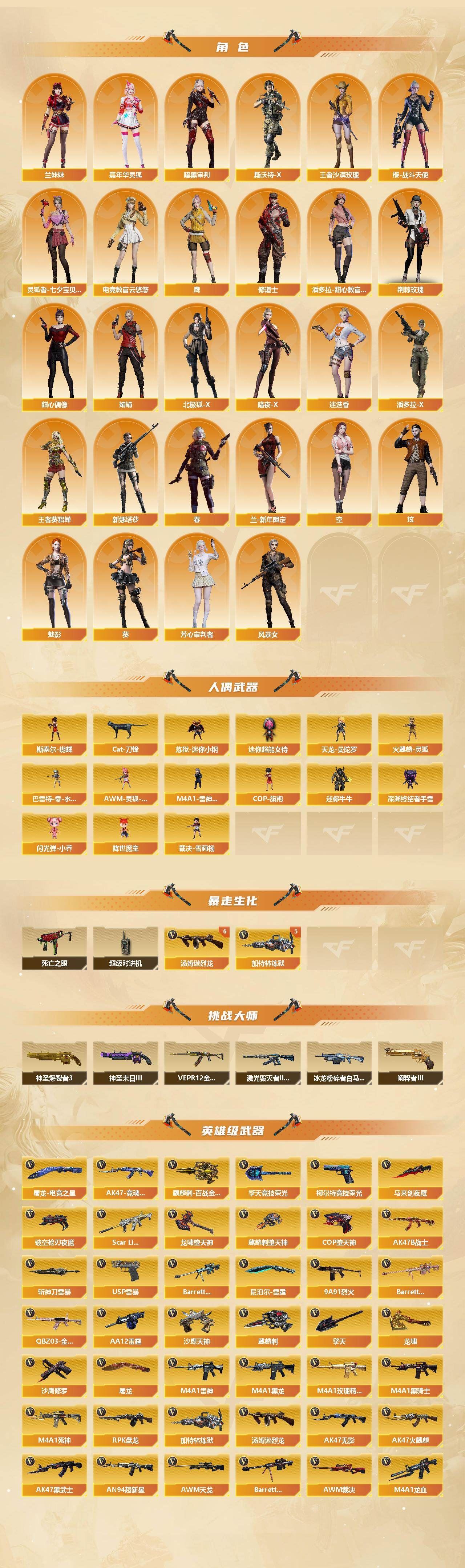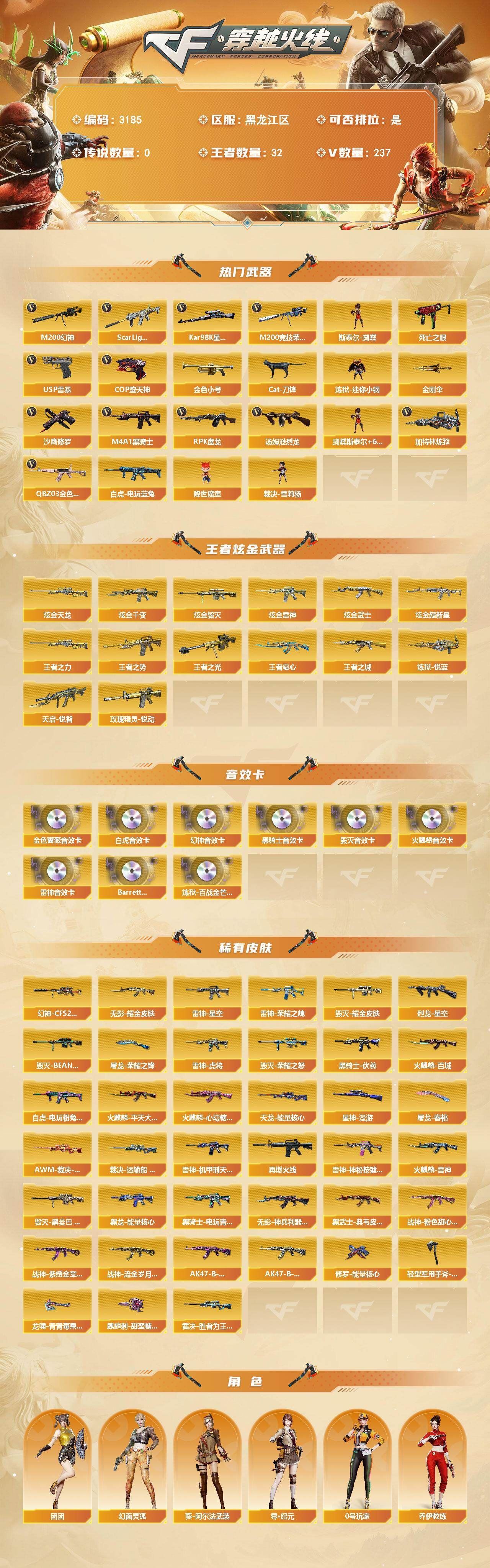 可二次可排位黑龙江区-237V-21王者武器数-8炫金武器数【热门武器】:QBZ03-金色蔷薇,Scar Light-白虎,M200-幻神,M200-竞技荣光,死亡之眼,白虎-电玩蓝兔,Kar98K-星神,金色小号,Cat-刀锋,炼狱-迷你小钢,M4A1-黑骑士,汤姆逊-烈龙*9,RPK-盘龙*4,加特林-炼狱*5,斯泰尔-蝴蝶,降世魔童,裁决-雪莉杨,USP-雷暴*2,COP-堕天神*3,沙鹰-修罗*3,金刚伞【王者炫金武器】:王者之城,天启-悦智*3,王者之势*2,玫瑰精灵-悦动*3,王者霜心,王者之光,王者之力,炼狱-悦蓝,炫金千变,炫金雷神,炫金武士*2,炫金超新星,炫金毁灭*2,炫金天龙【音效卡】:M200-幻神音效卡,AK47-火麒麟音效卡,M4A1-雷神音效卡*2,M4A1-黑骑士音效卡,Barrett-毁灭音效卡,QBZ03-金色蔷薇音效卡,Scar Light-白虎音效卡,Barrett-碧霄极光音效卡,炼狱-百战金芒-庆典舞曲音效卡【皮肤】:幻神-CFS2022,白虎-电玩粉兔皮肤,AWM-裁决-凤灵皮肤,裁决-运输船 皮肤,裁决-胜者为王 皮肤,星神-漫游,烈龙-星空,雷神-荣耀之魄,雷神-星空,雷神-虎将,雷神-机甲刑天皮肤,M4A1-再燃火线,雷神-神秘按键 皮肤,火麒麟-雷神,火麒麟-平天大圣,火麒麟-百城,火麒麟-心动糖果,毁灭-荣耀之怒,毁灭耀金皮肤,毁灭-BEAN-2020MVP,毁灭-黑曼巴 皮肤,黑龙-能量核心*2,黑骑士-伏羲,黑骑士-电玩青兔皮肤,无影耀金皮肤,无影-神兵利器 皮肤,黑武士-典韦皮肤,战神-粉色甜心皮肤,战神-紫绶金章皮肤*5,战神-流金岁月皮肤*2,AK47-B-常胜将军-曹操,AK47-B-常胜将军-刘备*2,天龙-能量核心*2,修罗-能量核心,屠龙-荣耀之锋,屠龙-春桃 皮肤,轻型军用手斧-再燃火线,龙啸-青青莓果 皮肤,麒麟刺-甜蜜糖果 皮肤【角色】:葵,魅影,炫,春,迷迭香,电竞教官-云悠悠,鹰,零·纪元,4防王者-葵-貂蝉,4防王者沙漠玫瑰,乔伊教练,修道士,葵-阿尔法武装,幻面灵狐,空,暗夜-X,暗夜审判,北极狐-X,芳心审判者,风暴女,嘉年华灵狐,荆棘玫瑰,娟娟,兰-新年限定,兰妹妹,0号玩家,灵狐者-七夕宝贝,潘多拉-X,潘多拉-甜心教官,斯沃特-X,甜心偶像,新娜塔莎,樱-战斗天使,团团【人偶武器】:裁决-雪莉杨,天龙-曼陀罗,火麒麟-灵狐,M4A1-雷神-精英刀锋,炼狱-迷你小钢,斯泰尔-蝴蝶,巴雷特-零-水下丽影,AWM-灵狐-15周年嘉年华*2,COP-旗袍,Cat-刀锋,迷你牛牛,深渊终结者手雷,闪光弹-小乔,迷你超能女侍,降世魔童【暴走生化】:死亡之眼,超级对讲机【挑战大师】:神圣爆裂者III,冰龙粉碎者-白马银枪*2,激光毁灭者III-白马银枪,VEPR-12-金魔*2,神圣爆裂者-末日III*2,阐释者III【英雄级武器】:AK47-火麒麟*3,M4A1-黑龙*2,M4A1-雷神,M4A1-黑骑士,AK47-无影,M4A1-死神,AK47-黑武士*4,AN94-超新星,AK47-机械迷城,AK47-黑鲨*4,M4A1-龙血*5,AK47-雷暴*2,M4A1-堕天神,Scar Light-白虎,M4A1-夜魔,无影-神兵利器,QBZ03-独角-III,M4A1-玫瑰精灵*2,QBZ03-金色蔷薇,M4A1-猎神,9A91-烈火,王者之心-觉醒版,王者之影-觉醒版,王者之武-觉醒版,王者之魄-觉醒版,王者之幻-觉醒版,AK-47-猩红传说*8,AK47-B-战神,QBZ-03-王者蔷薇-觉醒版,白虎-电玩蓝兔,HK417-朱雀-电竞之星,AK47-B-战士,AWM-天龙,Barrett-毁灭*3,AWM-裁决,M200-幻神,Barrett-朱雀,Kar98K-星神,M200-竞技荣光,Barrett-金色蔷薇,王者之怒-觉醒版,王者之光-觉醒版,Barrett-暗月传说,RPK-盘龙*4,加特林-炼狱*5,盘龙-悦心-觉醒版*2,炼狱-悦蓝-觉醒版,汤姆逊-烈龙*9,AA-12-雷霆,沙鹰-修罗*3,沙鹰-天神*5,USP-雷暴*2,COP-堕天神*3,柯尔特-竞技荣光,破空枪刃-夜魔,王者之魂-觉醒版,王者之灵-觉醒版,屠龙*2,龙啸*2,麒麟刺-堕天神,马来剑-夜魔,擎天,麒麟刺*7各种道具详情看截图、低价出售找回包 赔、截图展示段位不代 表实际段位,如赛季更新等不可抗拒因素发生变化、时限道具不保证所剩时间、标题未写送点劵默认不送