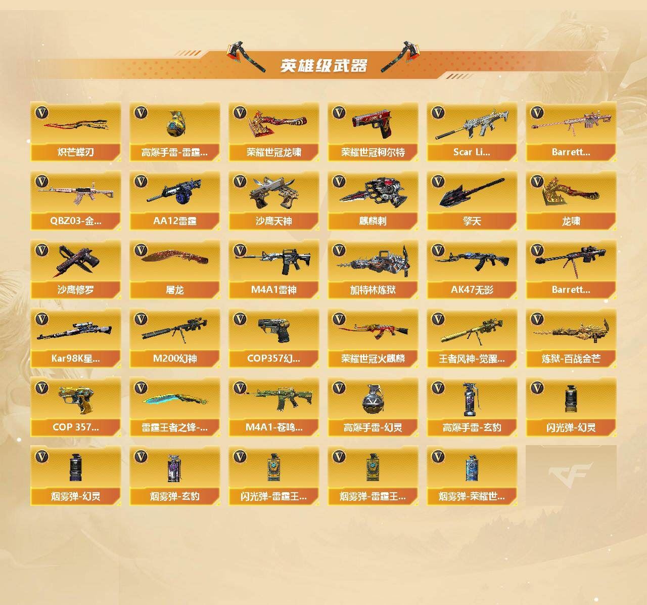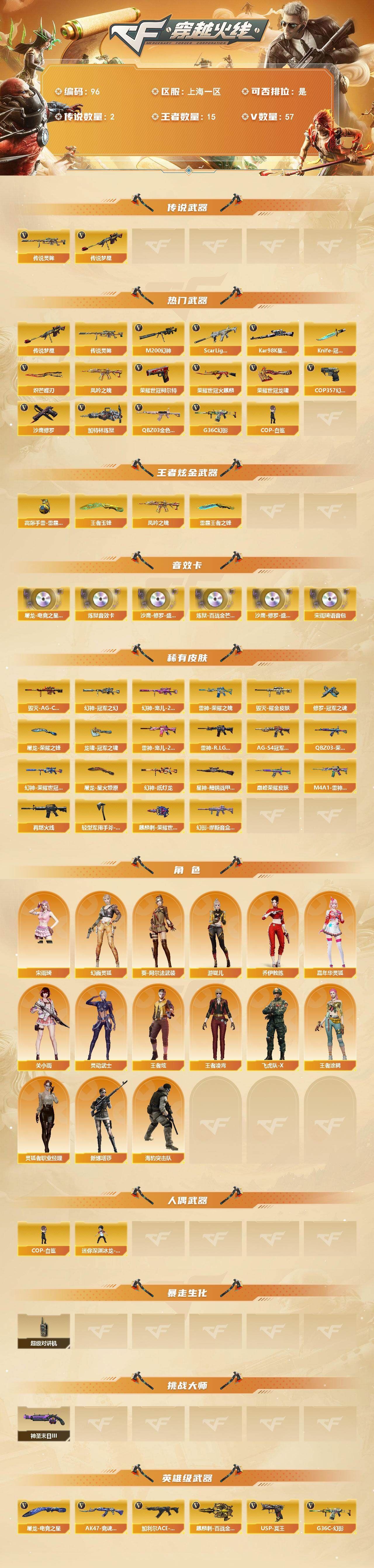 可二次可排位上海一区-57V-15王者武器数-0炫金武器数【传说武器】:传说梦魇,传说灵眸【热门武器】:传说梦魇,传说灵眸,G36C-幻影,QBZ03-金色蔷薇,Scar Light-白虎,M200-幻神*2,凤吟之魄,荣耀世冠-火麒麟,荣耀世冠-柯尔特,Kar98K-星神,加特林-炼狱,COP-白鲨,COP 357-幻灵,沙鹰-修罗,Knife-冠军之刃,炽芒蝶刃*2,荣耀世冠-龙啸【王者炫金武器】:凤吟之魄,雷霆王者之锋,王者玉锋,高爆手雷-雷霆王者*3【音效卡】:加特林-炼狱音效卡,屠龙-电竞之星-竞星跃动音效卡,沙鹰-修罗-盛典舞曲音效卡*2,炼狱-百战金芒-庆典舞曲音效卡,宋雨琦语音包【皮肤】:幻神-冠军之幻,幻神-宠儿-2021MVP,M200-幻神-荣耀世冠白鲨,幻神-纸灯龙皮肤,QBZ03-荣耀世冠白鲨,QBZ03-巅峰荣耀皮肤,星神-黯钢战甲 皮肤,雷神-荣耀之魄,雷神-宠儿-2019MVP,雷神-R.LGD-CFPLS18冠军,M4A1-雷神-巅峰荣耀皮肤,M4A1-再燃火线,毁灭耀金皮肤,毁灭-AG-CFPLS15冠军,黑骑士-AG-S4冠军典藏,幻影-缪斯音盒 皮肤,修罗-冠军之魂,屠龙-荣耀之锋,屠龙-星火燎原,龙啸-冠军之啸,轻型军用手斧-再燃火线,麒麟刺-荣耀世冠白鲨【角色】:关小雨,王者炫,王者凌霄,王者涂鸦,乔伊教练,葵-阿尔法武装,幻面灵狐,宋雨琦,飞虎队-X,嘉年华灵狐,灵动武士,灵狐者-职业经理,新娜塔莎,游珑儿,海豹突击队【人偶武器】:COP-白鲨,迷你深渊冰龙-王绿豆【暴走生化】:超级对讲机【挑战大师】:神圣爆裂者-末日III【英雄级武器】:M4A1-雷神,AK47-无影,Scar Light-白虎,G36C-幻影,QBZ03-金色蔷薇,荣耀世冠-火麒麟,加利尔ACE-天袭,Barrett-毁灭,M200-幻神*2,Kar98K-星神,Barrett-金色蔷薇,王者风神-觉醒版,加特林-炼狱,炼狱-百战金芒,AA-12-雷霆,沙鹰-修罗,沙鹰-天神*2,COP 357-雷霆王者-觉醒版,COP 357-幻灵,荣耀世冠-柯尔特,USP-冥王,屠龙,龙啸,擎天,麒麟刺,炽芒蝶刃*2,荣耀世冠-龙啸,麒麟刺-百战金芒,雷霆王者之锋-觉醒版,屠龙-电竞之星,高爆手雷-幻灵,高爆手雷-玄豹*3,高爆手雷-雷霆王者-觉醒版*3,闪光弹-幻灵,闪光弹-雷霆王者-觉醒版*3,烟雾弹-幻灵,烟雾弹-玄豹,烟雾弹-雷霆王者-觉醒版*3,烟雾弹-荣耀世冠EP*2,M4A1-苍鸣雷神,AK47-竞魂无影【其他武器】:魂·雷神-神秘按键,魂·雷神-萌柴,白虎-九尾白狐,AWM-裁决-百城联赛天津,魂·裁决-凤灵,魂·裁决-羽掣,御·毁灭-黑大圣,魂·Barrett-朱雀-锦鲤,灵·Barrett-朱雀-炫光,魂·炼狱-月,魂·修罗-迷彩【道具】:宋雨琦炫彩背包,BS战队炫彩背包,EP战队炫彩背包,女皇终结者-背包,百战金芒炫彩背包,女皇终结者-魔龙之吻,绿色巨人,灵魂忍者,变异宝贝,迷雾幽灵,生化弹匣,夺命之镰,防化服*3,金色流光-枪王排位*2,星辰流光-枪王排位,流光-鎏金之域,枪王排位28赛季金色流光,枪王排位29赛季金色流光,语音特效-盛典烟火,萌萌小葵表情,C4-沙漠,防弹头盔*4,防弹衣*4,C4工具钳*4,手雷包*4【特殊枪械】:1白虎,1炼狱各种道具详情看截图、低价出售找回包 赔、截图展示段位不代 表实际段位,如赛季更新等不可抗拒因素发生变化、时限道具不保证所剩时间、标题未写送点劵默认不送【卖号买号首选亿梦】