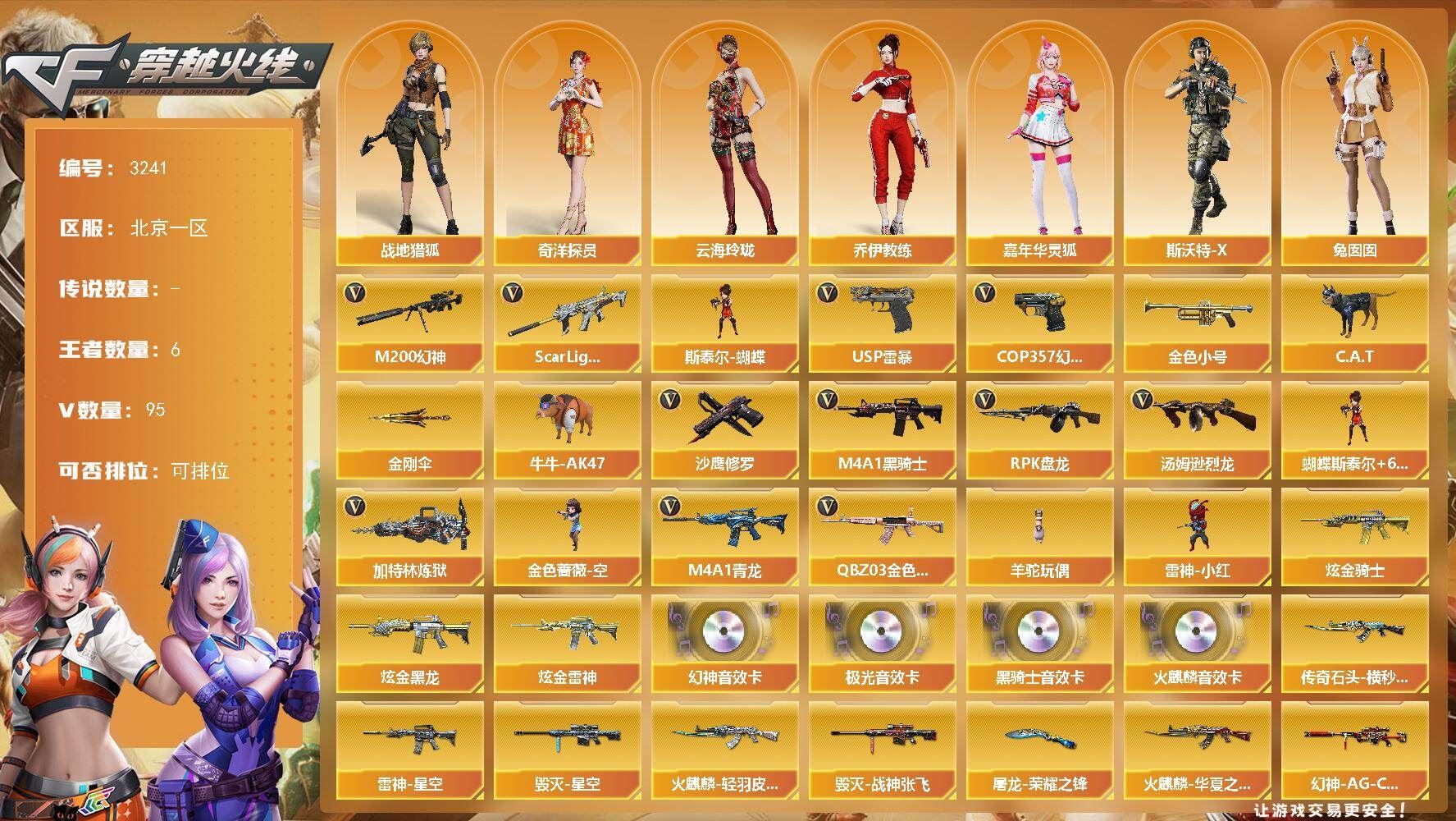 可二次可排位北京一区-95V【热门武器】:QBZ03-金色蔷薇,Scar Light-白虎,M4A1-青龙,M200-幻神,金色小号,C.A.T,牛牛-AK47,M4A1-黑骑士,汤姆逊-烈龙*6,RPK-盘龙*6,加特林-炼狱*2,金色蔷薇-空,斯泰尔-蝴蝶,羊驼玩偶,雷神-小红,USP-雷暴*2,COP 357-幻灵,沙鹰-修罗,金刚伞【王者炫金武器】:炫金骑士,炫金黑龙,炫金雷神【音效卡】:M200-幻神音效卡,AK47-火麒麟音效卡,M4A1-黑骑士音效卡,Barrett-极光音效卡【皮肤】:幻神-AG-CFPLS17冠军,QBZ03-AG-CFPLS19冠军,雷神-星空,雷神-烈虎皮肤,雷神-宇航兔皮肤,火麒麟-华夏之心,火麒麟-轻羽皮肤,传奇石头-横秒之巅,火麒麟-平天大圣,毁灭-星空,毁灭-战神张飞,战神-粉色甜心皮肤,战神-流金岁月皮肤,AK47-B-常胜将军-曹操,AK47-B-常胜将军-刘备*2,AK47-B-常胜将军-孙权,极光-能量核心,屠龙-荣耀之锋【角色】:零,战地猎狐,王者零-华冠丽服,王者-葵-貂蝉,王者春,王者-魅影,奇洋探员,乔伊教练,云海玲珑,芳心审判者,风暴女*2,虎妞,嘉年华灵狐,潘多拉-X,斯沃特-X,兔囡囡,职业选手【人偶武器】:雷神-小红,金色蔷薇-空,斯泰尔-蝴蝶,AWM-灵狐-15周年嘉年华,C.A.T,牛牛-AK47,迷你裂空之翼,迷你波特博士,夺魂,迷你牛牛,迷你生化手雷,深渊终结者手雷,闪光弹-貂蝉,高爆手雷-大乔【暴走生化】:黑龙吞噬者,超级对讲机【挑战大师】:火狱乱世-超越Max,神圣爆裂者III,冰龙粉碎者-白马银枪,机甲撕裂者III,神圣爆裂者-末日III*2【英雄级武器】:AK47-火麒麟,M4A1-雷神*2,M4A1-黑骑士,AK12-天启,AN94-超新星,AK47-机械迷城,M4A1-龙血,AK47-雷暴,M4A1-青龙,Scar Light-白虎,无影-神兵利器,QBZ03-金色蔷薇,9A91-烈火,王者之武-觉醒版,王者之势-觉醒版,AK-47-猩红传说,AK47-B-战神,王者火魄-觉醒版,黑骑士-海王,AK47-B-常胜将军,QBZ-03-王者蔷薇-觉醒版,AK47-B-身先士卒,AK47-B-战士,AWM-天龙,Barrett-毁灭,Barrett-极光,AWM-裁决,M200-幻神,Barrett-暗月传说,RPK-盘龙*6,加特林-炼狱*2,汤姆逊-烈龙*6,AA-12-雷霆,沙鹰-修罗,沙鹰-天神,USP-雷暴*2,COP 357-幻灵,柯尔特-电竞装甲,柯尔特-竞技荣光,屠龙,龙啸,麒麟刺-堕天神,擎天*2,麒麟刺*2,幻灵之锋*3,擎天-竞技荣光,龙啸-堕天神,斩神刀-雷暴,王者之击-觉醒版*2,高爆手雷-雷暴*5,高爆手雷-堕天神,高爆手雷-幻灵,高爆手雷-竞技荣光,闪光弹-雷暴*5,闪光弹-堕天神,闪光弹-竞技荣光,烟雾弹-雷暴*5,烟雾弹-堕天神,烟雾弹-幻灵*2,烟雾弹-竞技荣光,M4A1-赤狱骑士【道具】:云海游龙炫彩背包,全能枪王背包,机械魔影背包-红色,背包-葫芦兄弟,虎牙炫彩背包,超级背包,女皇终结者-魔龙之吻,救世主-黑桃战神,生化弹匣,夺命之镰,防化服,金色流光-枪王排位*2,星辰流光-枪王排位,巅峰赛先锋-金色流光,枪王排位28赛季金色流光,枪王排位29赛季金色流光,CFPL选手表情-第1套,C4-高无钳,防弹头盔*5,防弹衣*5,C4工具钳*5,手雷包*5【特殊枪械】:蝴蝶斯泰尔+6烈龙,1白虎,1黑骑士,6烈龙,6盘龙,2炼狱,1蝴蝶斯泰尔,各种道具详情看截图、低价出售找回包 赔、截图展示段位不代 表实际段位,如赛季更新等不可抗拒因素发生变化、时限道具不保证所剩时间、标题未写送点劵默认不送【卖号买号首选亿梦】