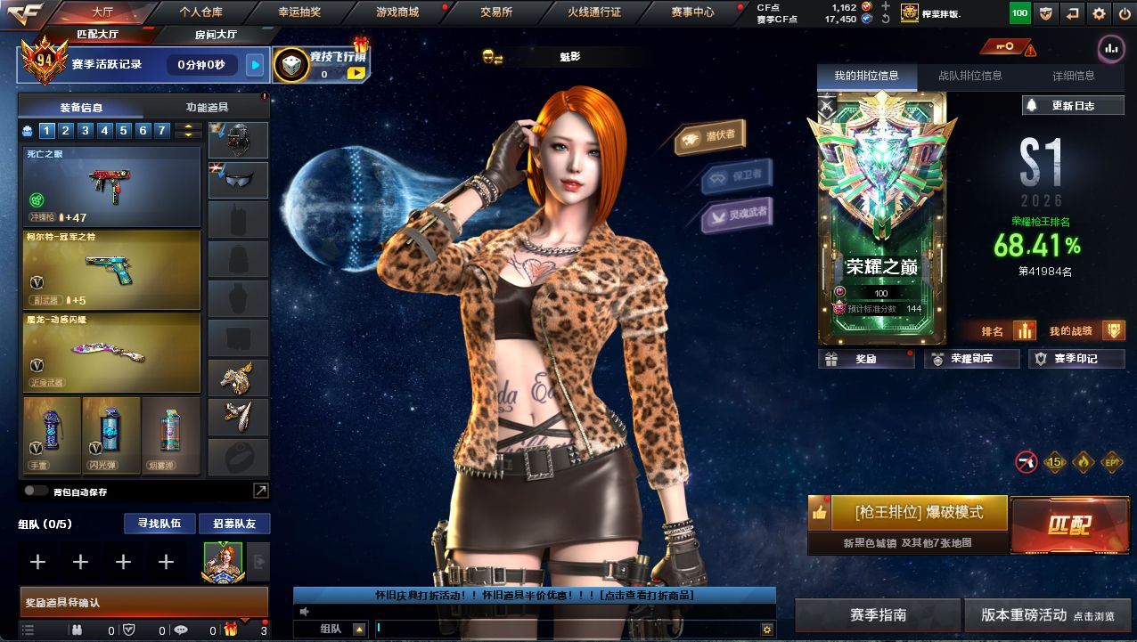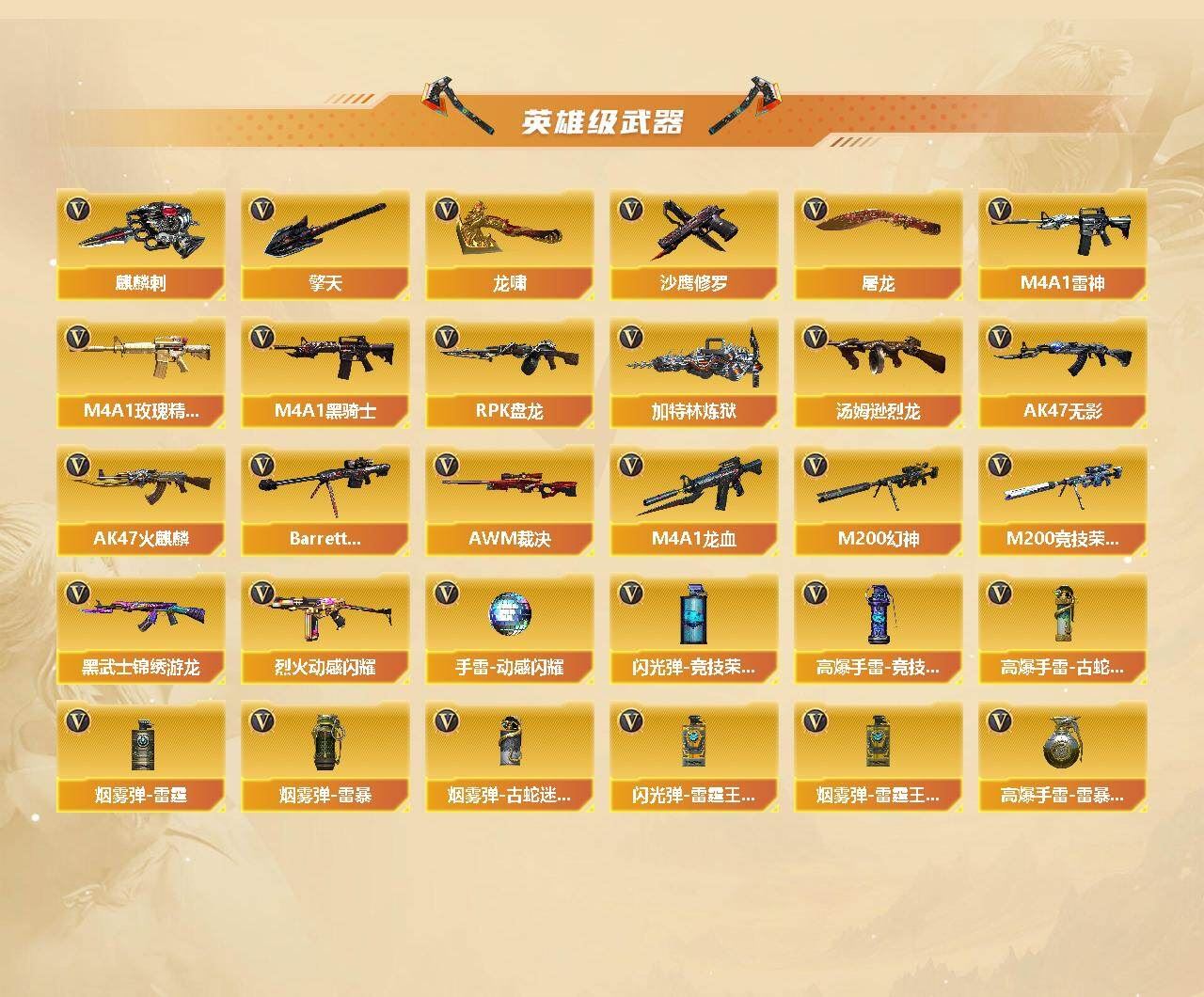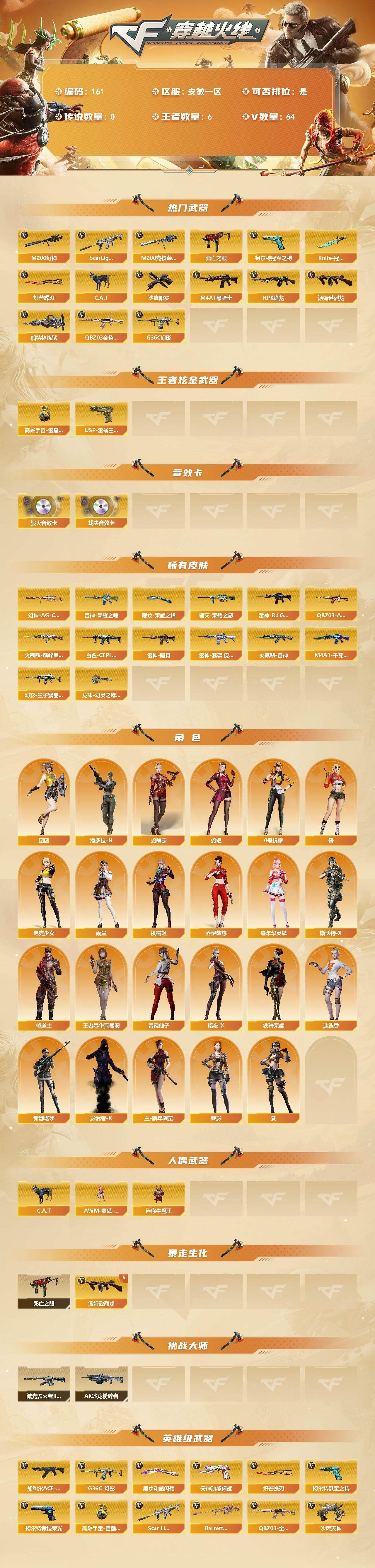 可二次可排位安徽一区-64V-6王者武器数【热门武器】:G36C-幻影,QBZ03-金色蔷薇*2,Scar Light-白虎,M200-幻神,M200-竞技荣光,死亡之眼,柯尔特-冠军之特,C.A.T,M4A1-黑骑士,汤姆逊-烈龙*6,RPK-盘龙,加特林-炼狱,沙鹰-修罗,Knife-冠军之刃,炽芒蝶刃【王者炫金武器】:USP-雷暴王者,高爆手雷-雷霆王者【音效卡】:Barrett-毁灭音效卡,AWM-裁决音效卡【皮肤】:幻神-AG-CFPL S24冠军 皮肤,白虎-白鲨-CFPLS23冠军,QBZ03-AG-CFPLS19冠军,幻影-量子聚变 皮肤,雷神-暗月,雷神-荣耀之魄,雷神-R.LGD-CFPLS18冠军,雷神-紫凛 皮肤,火麒麟-雷神,火麒麟-巅峰荣耀,毁灭-荣耀之怒,M4A1-千变-孔明皮肤,屠龙-荣耀之锋,龙啸-幻灵之哮 皮肤【角色】:葵,魅影,迷迭香,雨墨,机械姬,四防研,王者零-华冠丽服,蛇隐宗,乔伊教练,修道士,暗夜-X,电竞少女,嘉年华灵狐,兰-新年限定,0号玩家,青霞仙子,蛇姬,斯沃特-X,铁骑荣耀,新娜塔莎,影武者-X,潘多拉-N,团团【人偶武器】:AWM-灵狐-15周年嘉年华,C.A.T,迷你牛魔王【暴走生化】:死亡之眼【挑战大师】:AK47-冰龙粉碎者,激光毁灭者III-白马银枪【英雄级武器】:AK47-火麒麟*2,M4A1-雷神,M4A1-黑骑士,AK47-无影,M4A1-龙血,Scar Light-白虎,QBZ03-金色蔷薇*2,加利尔ACE-天袭,黑武士-锦绣游龙,G36C-幻影,M4A1-玫瑰精灵,烈火-动感闪耀,Barrett-毁灭,AWM-裁决,M200-幻神,M200-竞技荣光,Barrett-金色蔷薇,RPK-盘龙,加特林-炼狱,汤姆逊-烈龙*6,沙鹰-修罗,沙鹰-天神,柯尔特-冠军之特,柯尔特-竞技荣光,天神-动感闪耀,屠龙,龙啸*3,擎天*2,麒麟刺,炽芒蝶刃,屠龙-动感闪耀,高爆手雷-竞技荣光*2,手雷-动感闪耀,高爆手雷-古蛇迷踪,高爆手雷-雷霆王者-觉醒版,高爆手雷-雷暴王者,闪光弹-竞技荣光*5,闪光弹-雷霆王者-觉醒版*2,烟雾弹-雷霆,烟雾弹-雷暴,烟雾弹-古蛇迷踪,烟雾弹-雷霆王者-觉醒版【道具】:CFS限定背包,战舰背包,炫彩背包,老虎背包,超级背包,女皇终结者-魔龙之吻,绿色巨人,灵魂忍者,迷雾幽灵,夺命之镰,防化服*3,枪王排位28赛季金色流光,枪王排位29赛季金色流光,动感闪耀表情,CFPL选手表情-第1套,EP战队名片,EP战队喷图,C4-黑曜,防弹头盔*3,防弹衣*3,C4工具钳*3,手雷包*3【特殊枪械】:1白虎,1黑骑士,6烈龙,1盘龙,1炼狱,各种道具详情看截图、低价出售找回包 赔、截图展示段位不代 表实际段位,如赛季更新等不可抗拒因素发生变化、时限道具不保证所剩时间、标题未写送点劵默认不送【卖号买号首选亿梦】