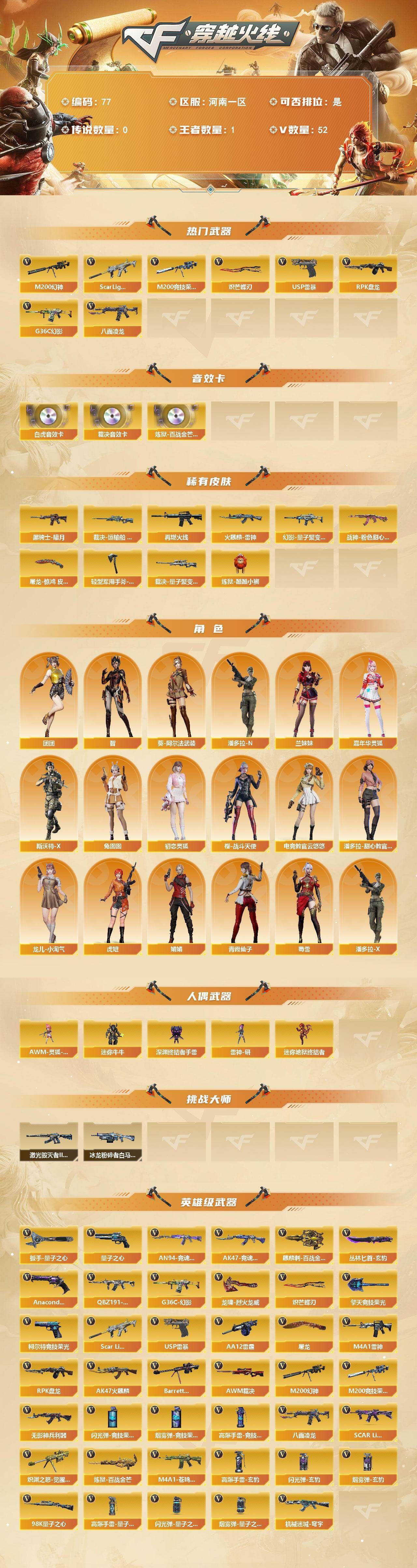 R57181 可二次可排位河南一区-52V【热门武器】:G36C-幻影,Scar Light-白虎,M200-幻神,M200-竞技荣光,八面凌龙,RPK-盘龙,USP-雷暴*2,炽芒蝶刃【音效卡】:AWM-裁决音效卡,Scar Light-白虎音效卡,炼狱-百战金芒-庆典舞曲音效卡【皮肤】:裁决-运输船 皮肤,裁决-量子聚变 皮肤,M4A1-再燃火线,火麒麟-雷神,黑骑士-暗月,幻影-量子聚变 皮肤,战神-粉色甜心皮肤,炼狱-酷酷小狮,屠龙-惊鸿 皮肤,轻型军用手斧-再燃火线【角色】:4防电竞教官-云悠悠,4防智,葵-阿尔法武装,初恋灵狐,虎妞,嘉年华灵狐,娟娟,兰妹妹,龙儿-小淘气,潘多拉-X,潘多拉-甜心教官,青霞仙子,斯沃特-X,蜀雪,兔囡囡,樱-战斗天使,潘多拉-N,团团【人偶武器】:雷神-研,迷你地狱终结者,AWM-灵狐-15周年嘉年华,迷你牛牛,深渊终结者手雷【挑战大师】:冰龙粉碎者-白马银枪,激光毁灭者III-白马银枪*3【英雄级武器】:AK47-火麒麟,M4A1-雷神,Scar Light-白虎,无影-神兵利器,G36C-幻影,八面凌龙,QBZ191-银翼,SCAR Light-玄豹,机械迷城-穹宇,Barrett-毁灭,AWM-裁决,M200-幻神,M200-竞技荣光,炽渊之怒-觉醒版,Kar98K-量子之心,RPK-盘龙,炼狱-百战金芒,AA-12-雷霆,USP-雷暴*2,柯尔特-竞技荣光,Anaconda-玄豹,Anaconda-量子之心,屠龙,擎天-竞技荣光,炽芒蝶刃,麒麟刺-百战金芒,丛林匕首-玄豹,扳手-量子之心,龙啸-烈火龙威,高爆手雷-竞技荣光*6,高爆手雷-玄豹*3,高爆手雷-量子之心,闪光弹-竞技荣光,闪光弹-玄豹,闪光弹-量子之心,烟雾弹-竞技荣光*3,烟雾弹-玄豹*3,烟雾弹-量子之心,M4A1-苍鸣雷神,AK47-竞魂无影,AN94-竞魂超新星【其他武器】:源·火麒麟*2,魂·火麒麟-百城*2,御·火麒麟-平天大圣,火麒麟-雷神,源-黑龙,御·黑龙-龙太子*2,源·雷神*2,魂·M4A1-雷神-化蛇,魂·雷神-神秘按键,魂·雷神-维纳斯,魂-雷神-萌杀,魂·雷神-15周年嘉年华,御·雷神-机甲刑天,御·雷神-烈虎,雷神-赛博幻想,御·雷神-小白龙,源·黑骑士,魂·黑骑士-摸金校尉*2,魂·黑骑士-现代金属*4,御·黑骑士-冰魄,御·黑骑士·哪吒闹海,魂-死神-机甲核心,源·天启,源·机械迷城,源-金色蔷薇,魂·QBZ03-金色蔷薇-萌杀*2,魂·9A91·烈火-电子连击,源·玫瑰精灵*2,源·猎神*2,魂·英雄-湾区光枢,源-极光,Barrett-极光-掌火,AWM-裁决-百城联赛天津,魂·裁决-新人王绿豆,魂·毁灭-青帝,魂·毁灭-神秘黑洞,魂·Barrett-朱雀-锦鲤,魂·炼狱-玩具枪,魂·炼狱-月,加特林-炼狱-掌火*2,御·炼狱-女娲*3,魂·修罗-15周年嘉年华,魂·修罗-迷彩,魂·修罗-现代金属,源·天神,灵·天神-穹宇,魂·擎天-破浪10年,源·擎天-萌杀*2,源·龙啸,魂·龙啸-NICE*2,灵·麒麟刺-穹宇【道具】:BS战队炫彩背包,百战金芒炫彩背包,超级背包,女皇终结者-魔龙之吻,绿色巨人,灵魂忍者*2,迷雾幽灵,夺命之镰,防化服*3,金色流光-枪王排位*2,枪王排位28赛季金色流光,语音特效-盛典烟火,萌萌小葵表情,EP战队名片,防弹头盔*7,防弹衣*7,C4工具钳*7,手雷包*7【特殊枪械】:1白虎,1盘龙,各种道具详情看截图、低价出售找回包 赔、截图展示段位不代 表实际段位,如赛季更新等不可抗拒因素发生变化、时限道具不保证所剩时间、标题未写送点劵默认不送【卖号买号首选亿梦】