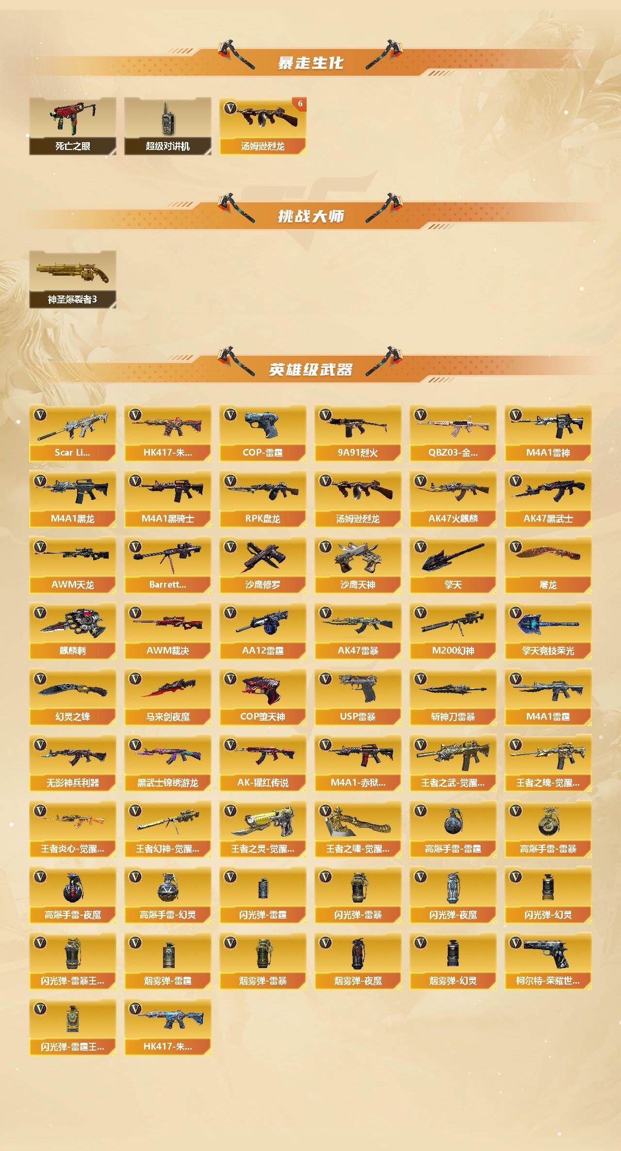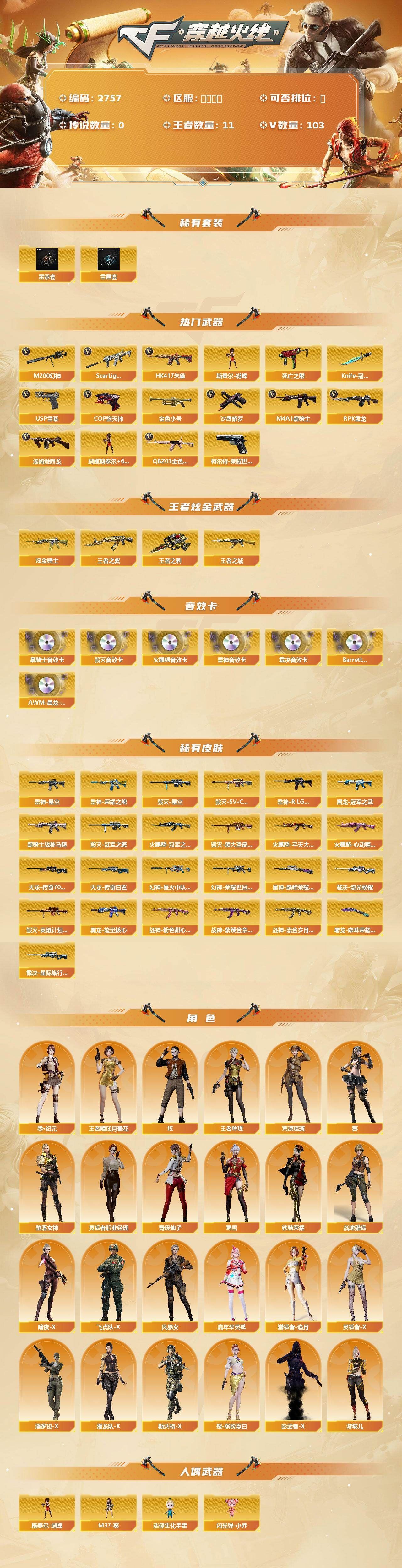 可二次可排位广东一区-103V-11王者武器数-1炫金武器数【热门武器】:QBZ03-金色蔷薇,Scar Light-白虎,HK417-朱雀,M200-幻神,柯尔特-荣耀世冠白鲨2023,死亡之眼,金色小号,M4A1-黑骑士,汤姆逊-烈龙*6,RPK-盘龙,斯泰尔-蝴蝶,USP-雷暴*2,COP-堕天神,沙鹰-修罗*3,Knife-冠军之刃【稀有套装】:雷霆套,雷暴套【王者炫金武器】:王者之城,王者之翼,王者之刺,炫金骑士【音效卡】:AK47-火麒麟音效卡,M4A1-雷神音效卡,M4A1-黑骑士音效卡,Barrett-毁灭音效卡,AWM-裁决音效卡,Barrett-碧霄极光音效卡,AWM-昌龙-怀旧音效卡【皮肤】:幻神-星火小队签名臻藏版 皮肤,幻神-荣耀世冠白鲨2023 皮肤,裁决-流光秘银,裁决-星际旅行 皮肤,星神-巅峰荣耀 皮肤,雷神-荣耀之魄,雷神-星空,雷神-R.LGD-CFPLS18冠军,火麒麟-冠军之心,火麒麟-平天大圣,火麒麟-心动糖果,毁灭-星空,毁灭-冠军之怒,毁灭-SV-CFPLS16冠军,毁灭-黑大圣皮肤,毁灭-英雄计划 皮肤,黑龙-能量核心,黑龙-冠军之武,黑骑士-战神马超,战神-粉色甜心皮肤,战神-紫绶金章皮肤,战神-流金岁月皮肤*2,AWM-天龙-传奇70KG,AWM-天龙-传奇白鲨,屠龙-巅峰荣耀 皮肤【角色】:葵,炫,荒漠琉璃,零·纪元,战地猎狐,王者-瞳-闭月羞花,王者玲珑,堕落女神,暗夜-X,飞虎队-X,风暴女,嘉年华灵狐,猎狐者-追月,灵狐者-X,四防灵狐者-职业经理,潘多拉-X,潜龙队-X,青霞仙子,斯沃特-X,蜀雪,铁骑荣耀,樱-缤纷夏日,影武者-X,游珑儿【人偶武器】:斯泰尔-蝴蝶,M37-葵,迷你生化手雷,闪光弹-小乔【暴走生化】:死亡之眼,超级对讲机【挑战大师】:神圣爆裂者III【英雄级武器】:AK47-火麒麟*2,M4A1-黑龙,M4A1-雷神,M4A1-黑骑士,AK47-黑武士*2,M4A1-雷霆,AK47-雷暴,HK417-朱雀,Scar Light-白虎,无影-神兵利器,黑武士-锦绣游龙,QBZ03-金色蔷薇,9A91-烈火,王者之武-觉醒版,王者之魄-觉醒版,AK-47-猩红传说,王者炎心-觉醒版,HK417-朱雀-电竞之星,AWM-天龙,Barrett-毁灭,AWM-裁决,M200-幻神,王者幻神-觉醒版,RPK-盘龙,汤姆逊-烈龙*6,AA-12-雷霆,沙鹰-修罗*3,沙鹰-天神*2,USP-雷暴*2,COP-雷霆,COP-堕天神,【道具】:AG战队炫彩背包,EP战队炫彩背包,亚洲杯纪念炫彩背包,炫彩背包,背包-洛丽塔,超级背包,女皇终结者-魔龙之吻,救世主-黑桃战神,绿色巨人,灵魂忍者,迷雾幽灵,生化弹匣,夺命之镰,防化服*3,防弹头盔*6,防弹衣*5,C4工具钳*5,手雷包*4【特殊枪械】:蝴蝶斯泰尔+6烈龙,1白虎,1黑骑士,6烈龙,1盘龙,1蝴蝶斯泰尔,各种道具详情看截图、低价出售找回包 赔、截图展示段位不代 表实际段位,如赛季更新等不可抗拒因素发生变化、时限道具不保证所剩时间、标题未写送点劵默认不送【卖号买号首选亿梦】